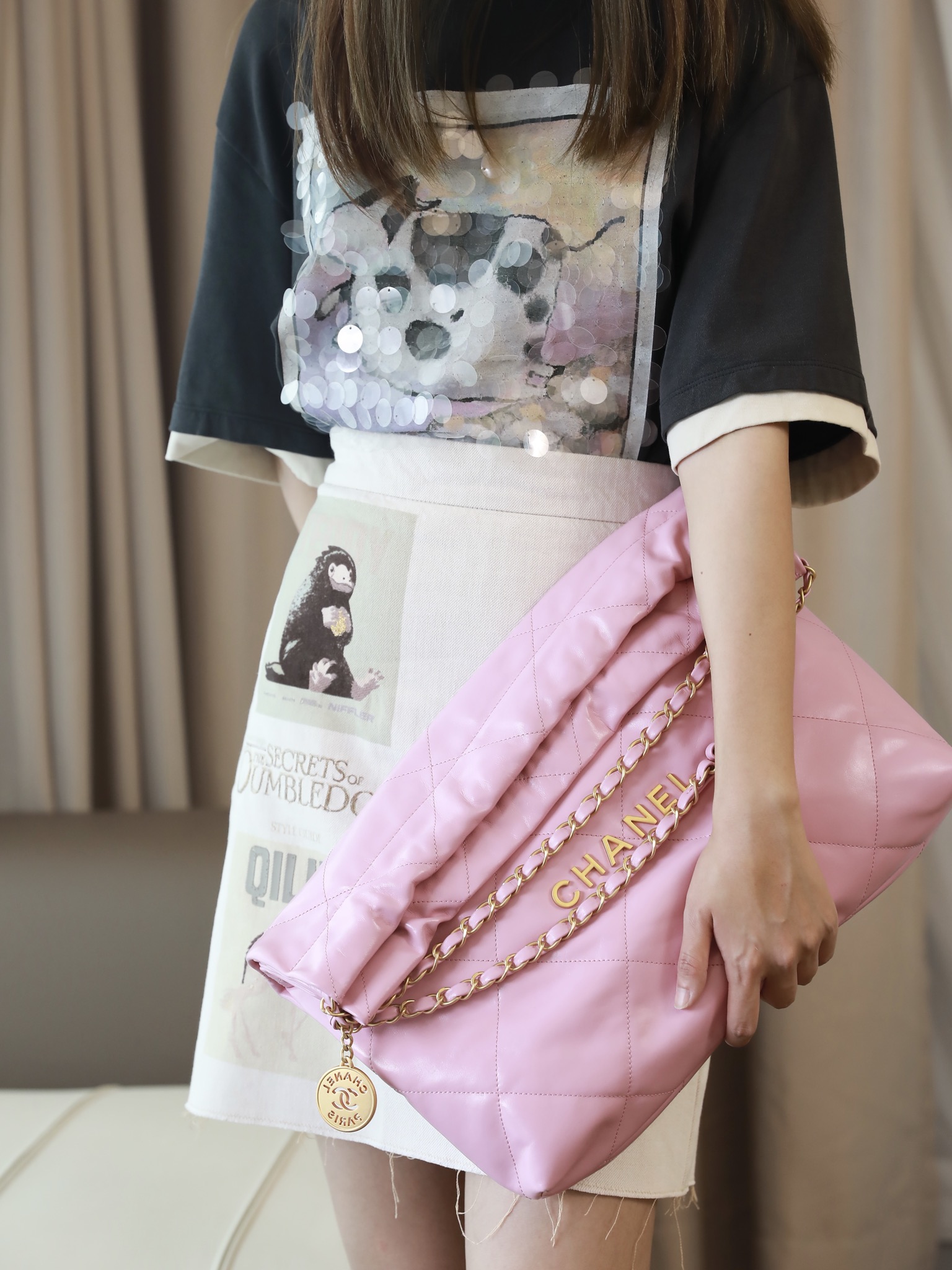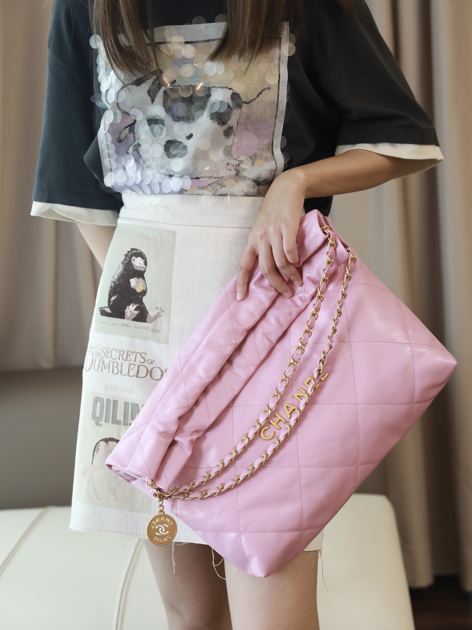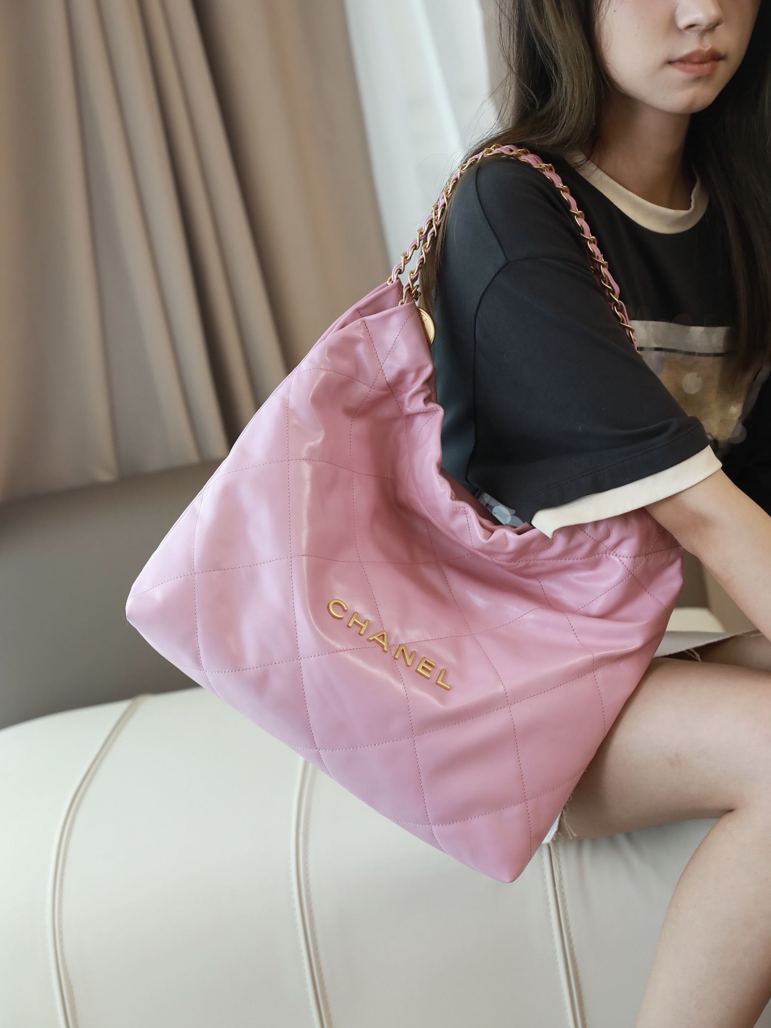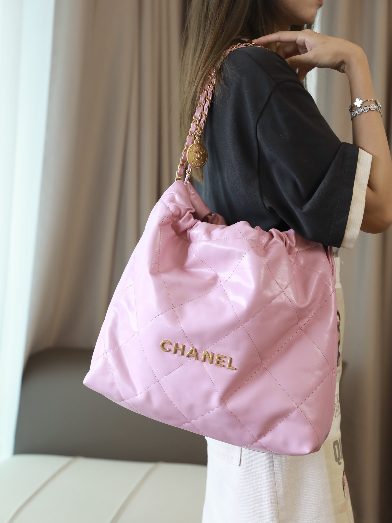 • CHANEL 22 Handbag Shiny Calfskin & Gold-Tone Metal pink