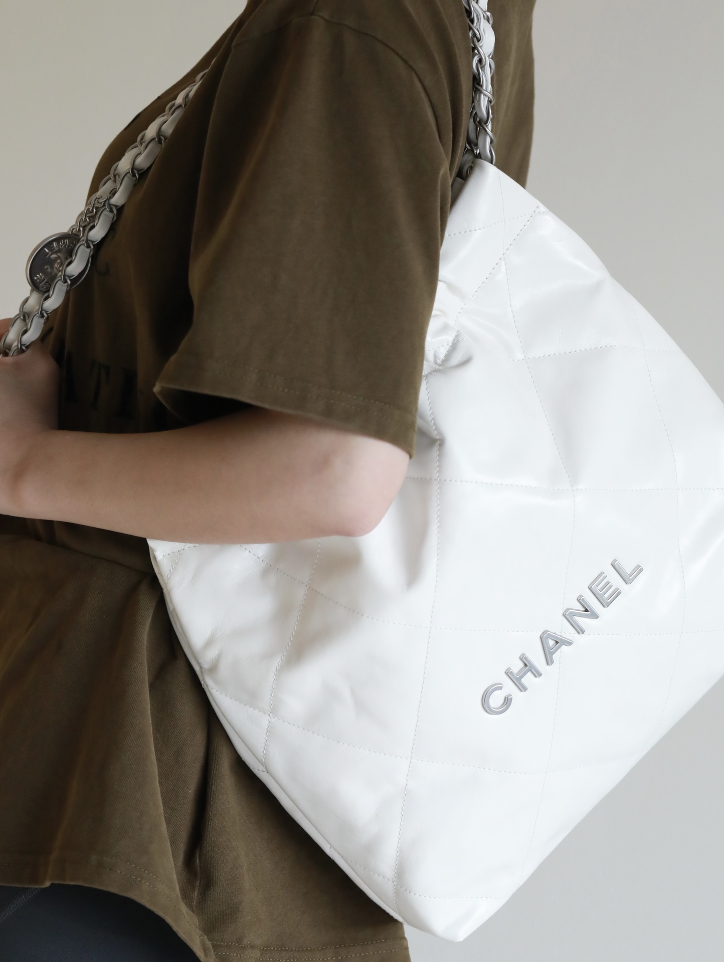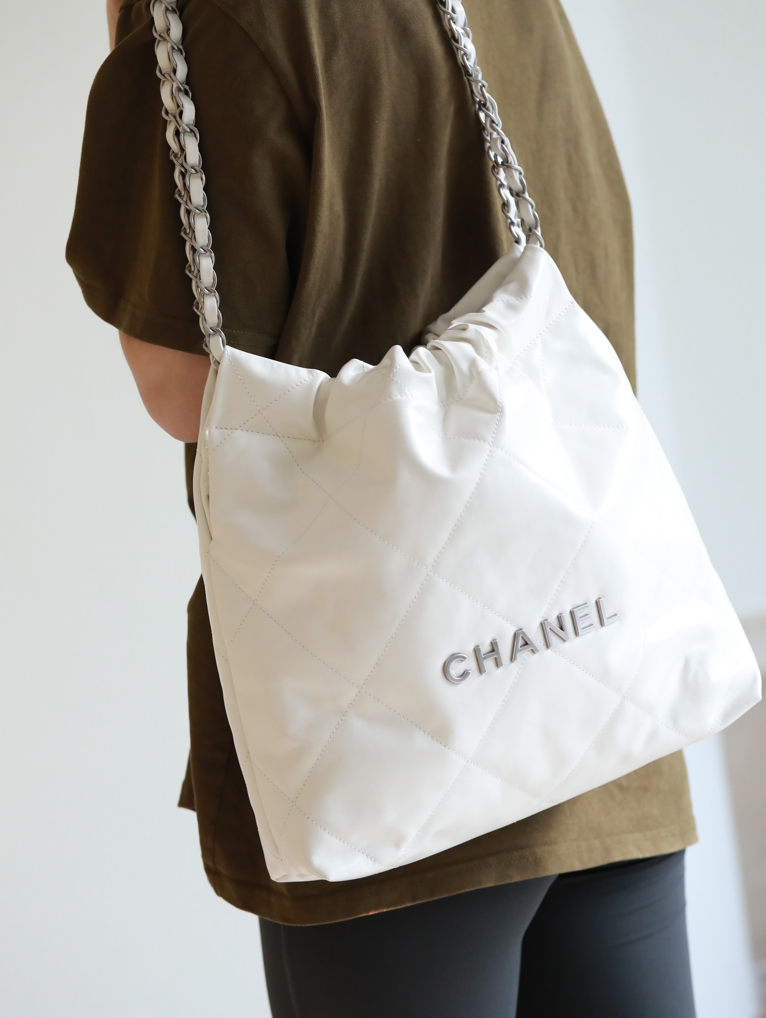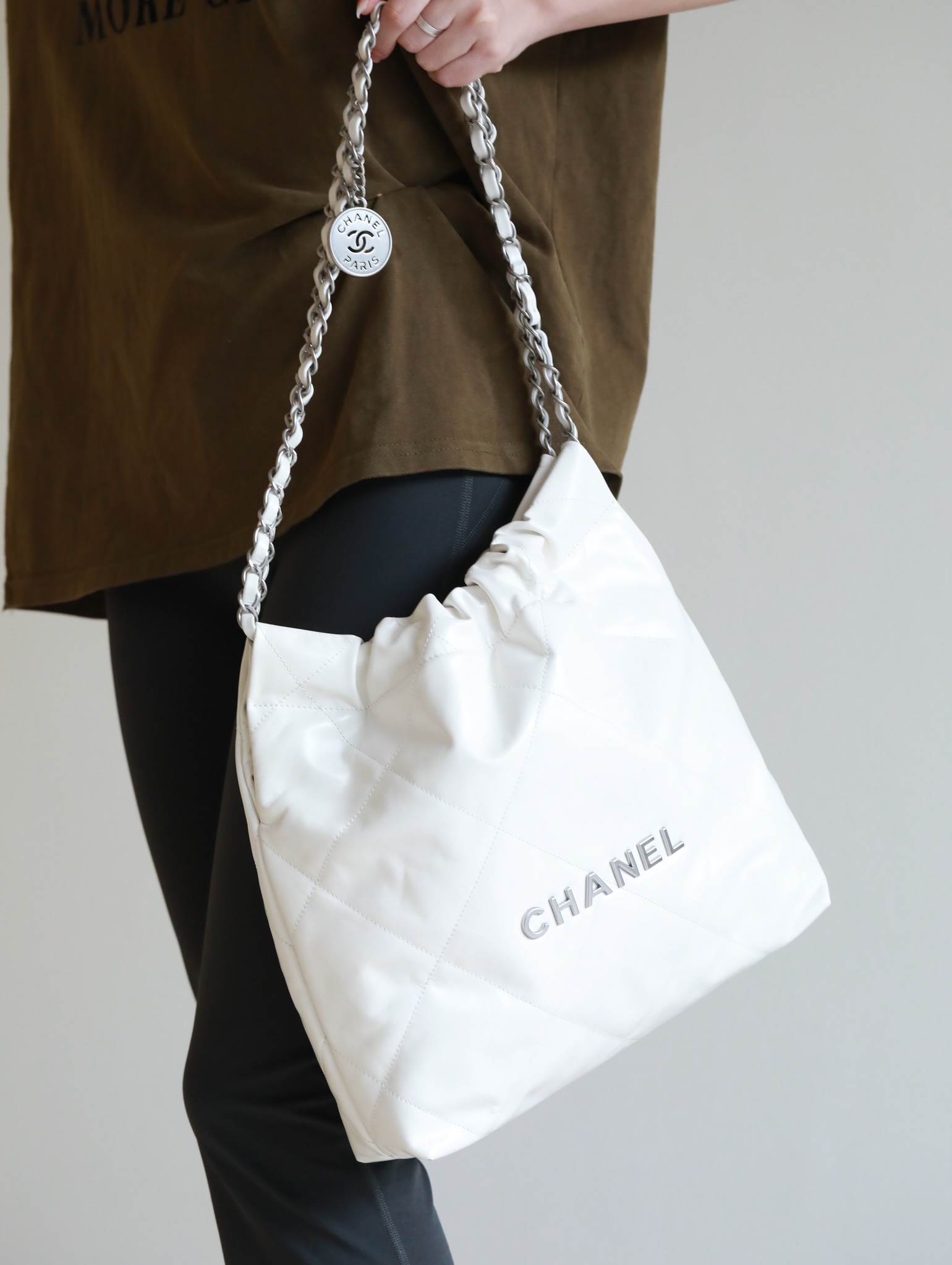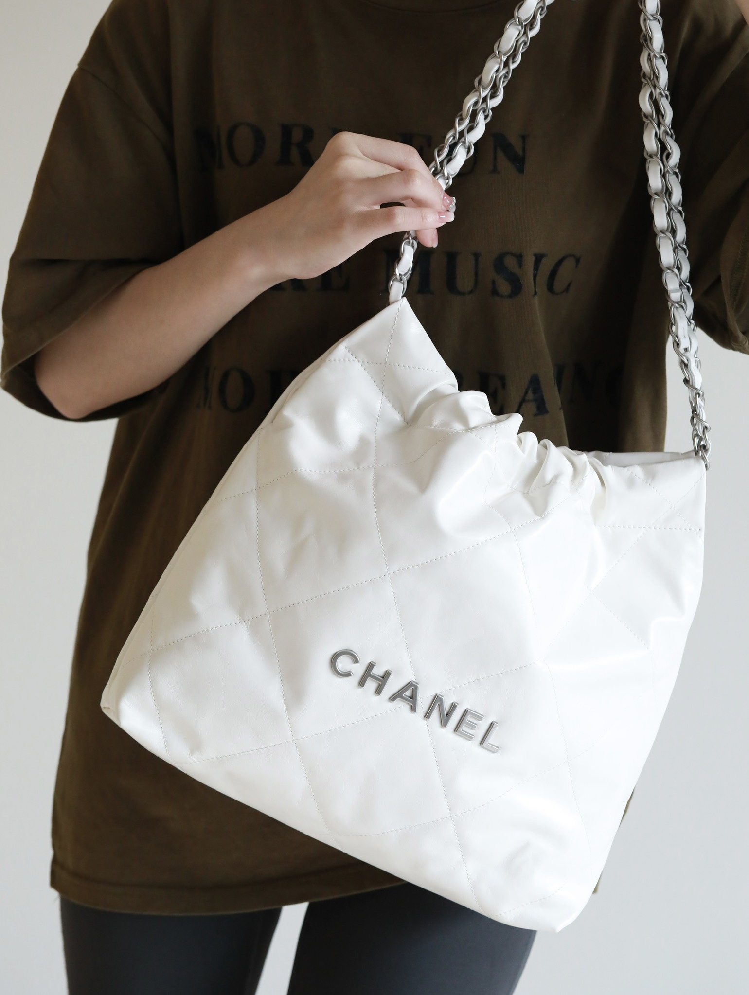 CHANEL 22 Handbag Shiny Calfskin & silver buckle Metal White
