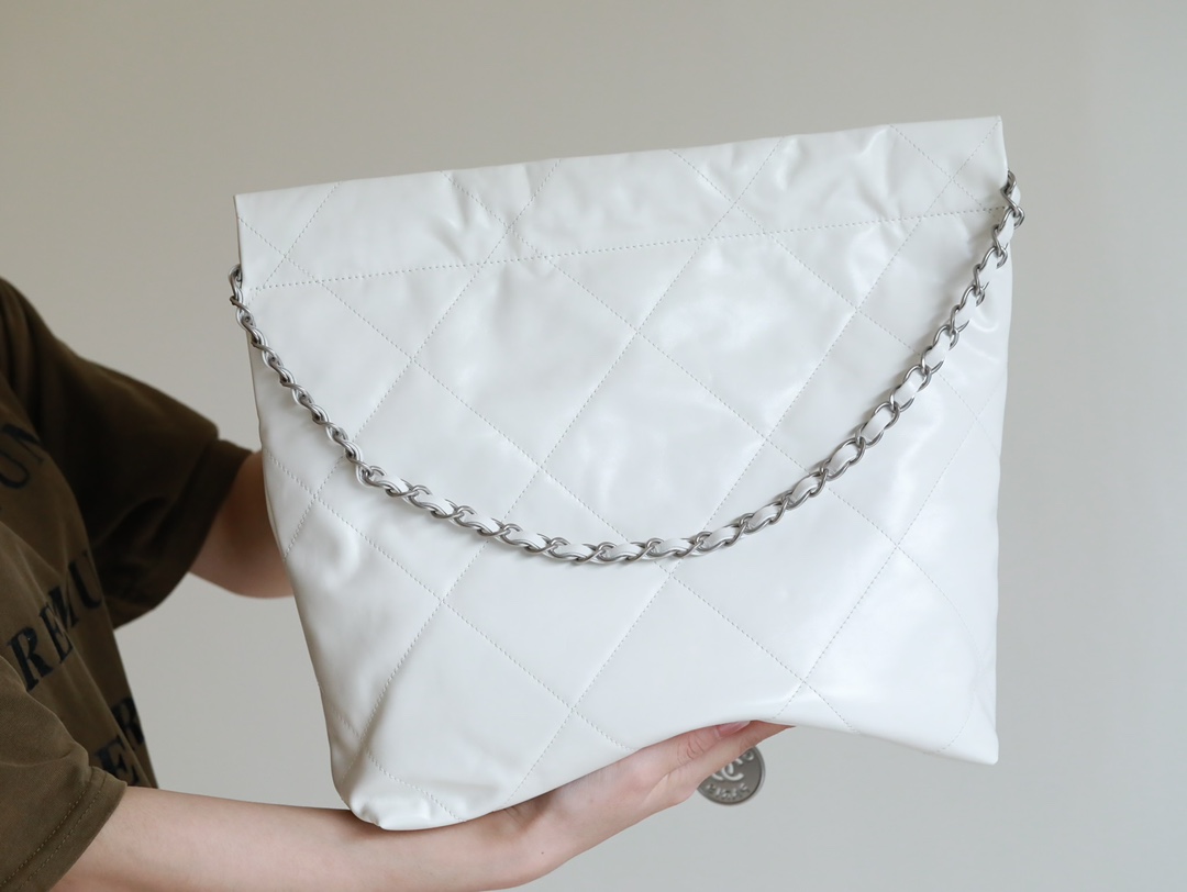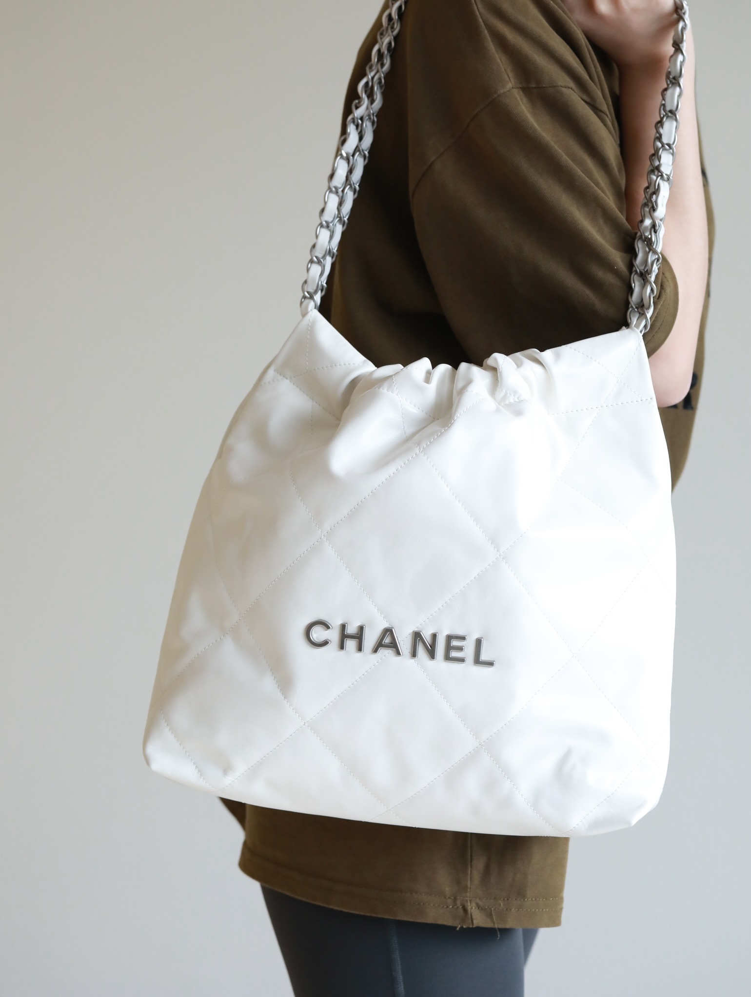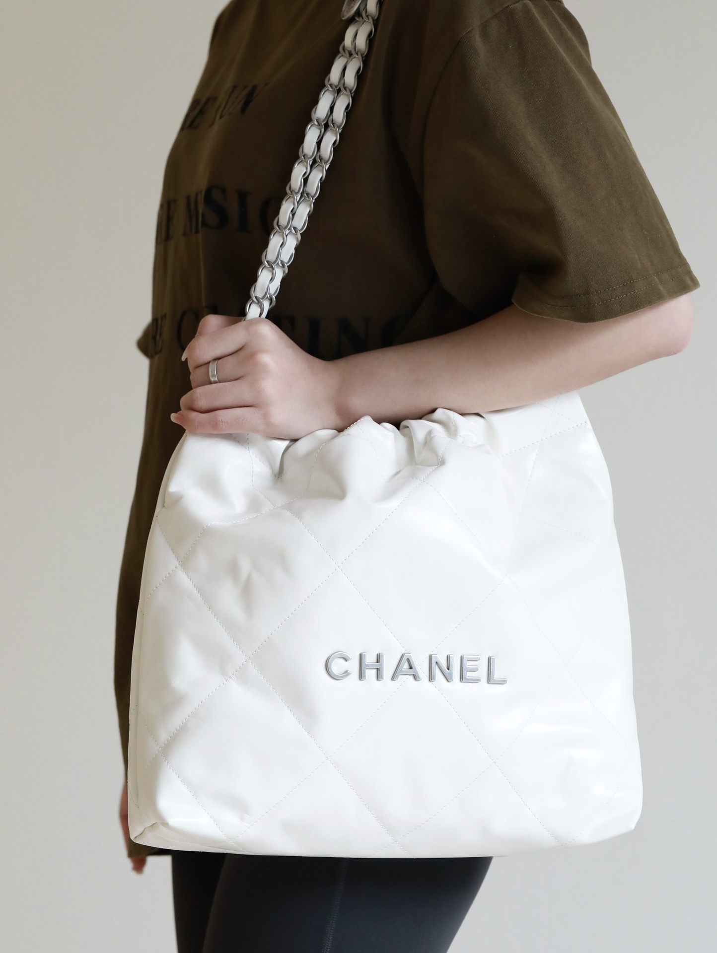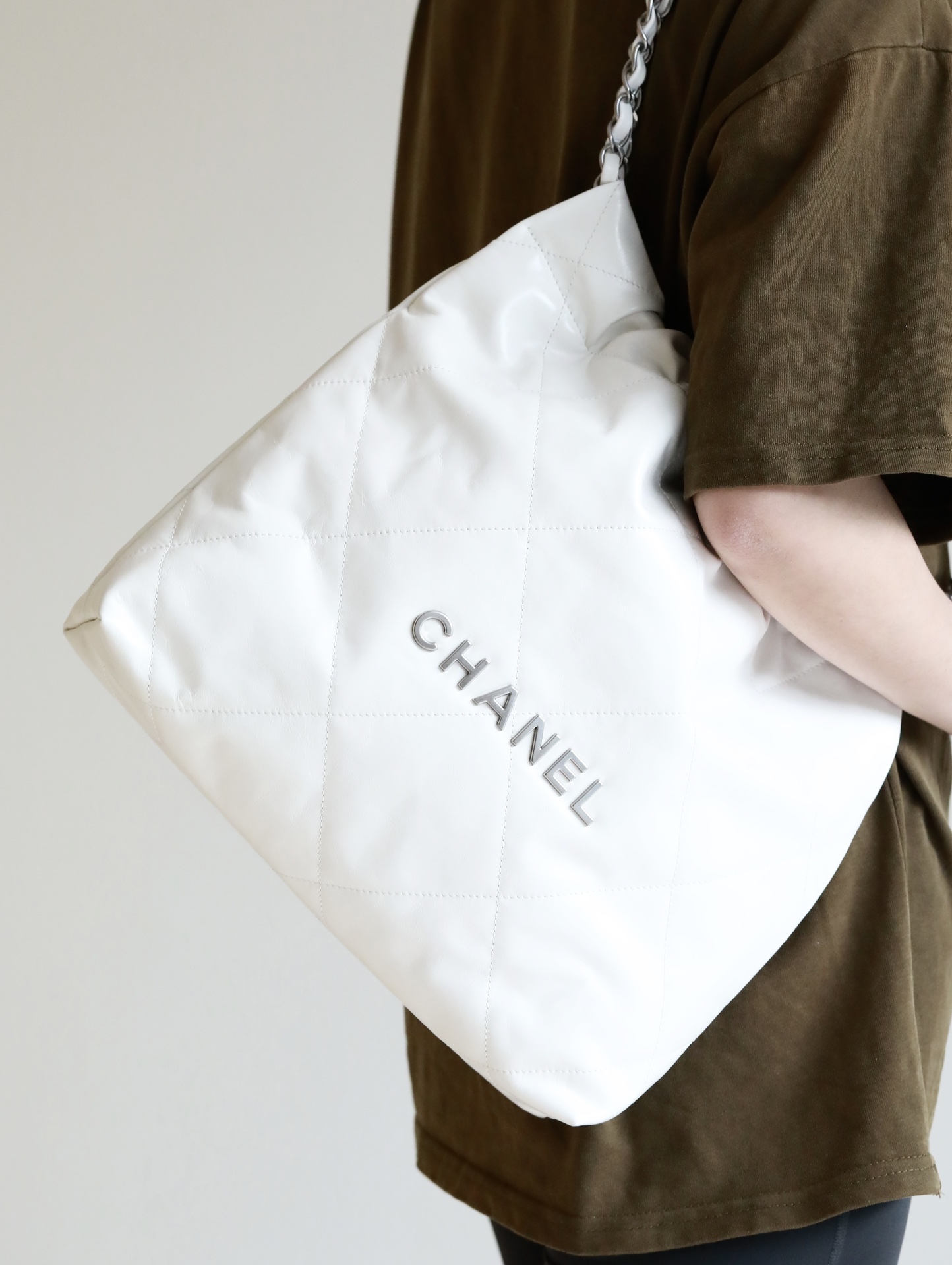 CHANEL 22 Handbag Shiny Calfskin & silver buckle Metal White