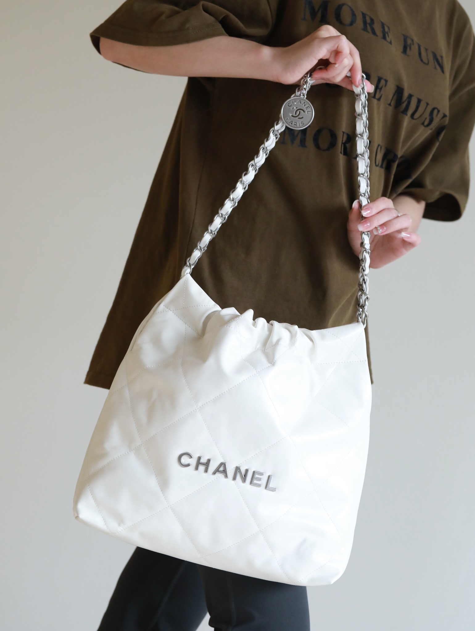 • CHANEL 22 Handbag Shiny Calfskin & silver buckle Metal White