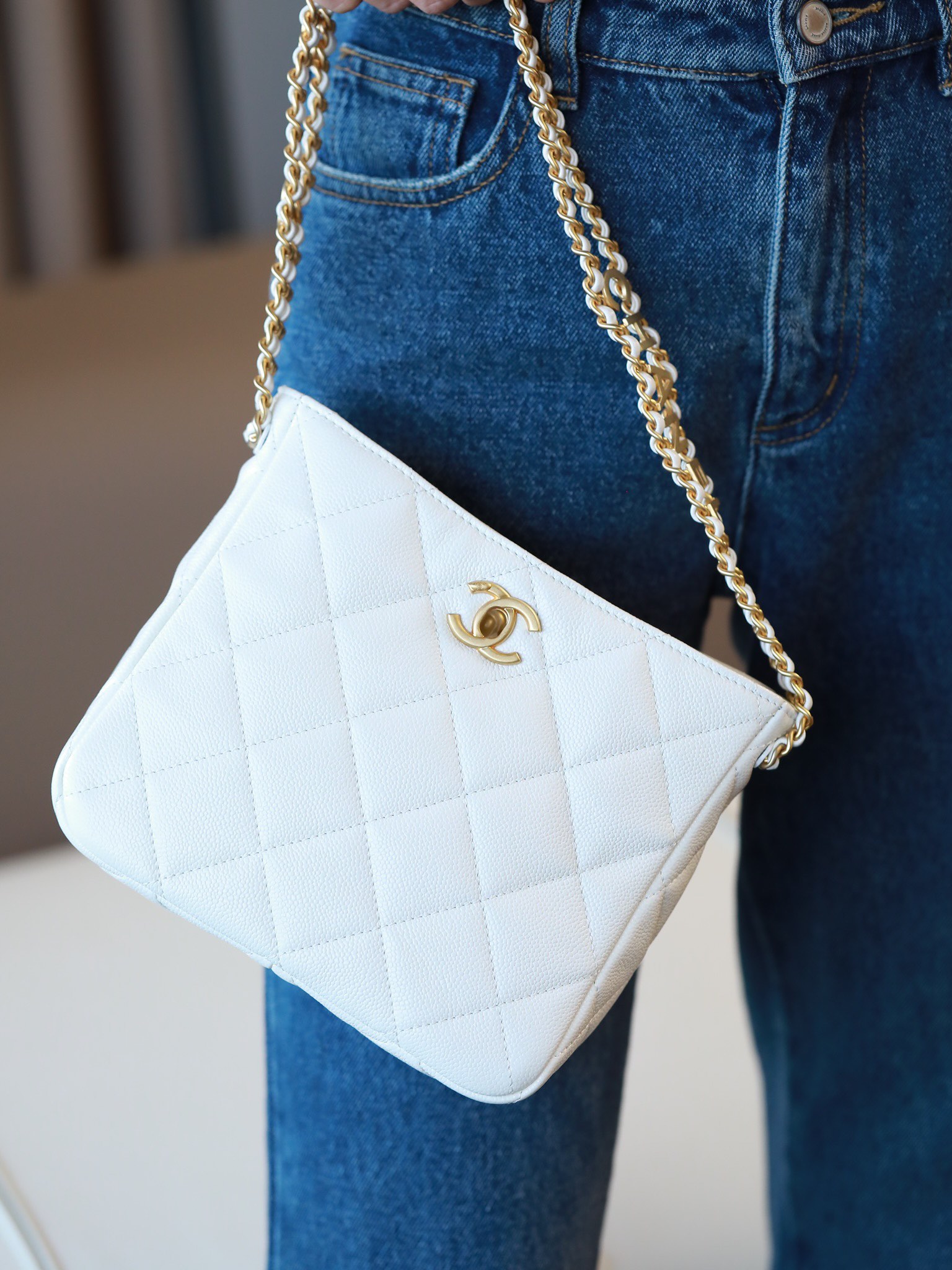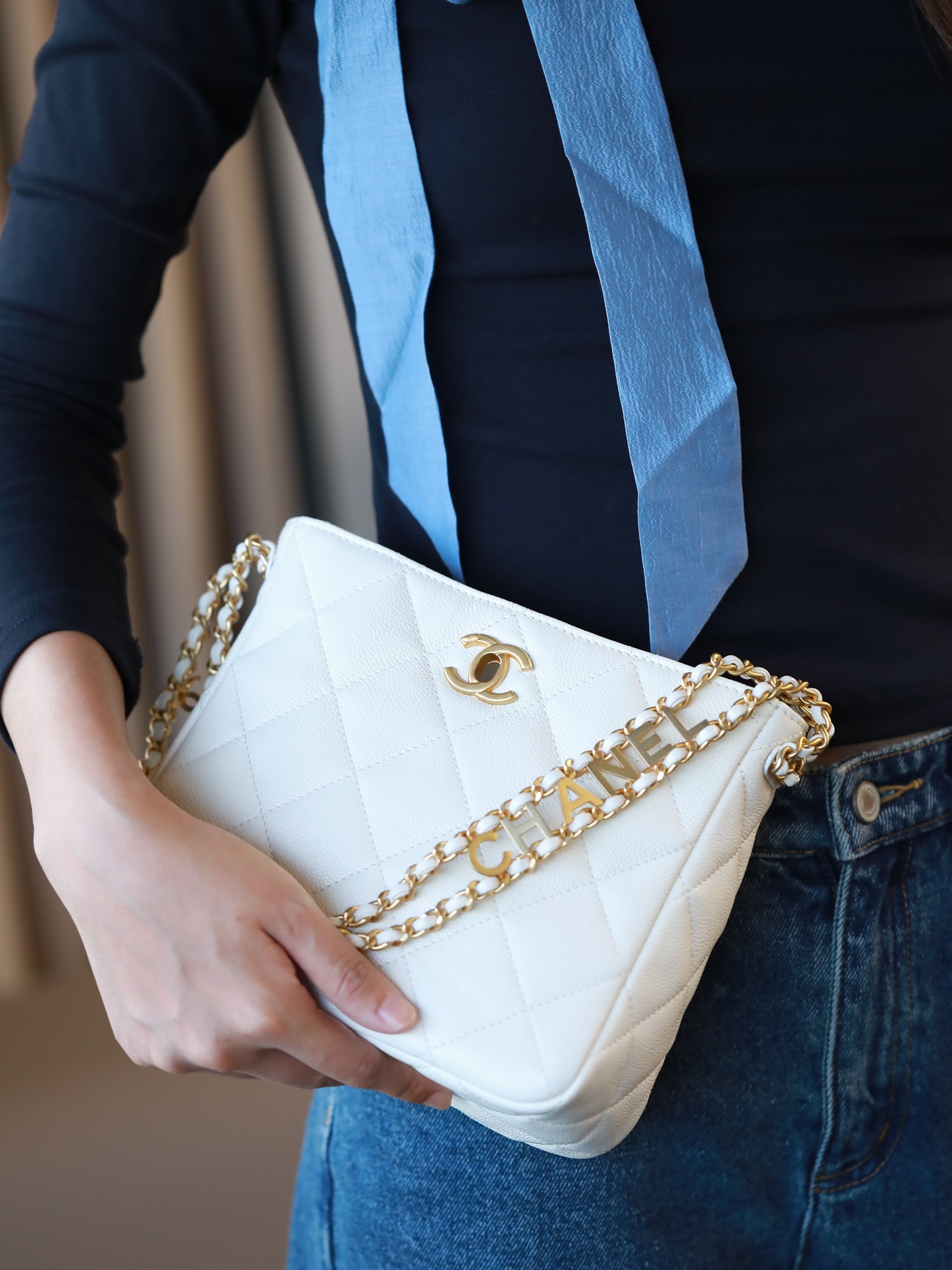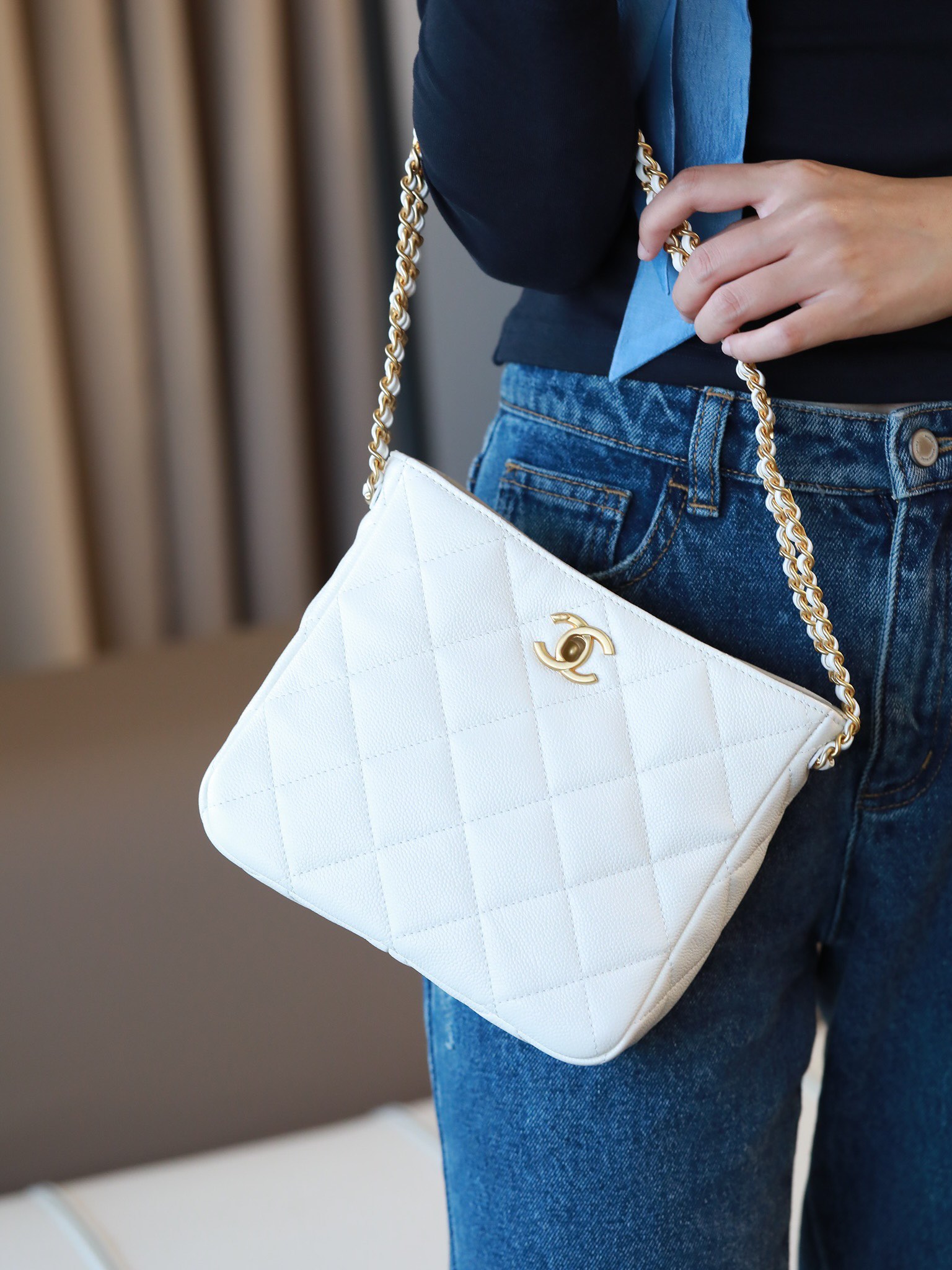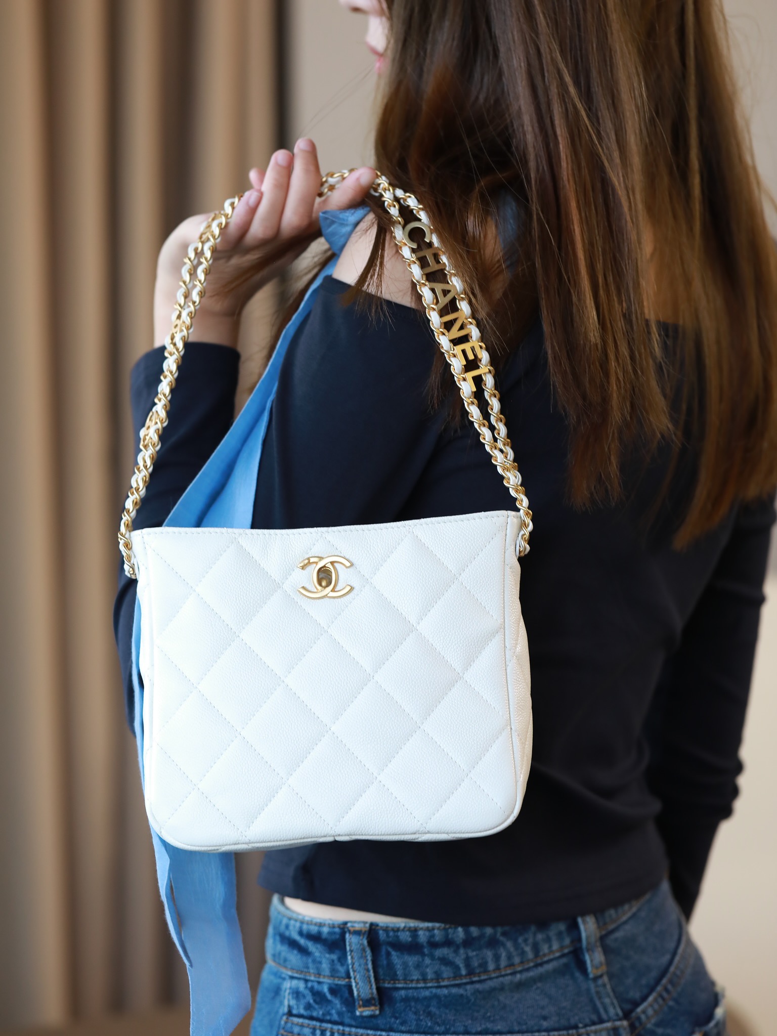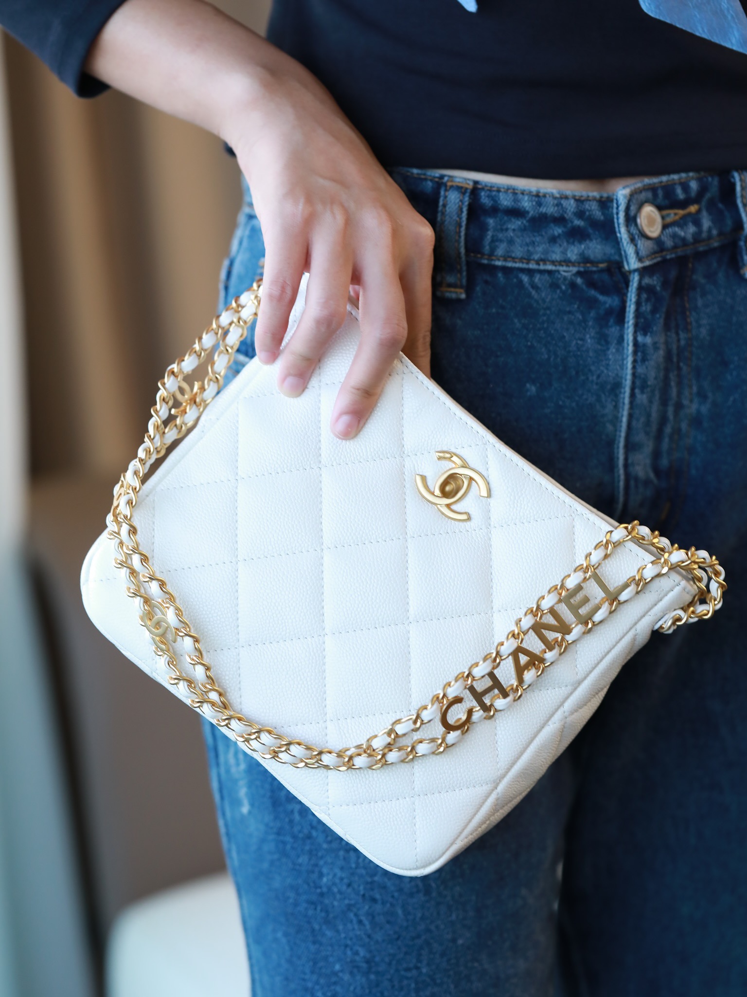 • CHANEL 22S Pearl Crush Hobo Bag Shiny Calfskin White GHW