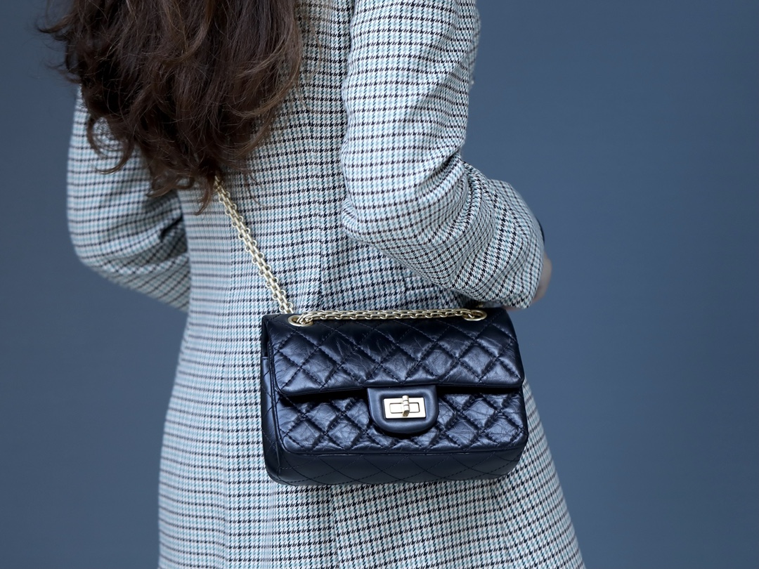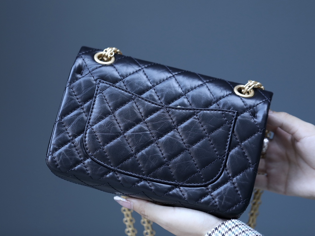• CHANEL Black Quilted Aged Calfskin Mini 2.55 Reissue 225 Single Flap Brushed Gold Hardware