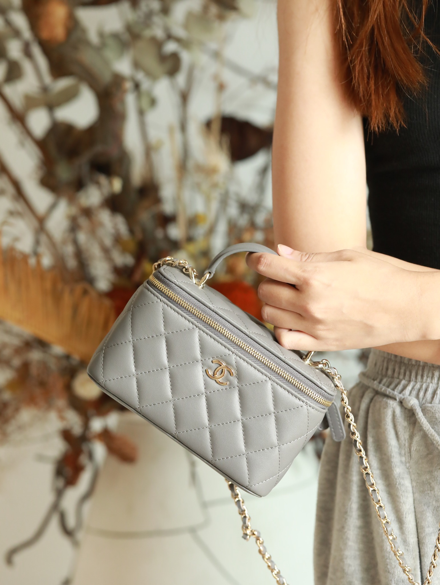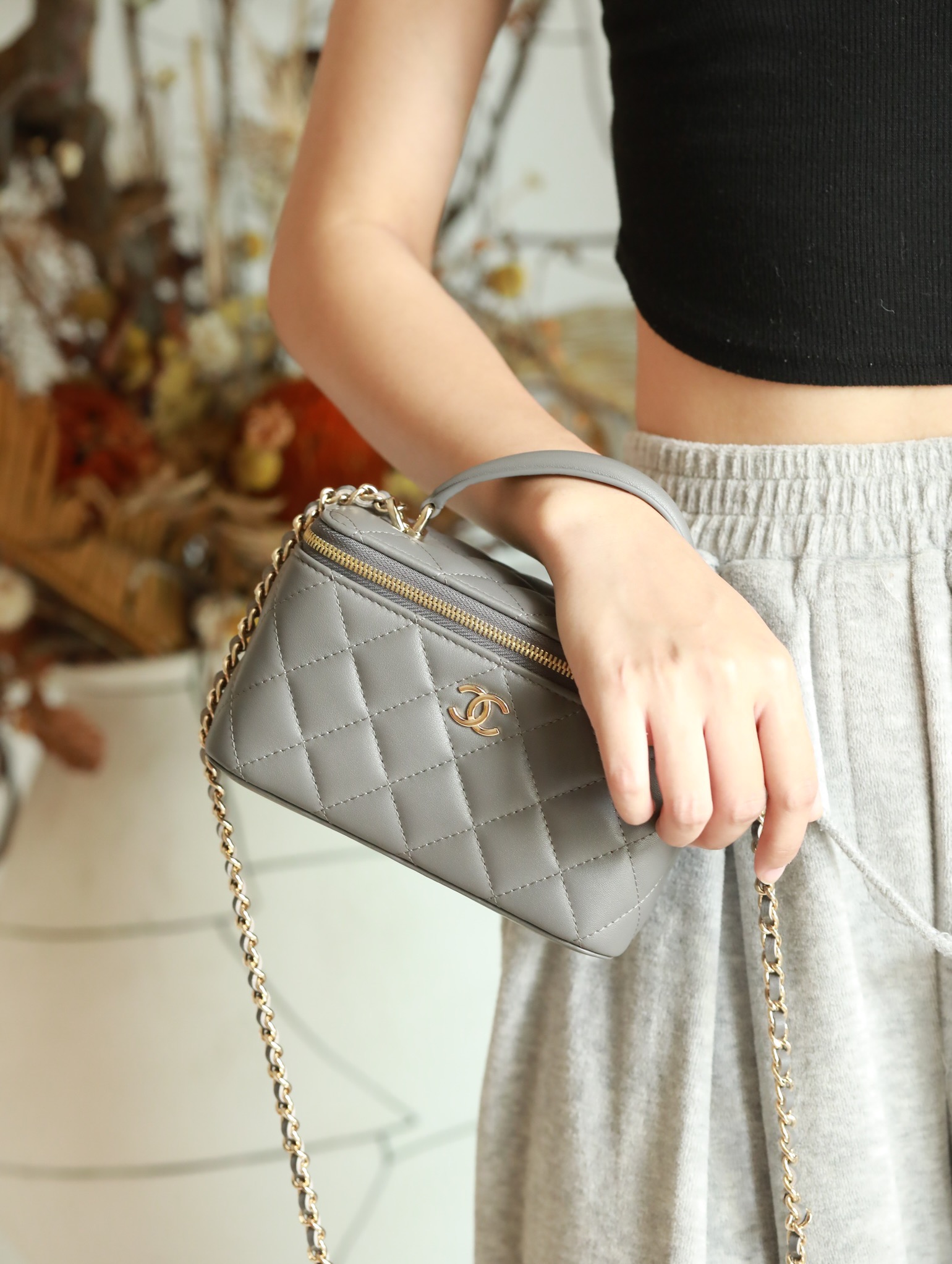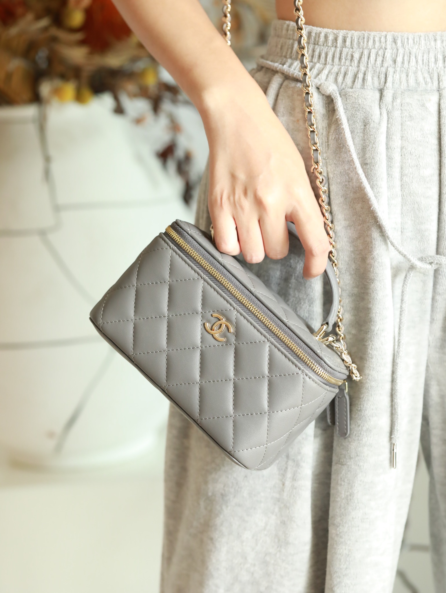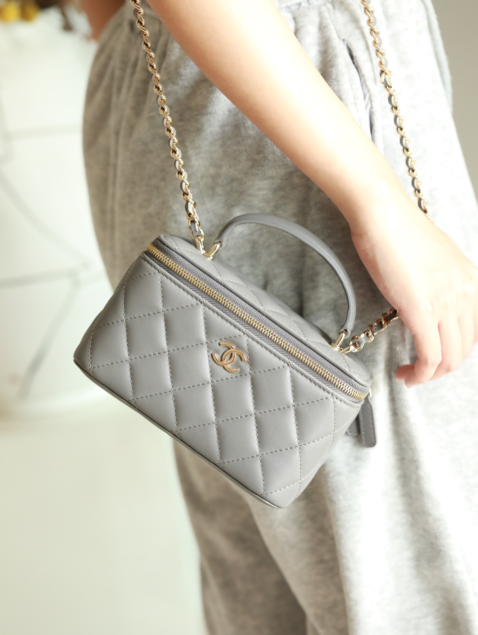 CHANEL Classic long box Vanity Case beige gray Lambskin Gold Hardware