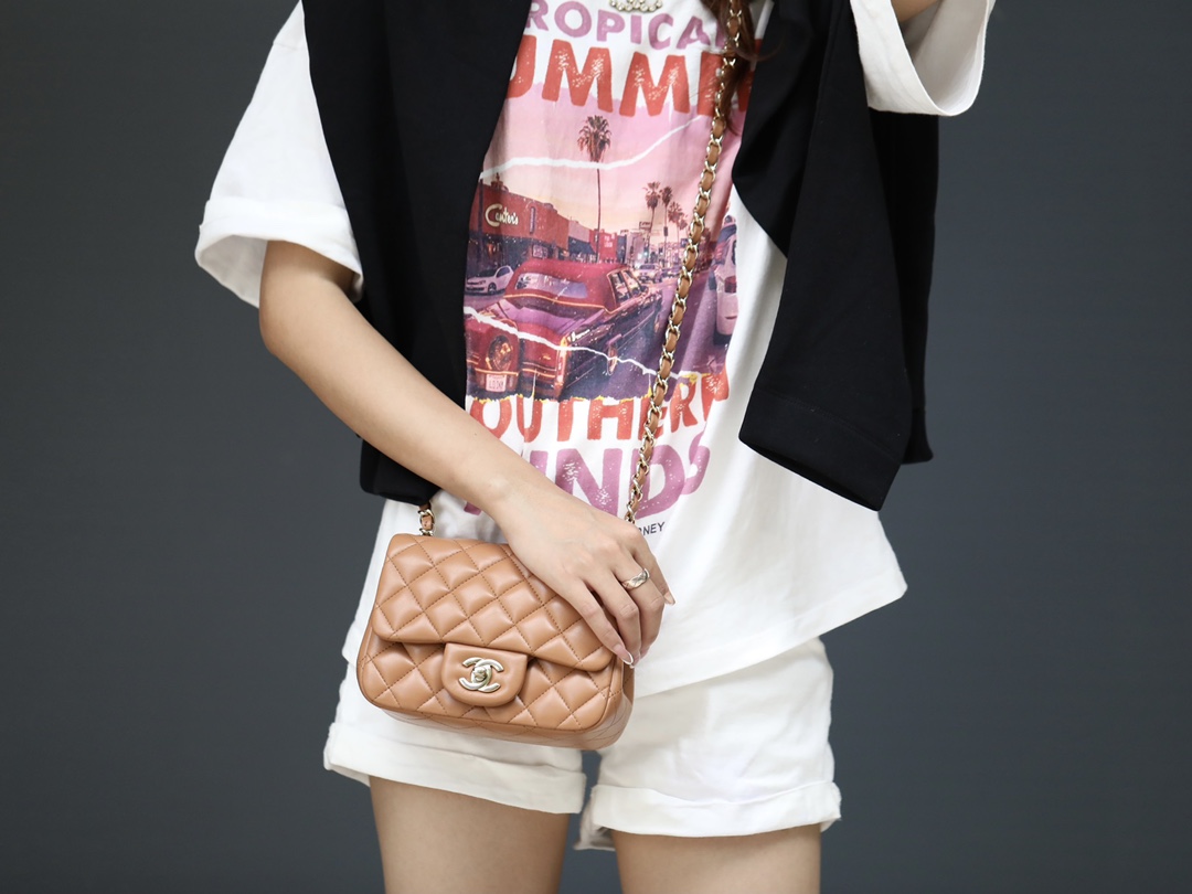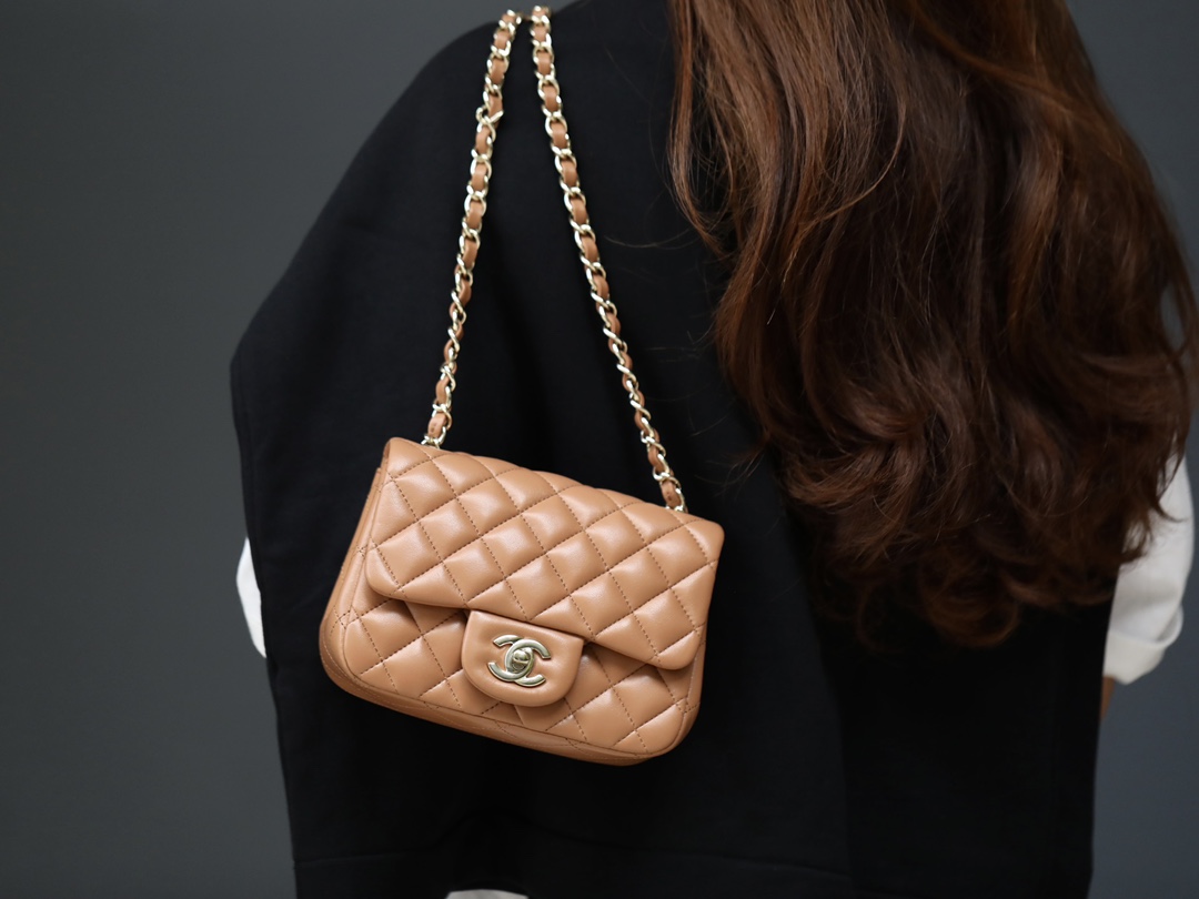 • CHANEL Classic Mini Square, Caramel Lambskin with Gold Hardware