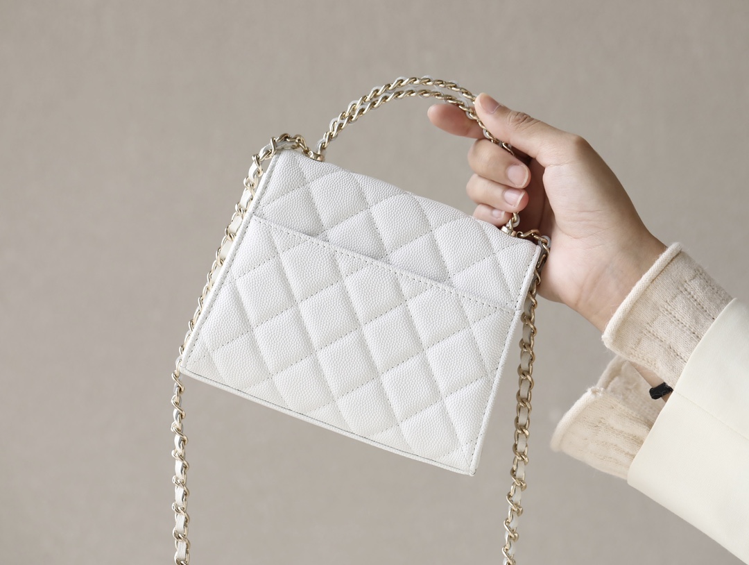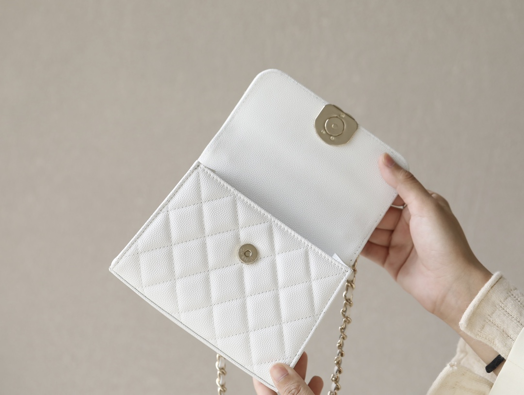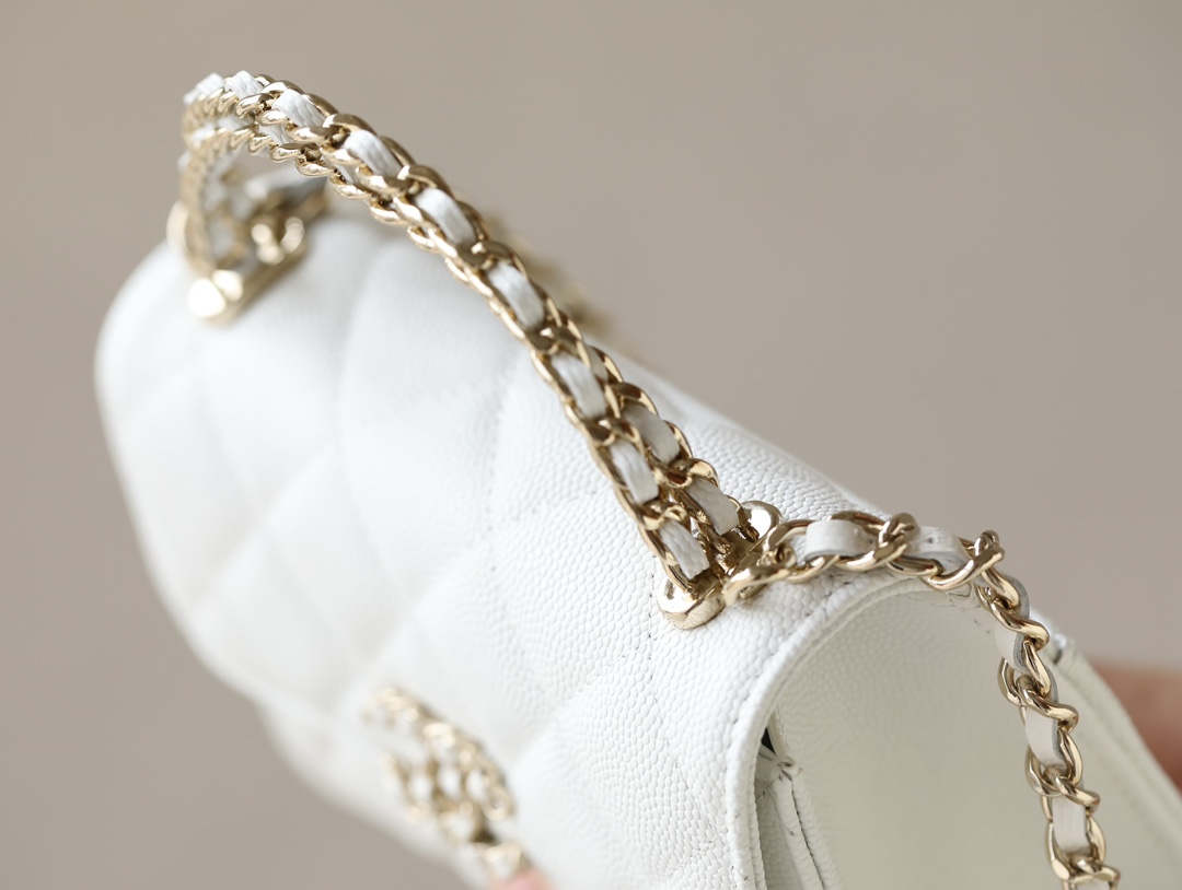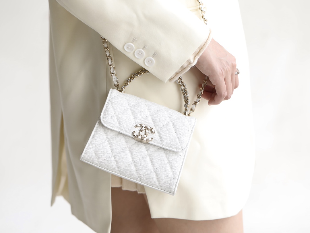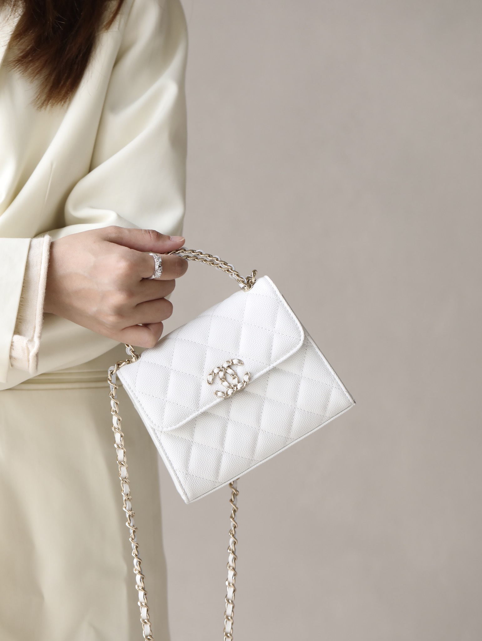 • CHANEL Clutch with Chain Grained Shiny Calfskin & Gold-Tone Metal White