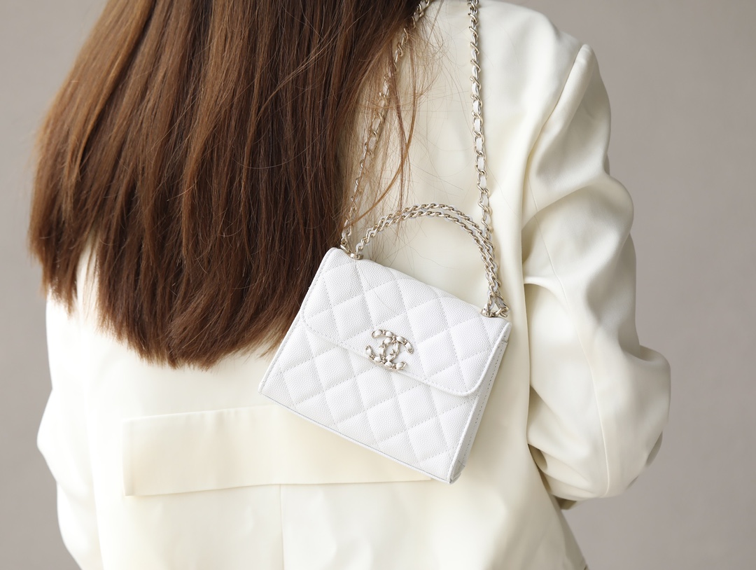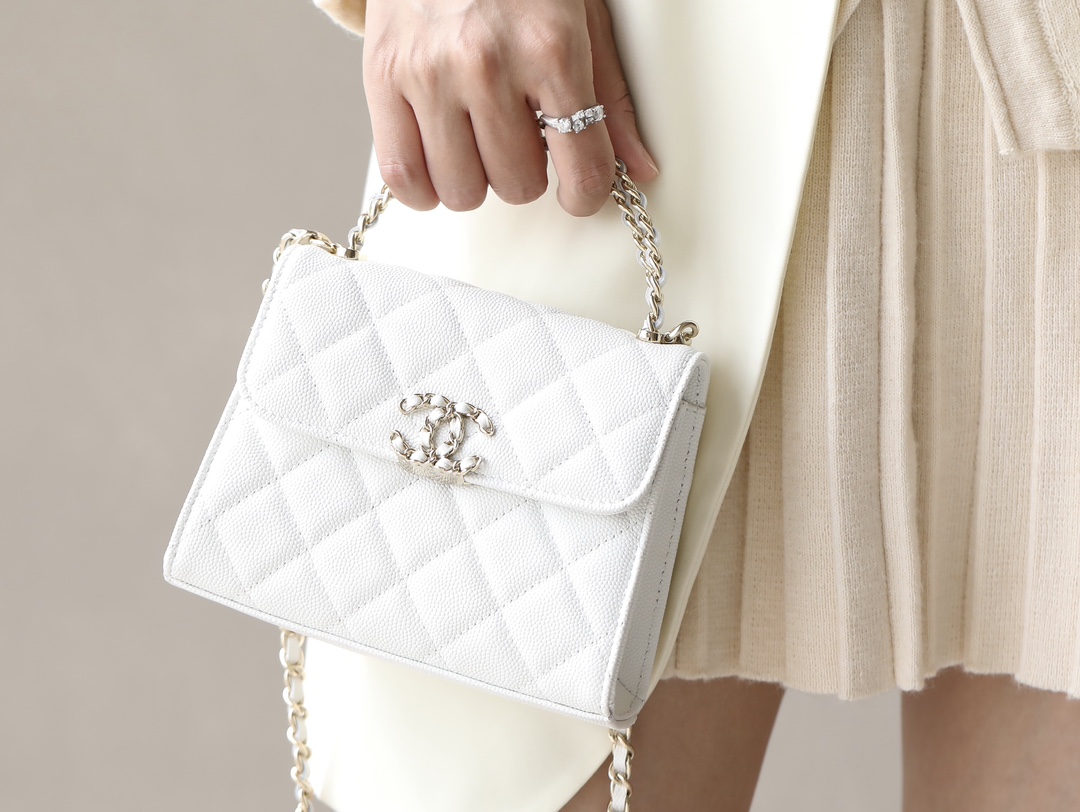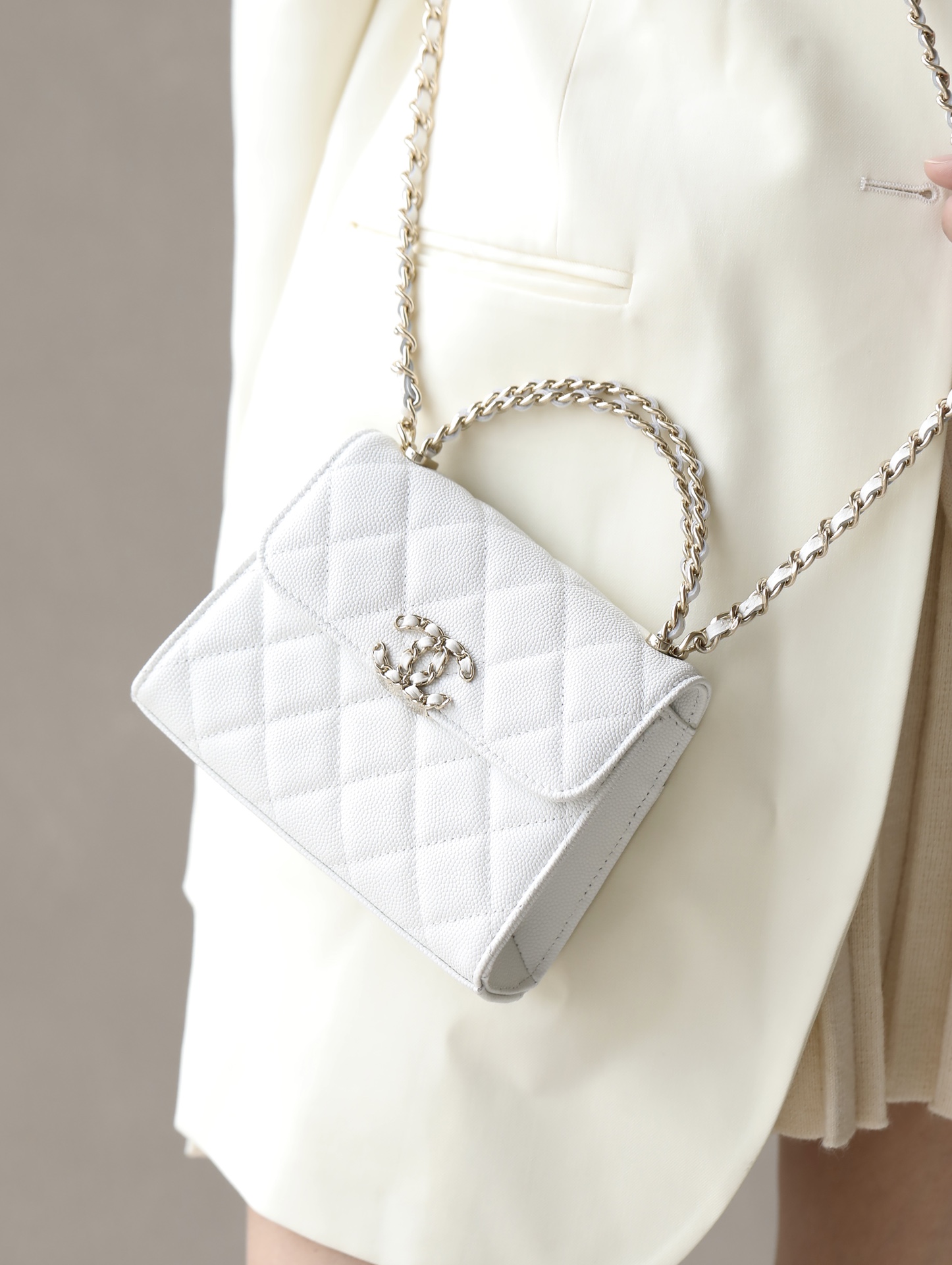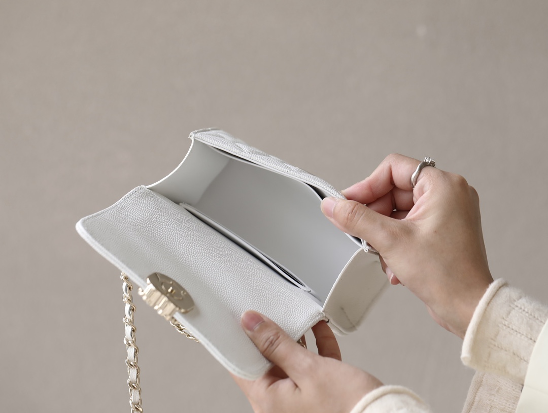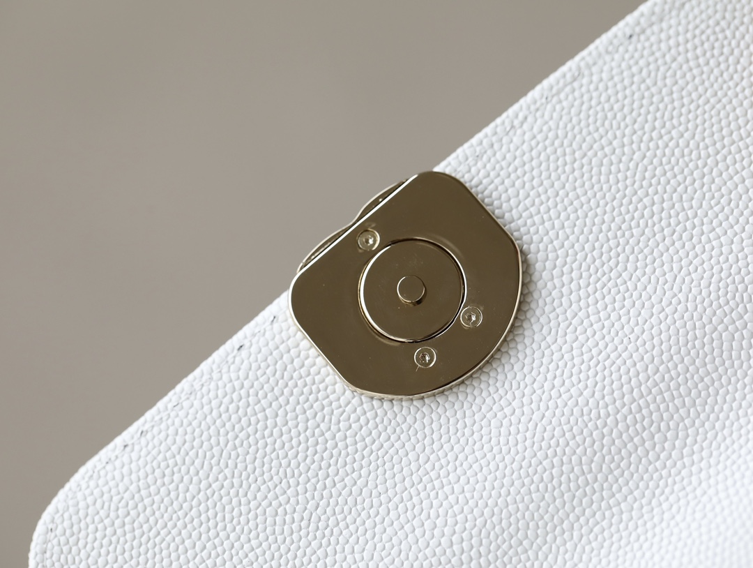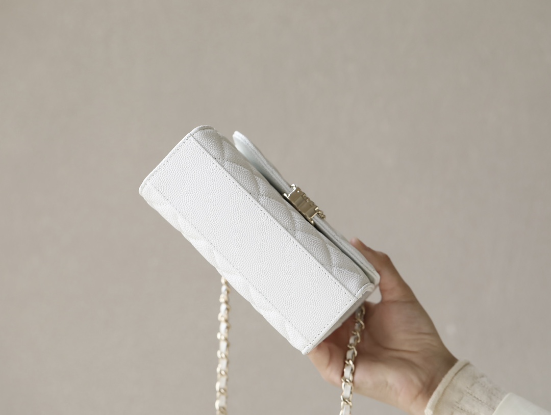 • CHANEL Clutch with Chain Grained Shiny Calfskin & Gold-Tone Metal White