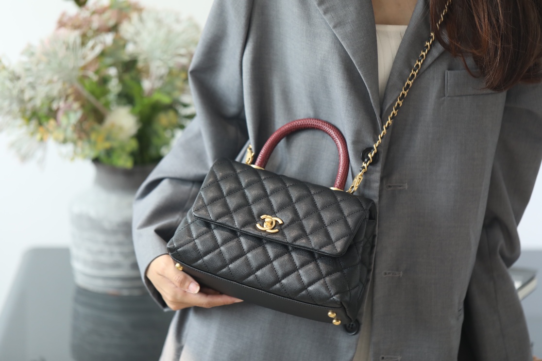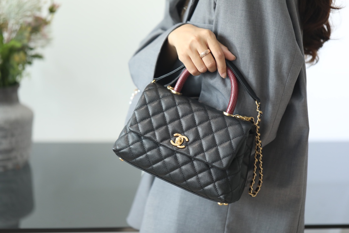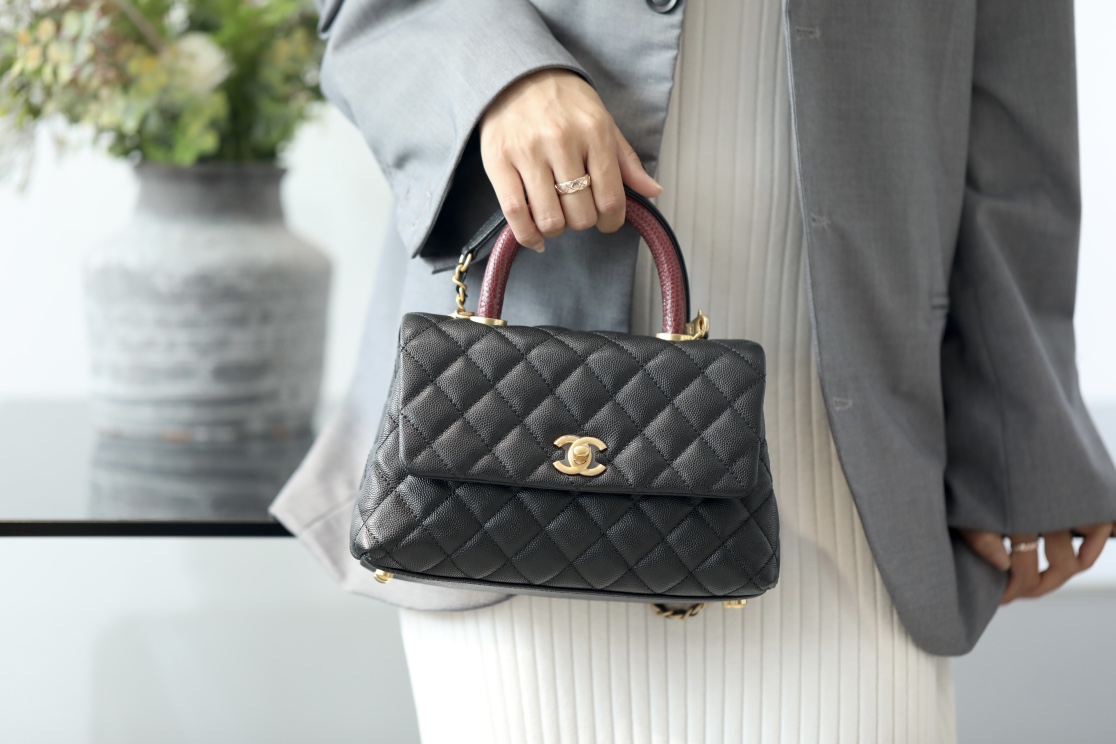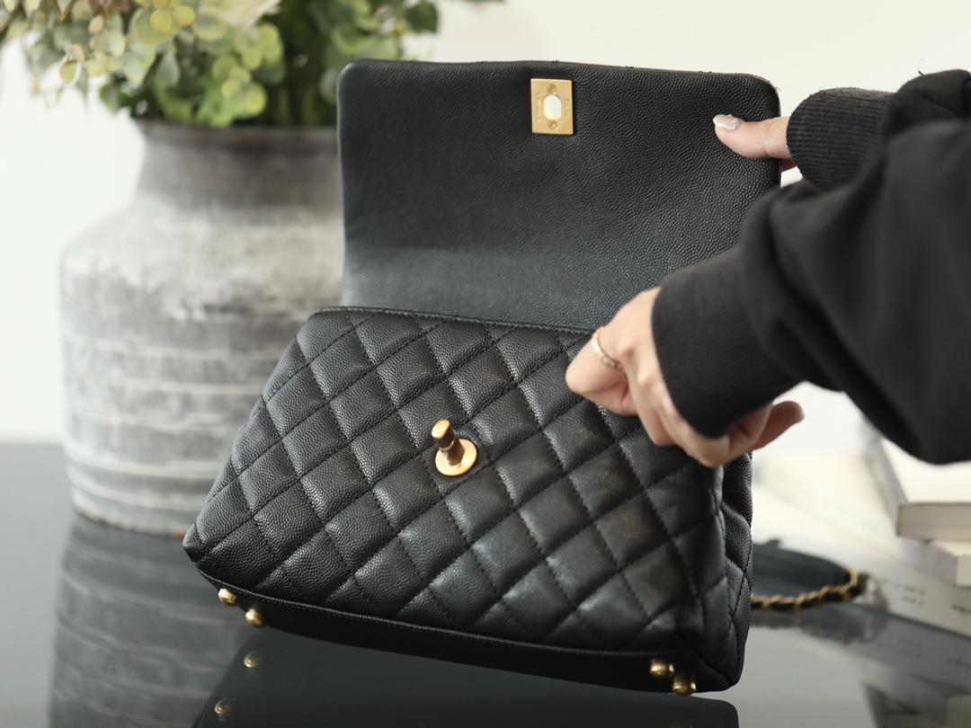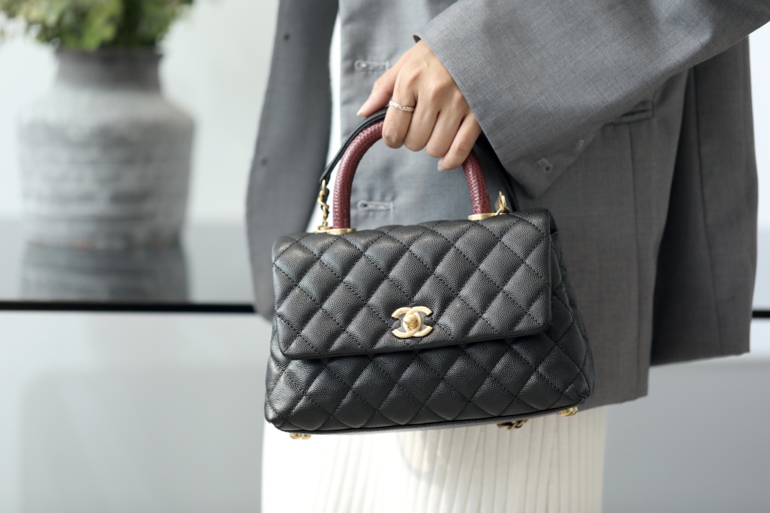 • CHANEL Coco lizard Handle Flap Quilted Caviar Gold-tone small Black