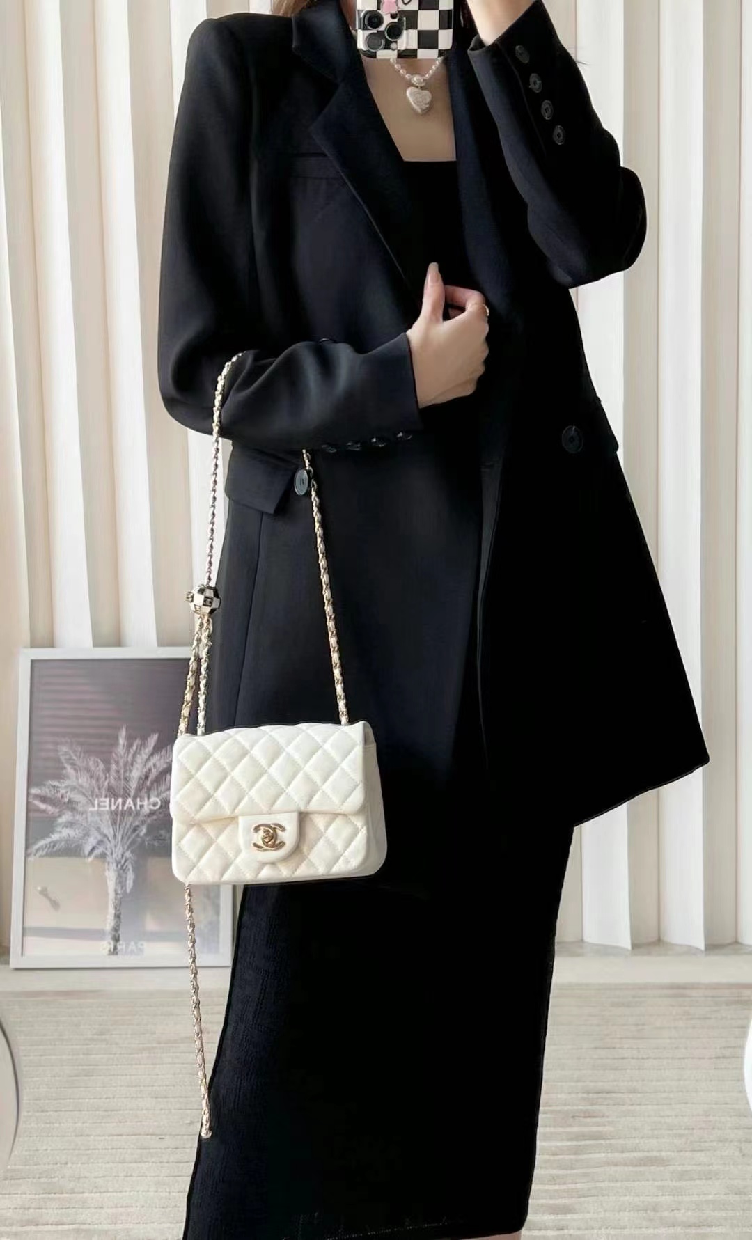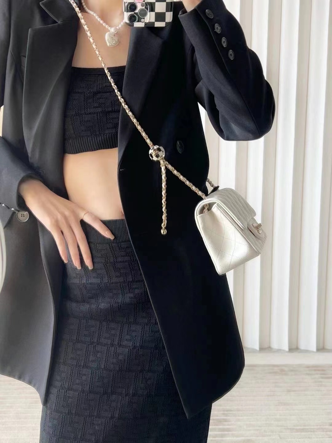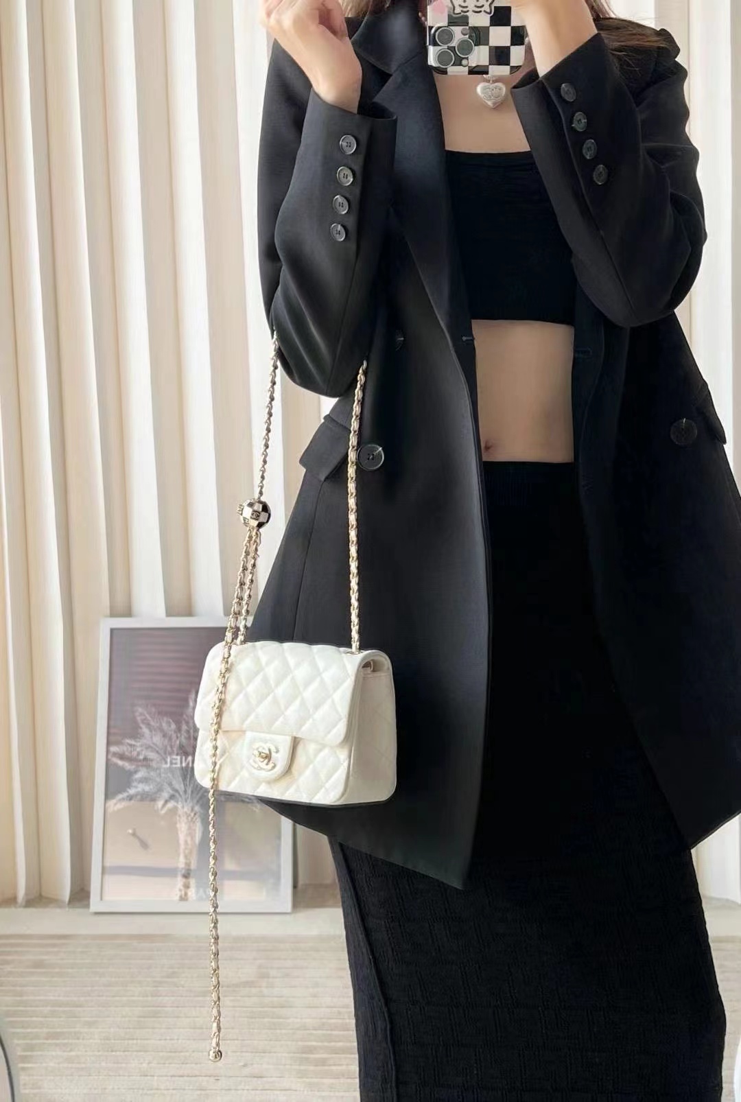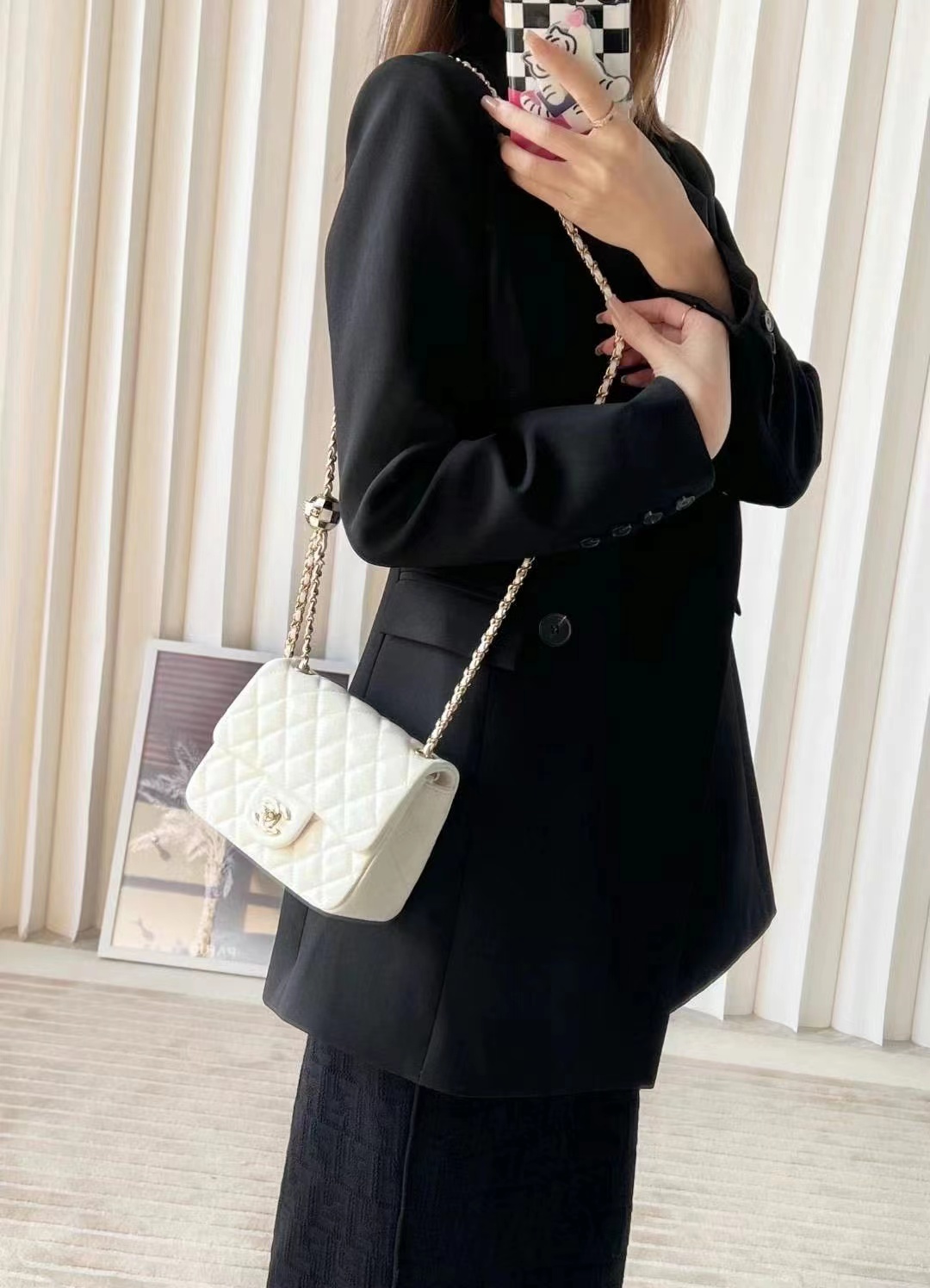 Chanel Fatty Fang Enamel black grid ball Shoulder Bags White gold buckle