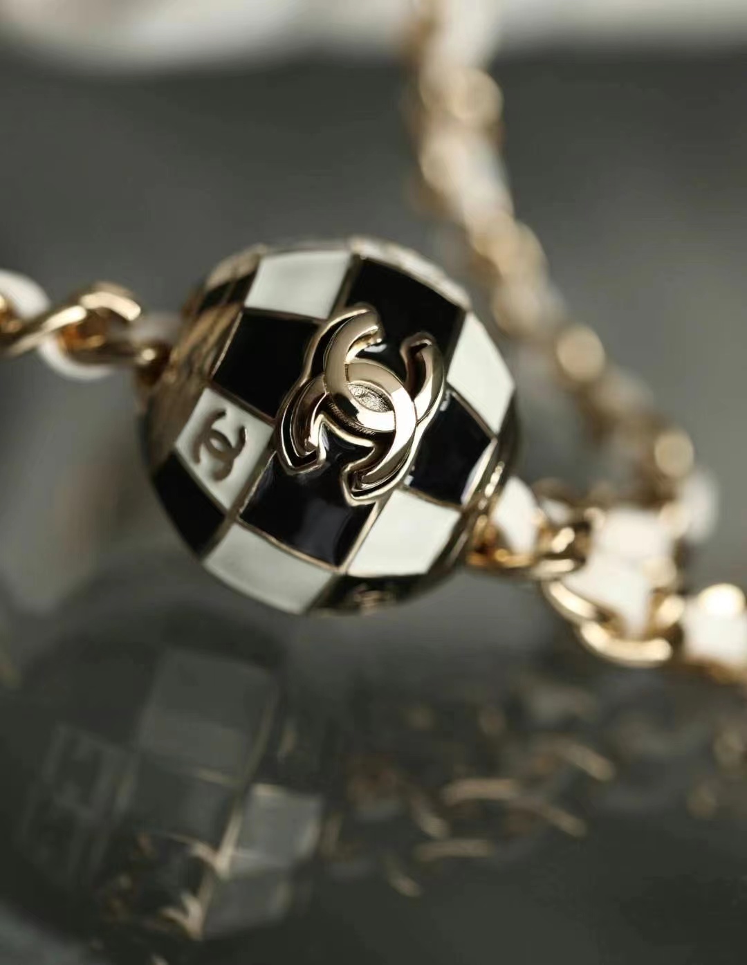 • Chanel Fatty Fang Enamel black grid ball Shoulder Bags White gold buckle
