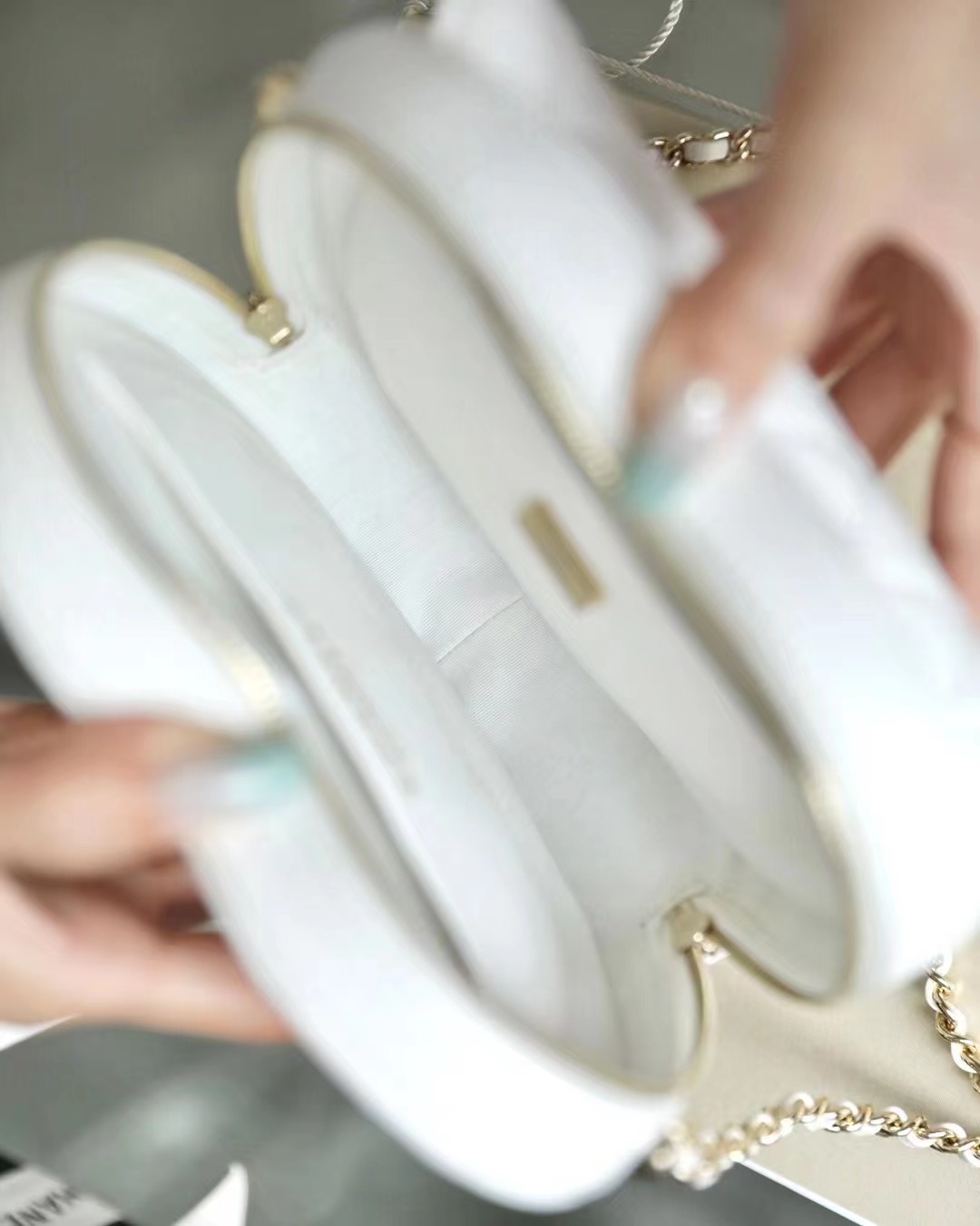 • CHANEL Heart Minaudiere/love bag Gold-Tone Metal & Metallic Lambskin White large