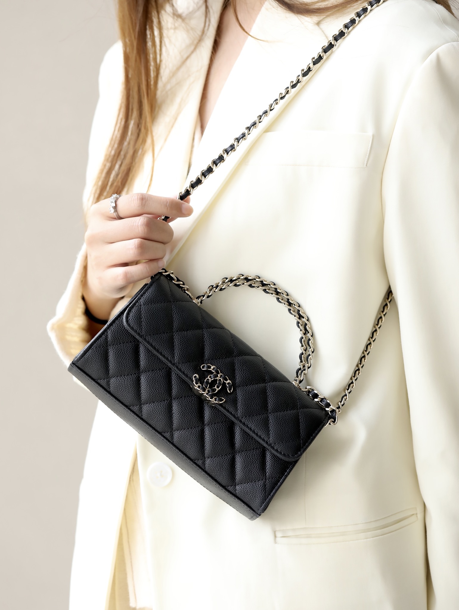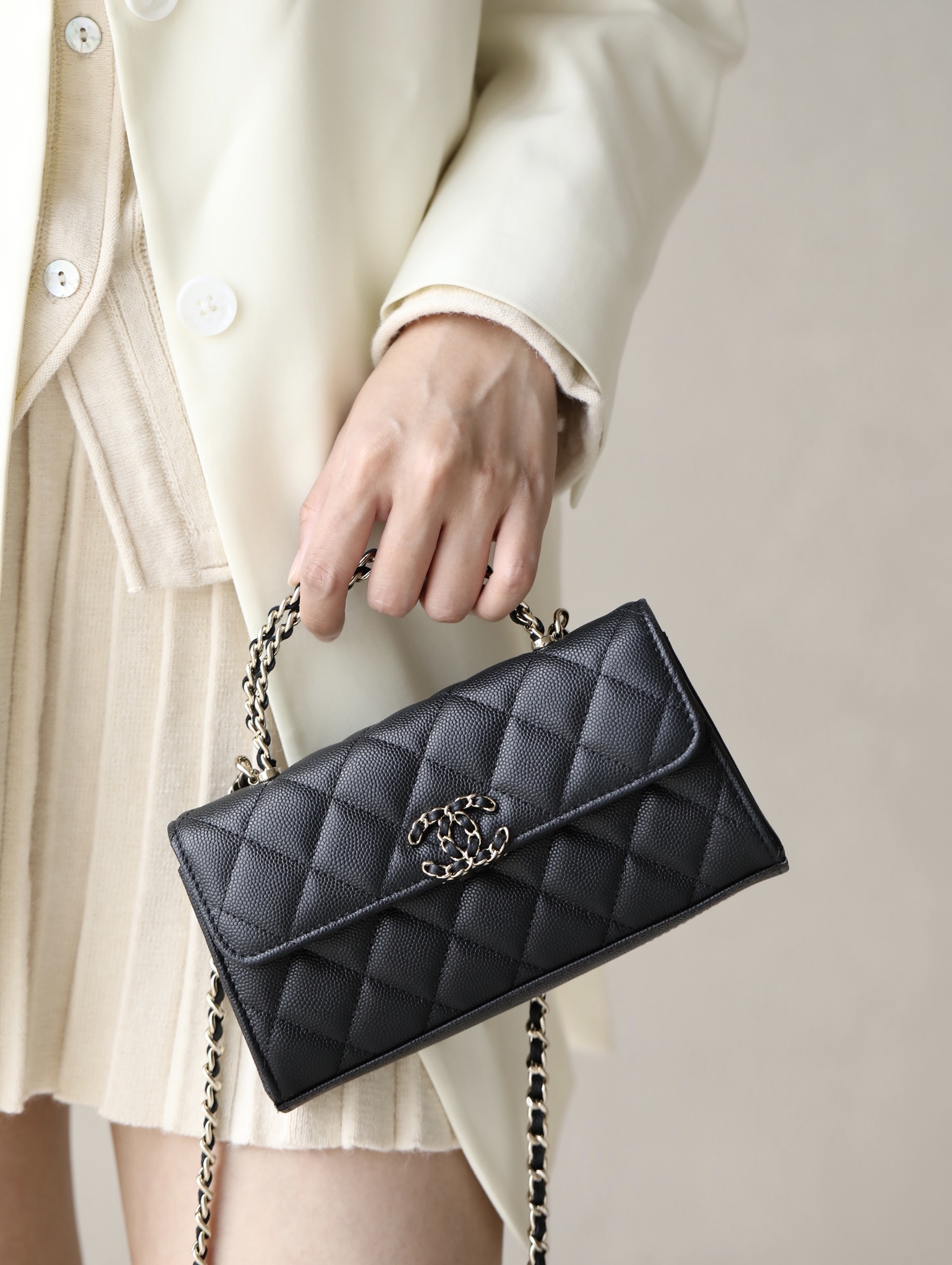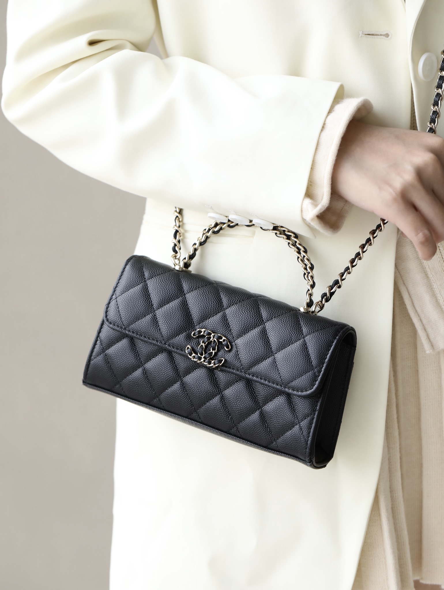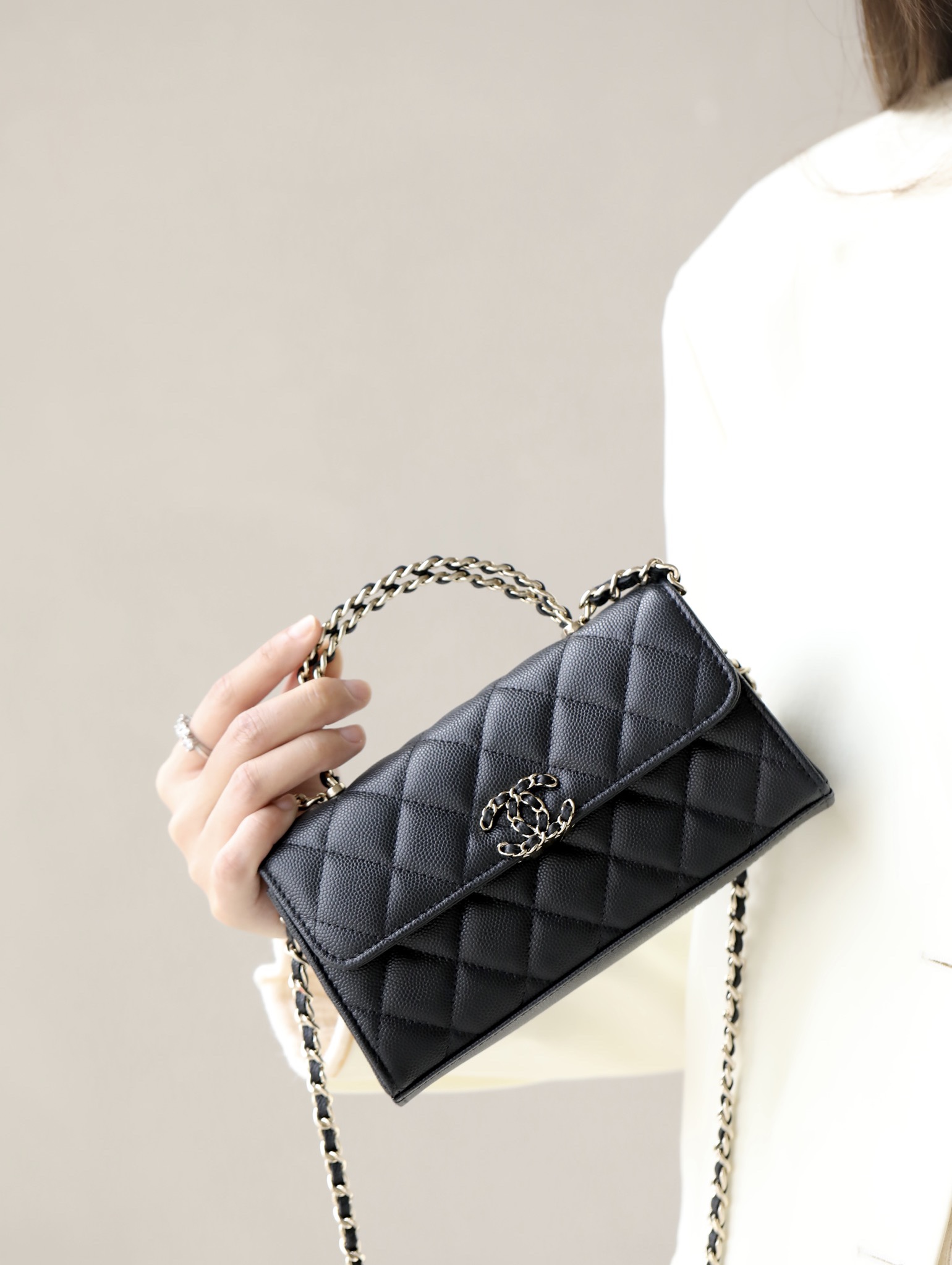 CHANEL kelly Clutch with Chain Grained Shiny Calfskin & Gold-Tone Metal black