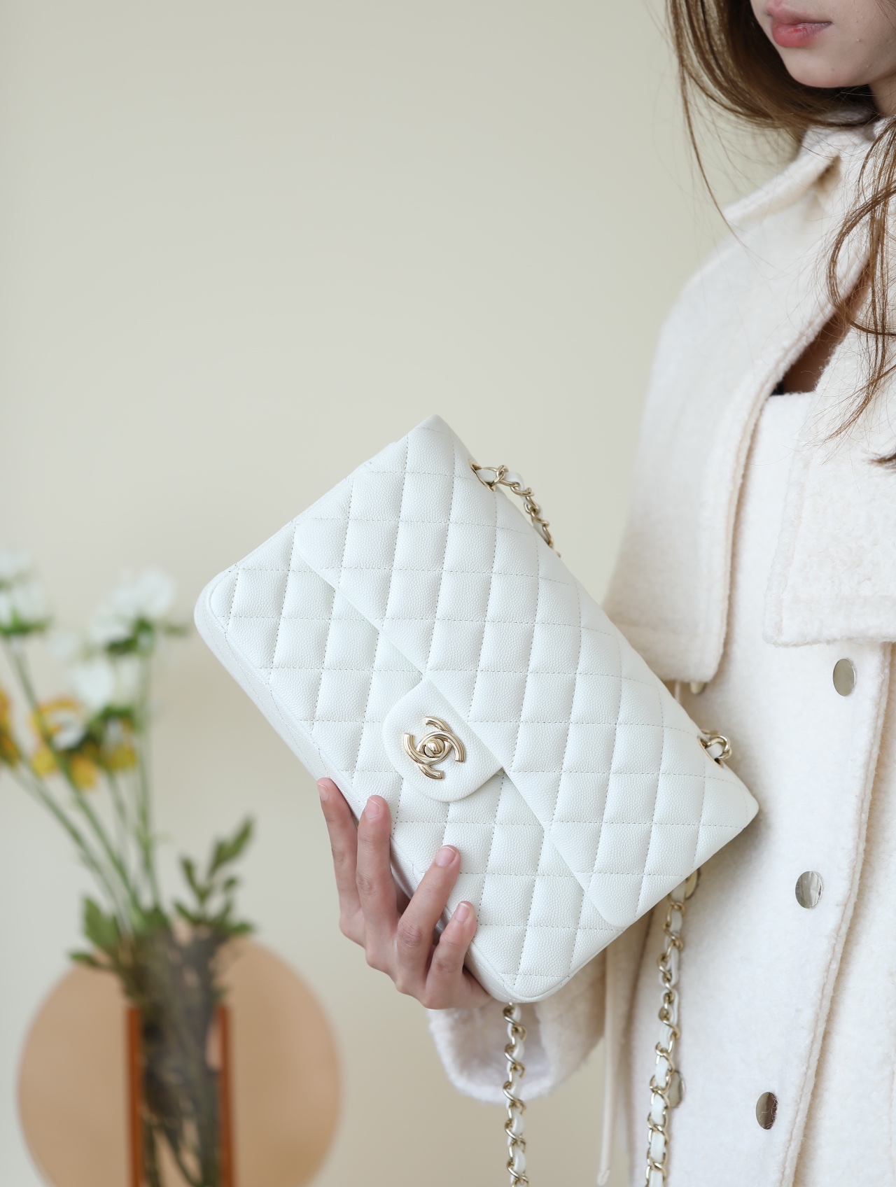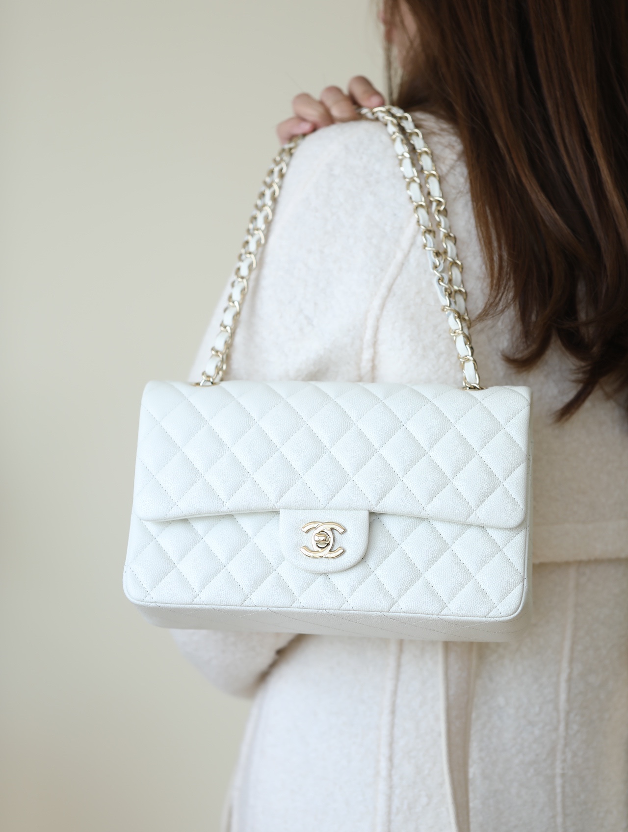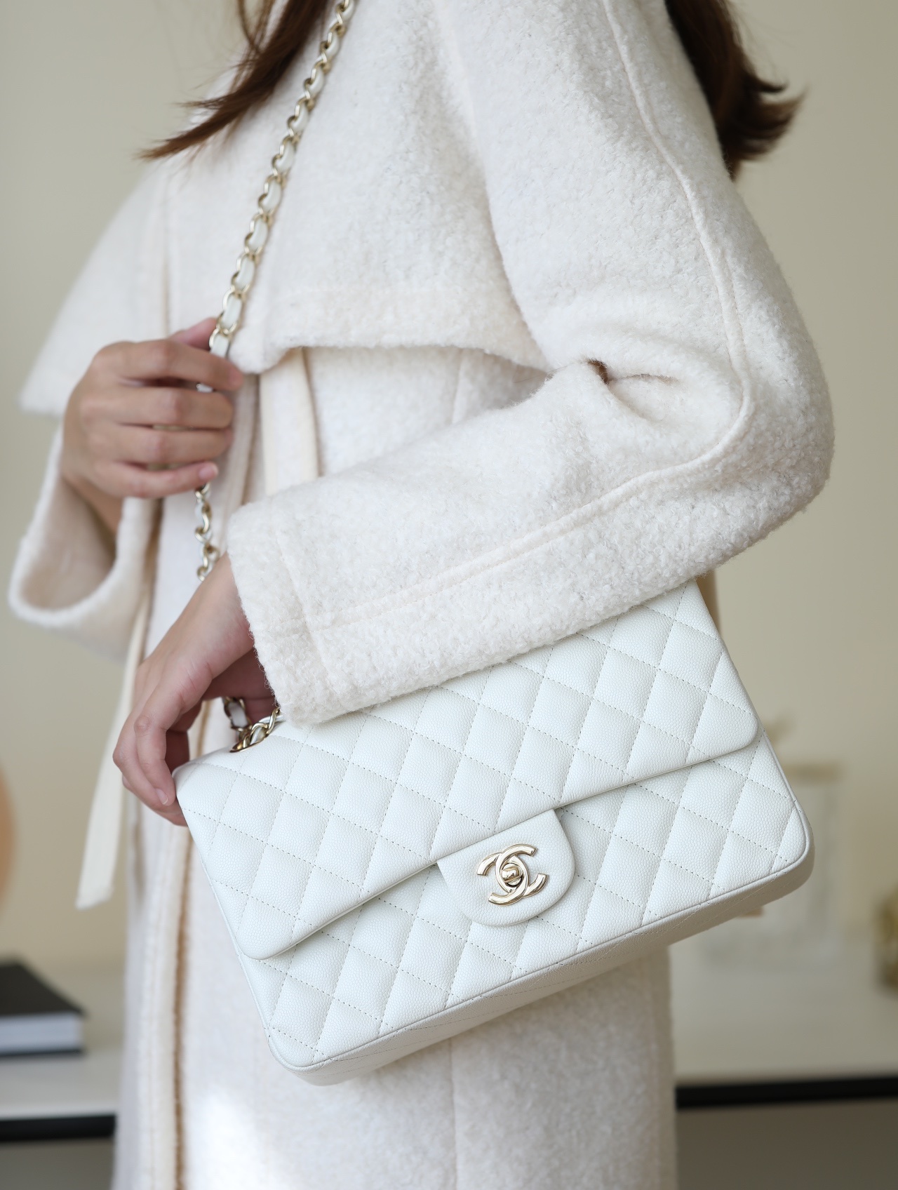 • CHANEL Medium Classic Double Flap White Caviar Light Gold Hardware