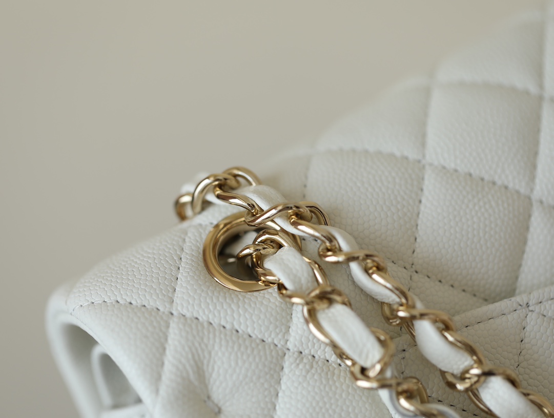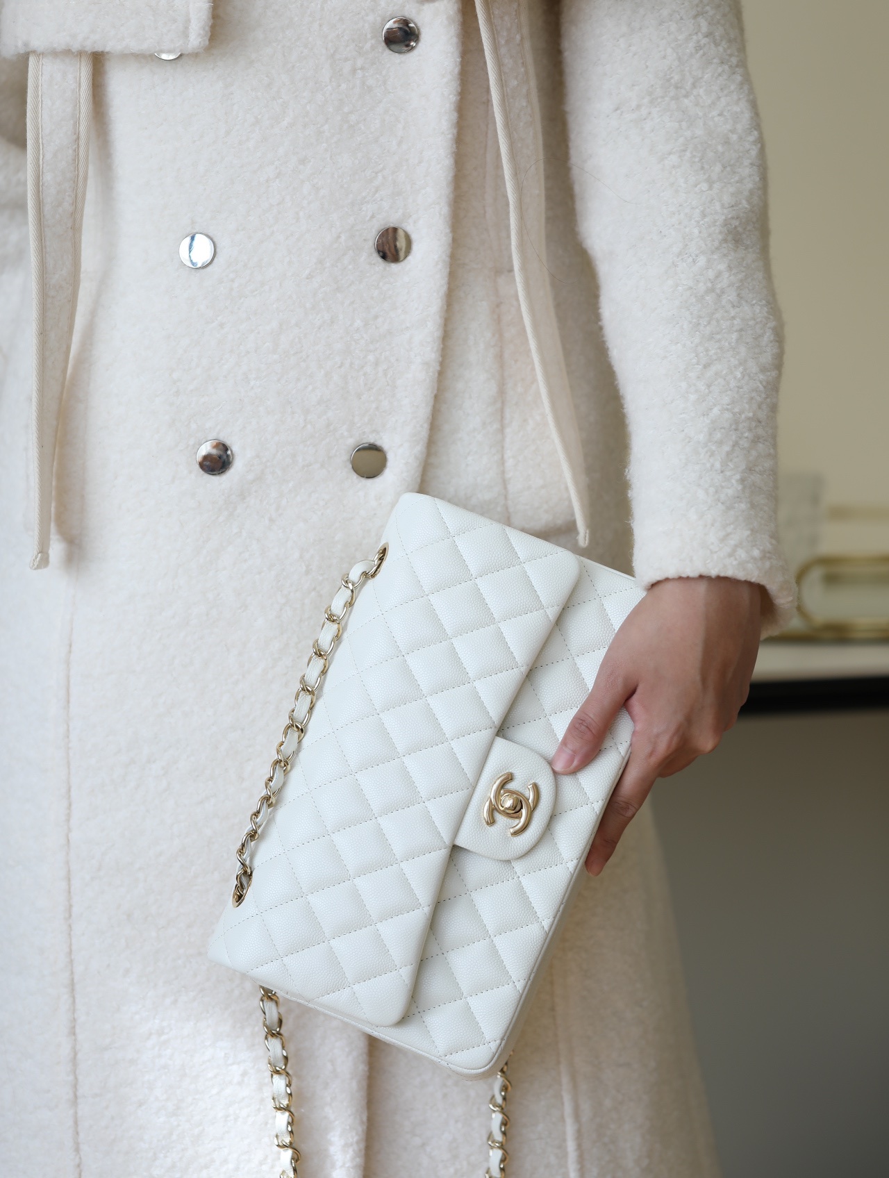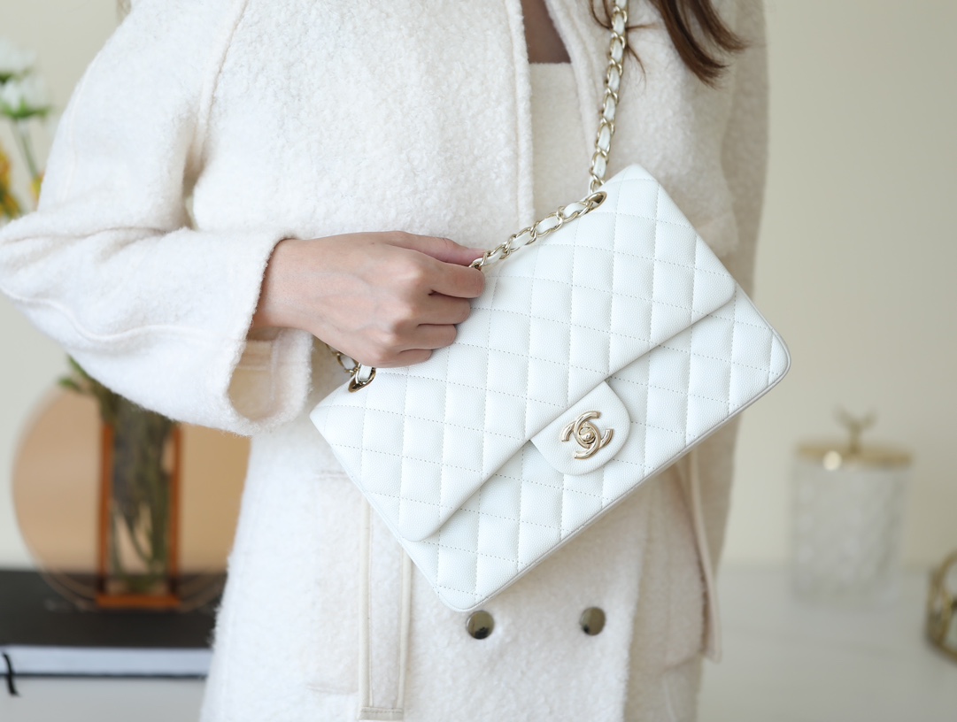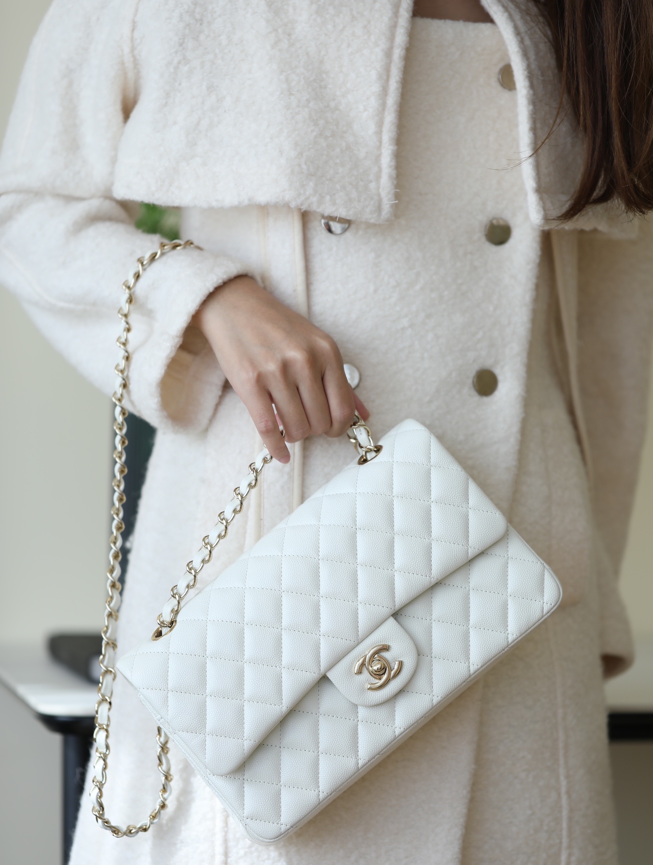 • CHANEL Medium Classic Double Flap White Caviar Light Gold Hardware