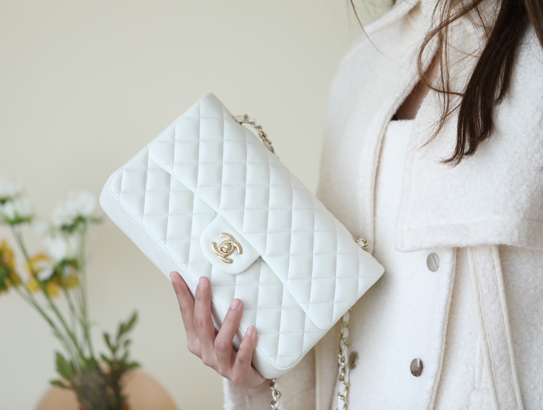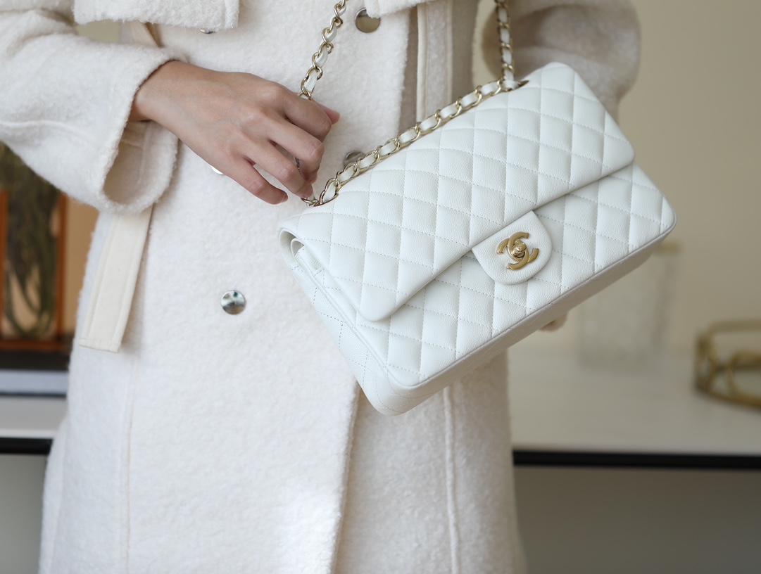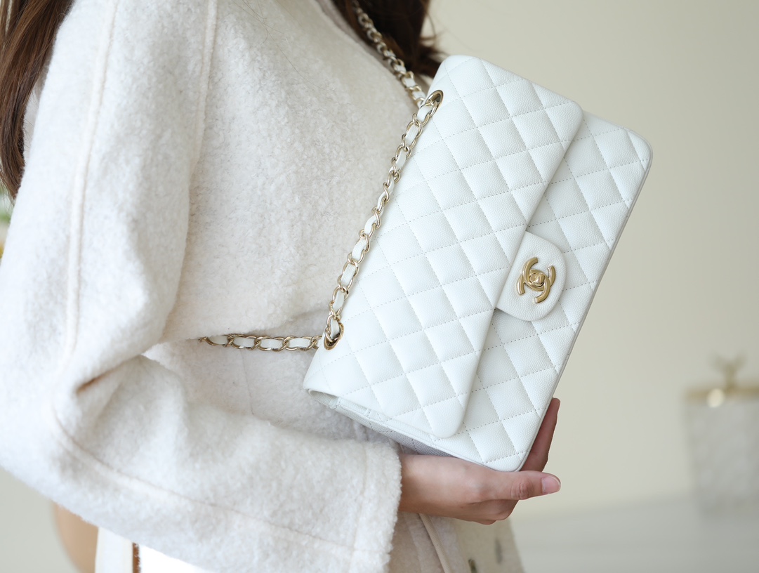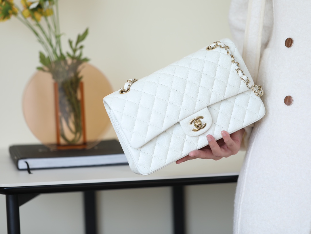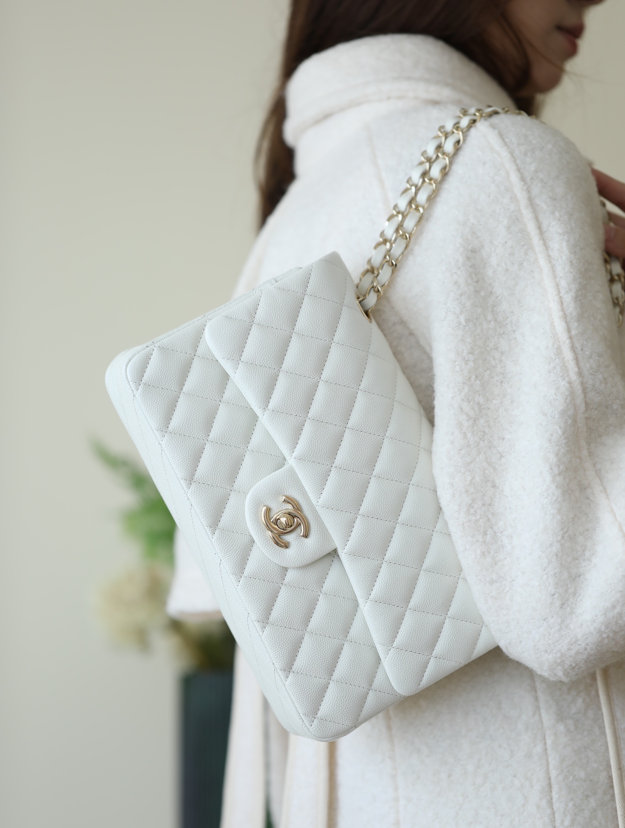 • CHANEL Medium Classic Double Flap White Caviar Light Gold Hardware