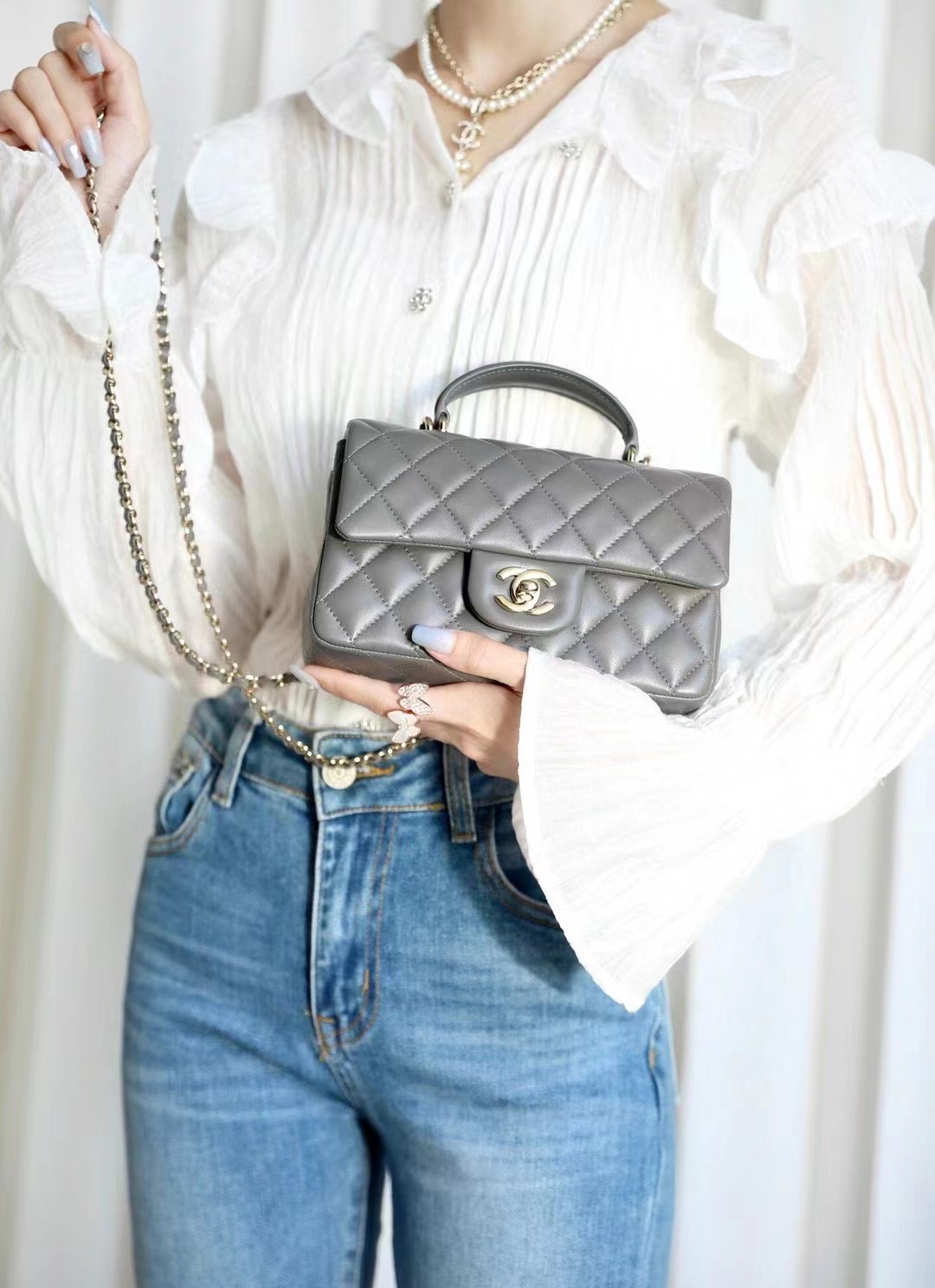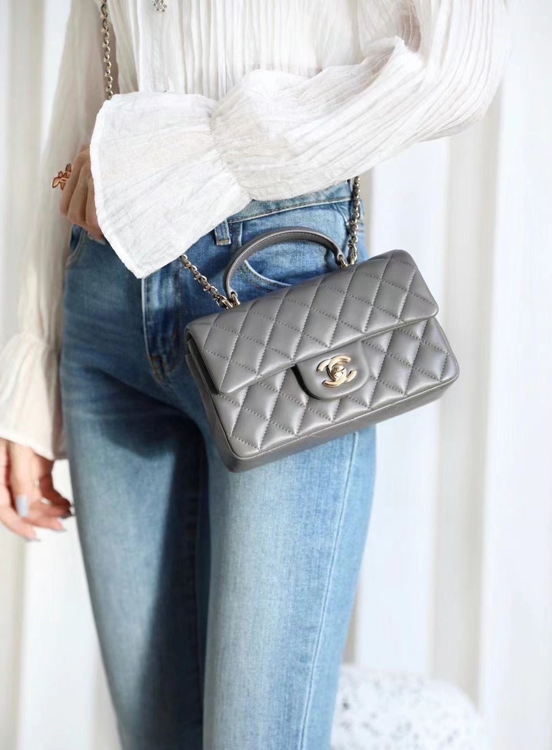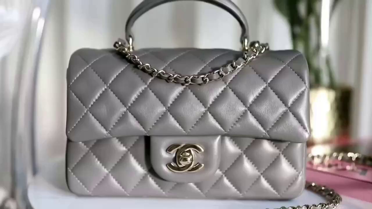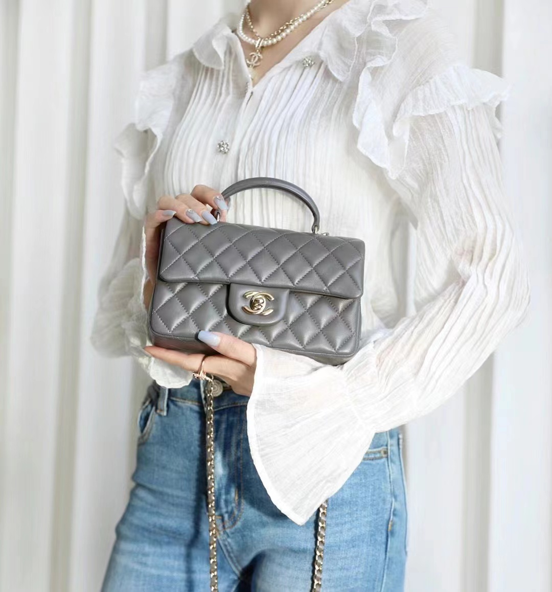• Chanel mini classic flap handbag Advanced gray gold buckle