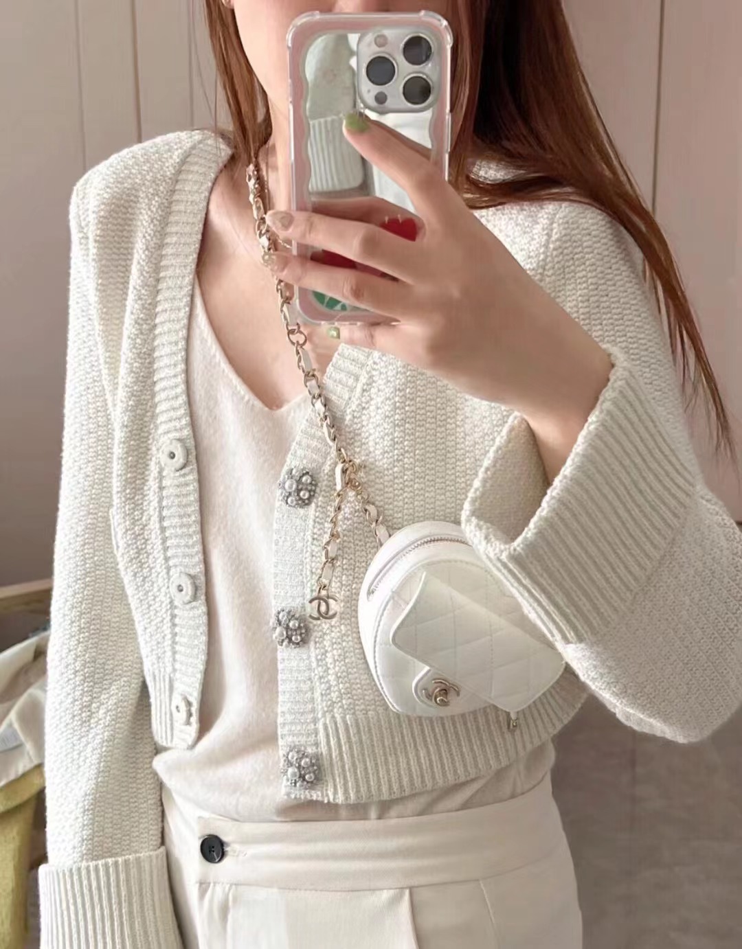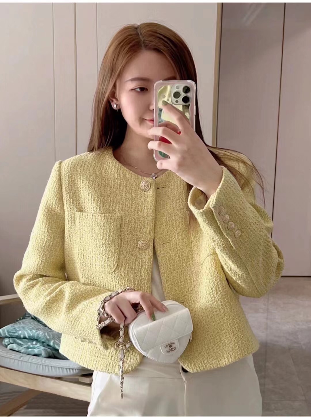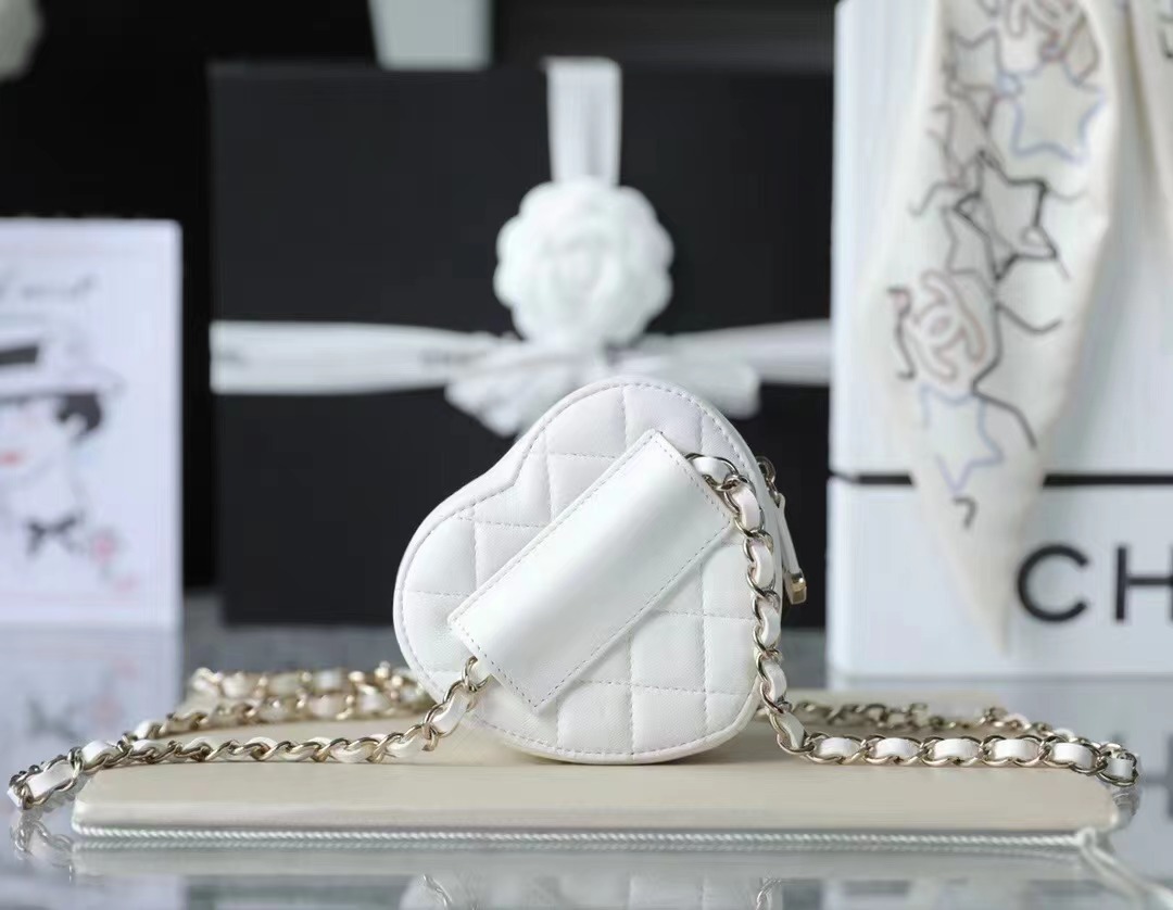 • CHANEL mini Heart Minaudiere/love bag Gold-Tone Metal & Metallic Lambskin White