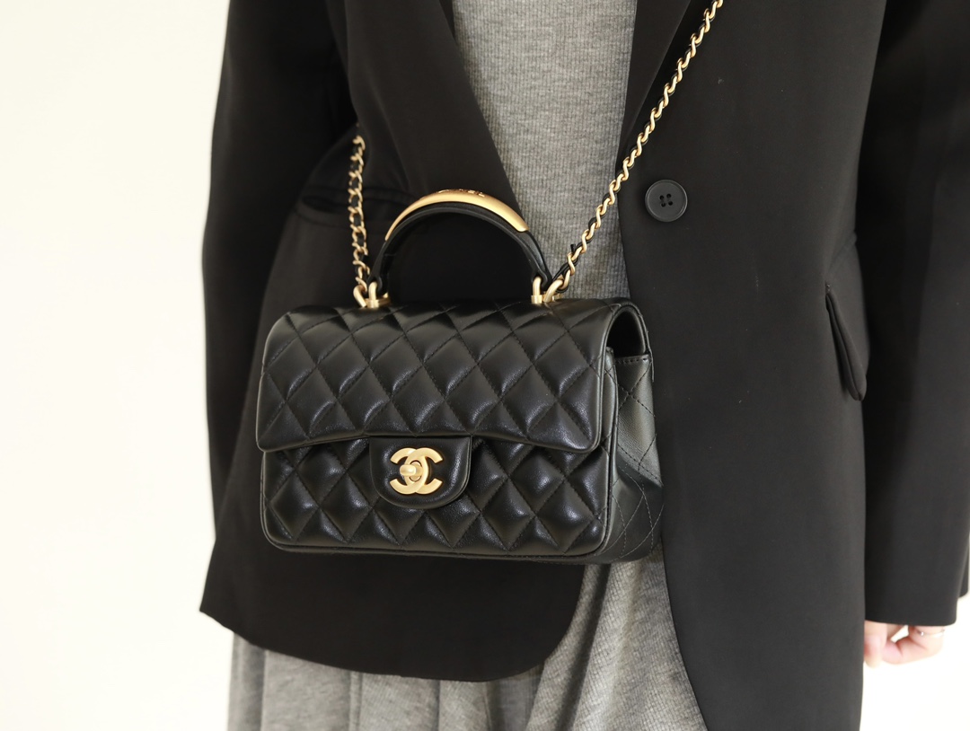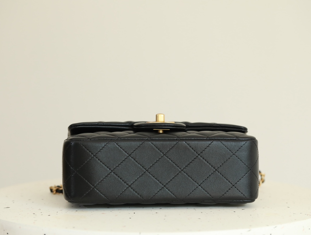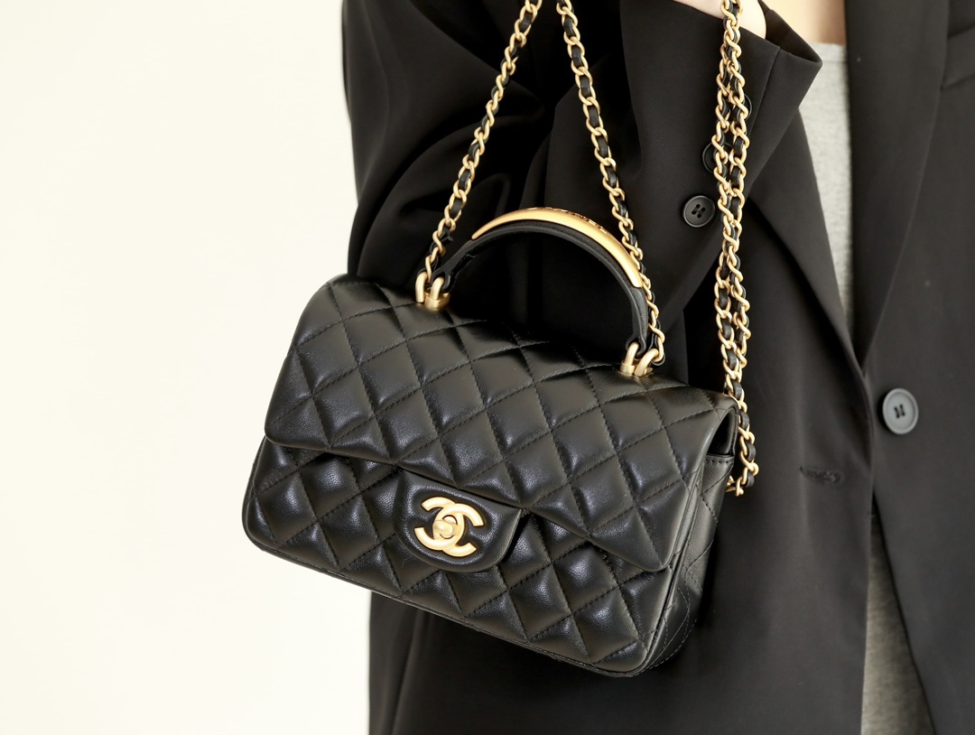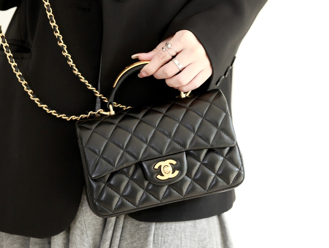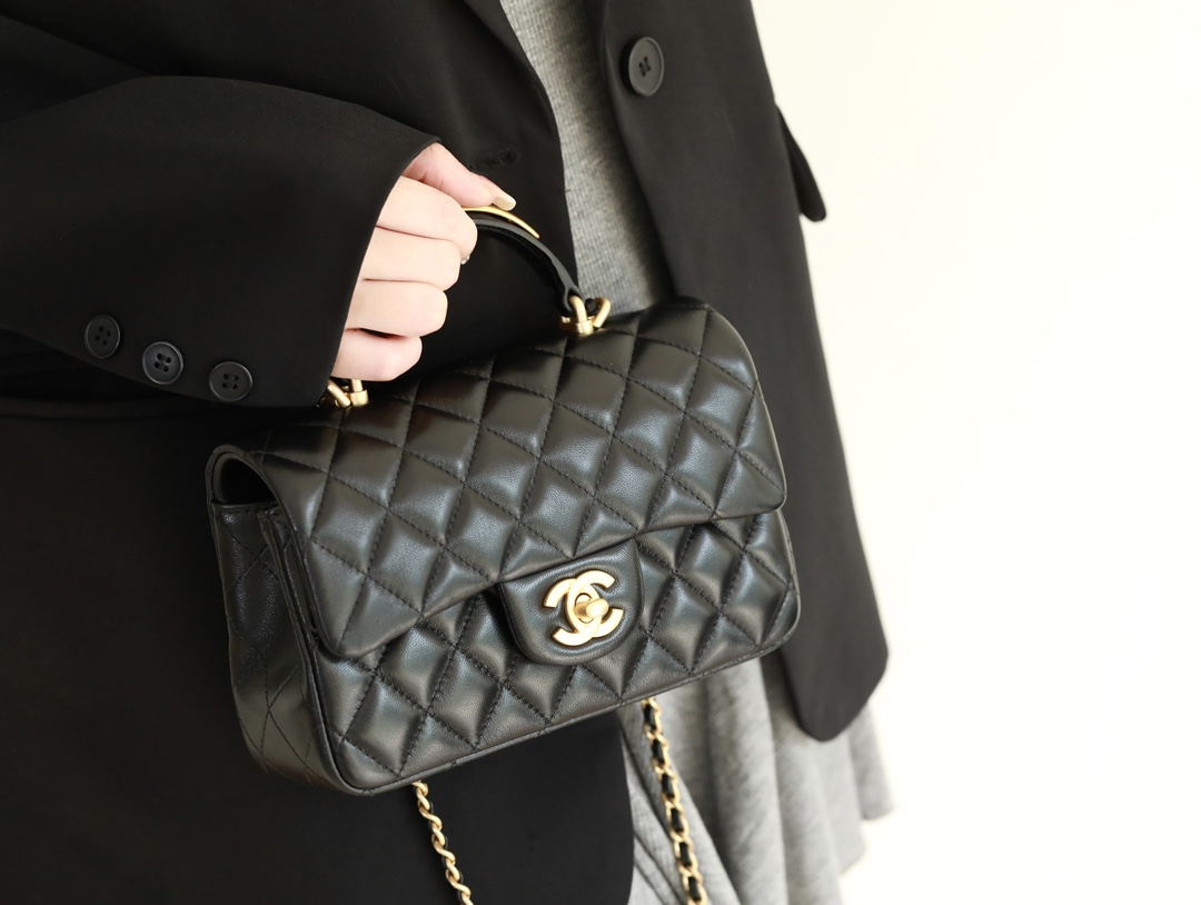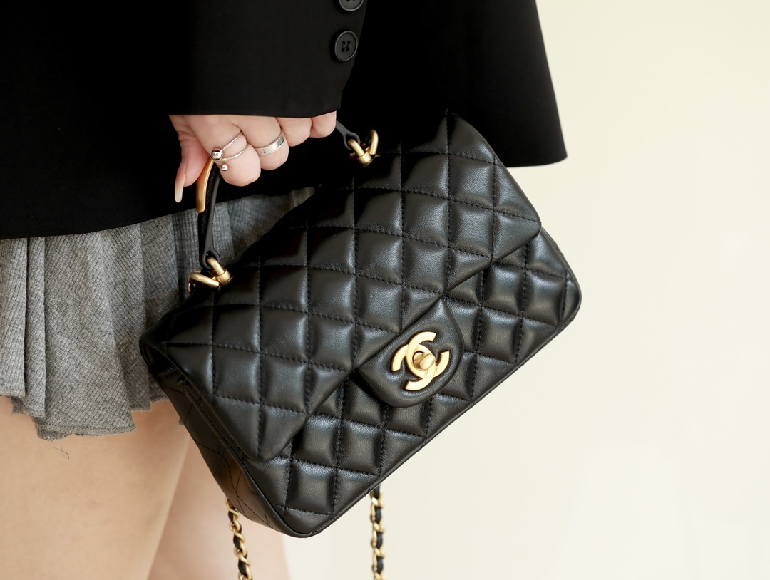 CHANEL Mini Rectangular Flap with Top Handle Black Lambskin Antique Gold Hardware