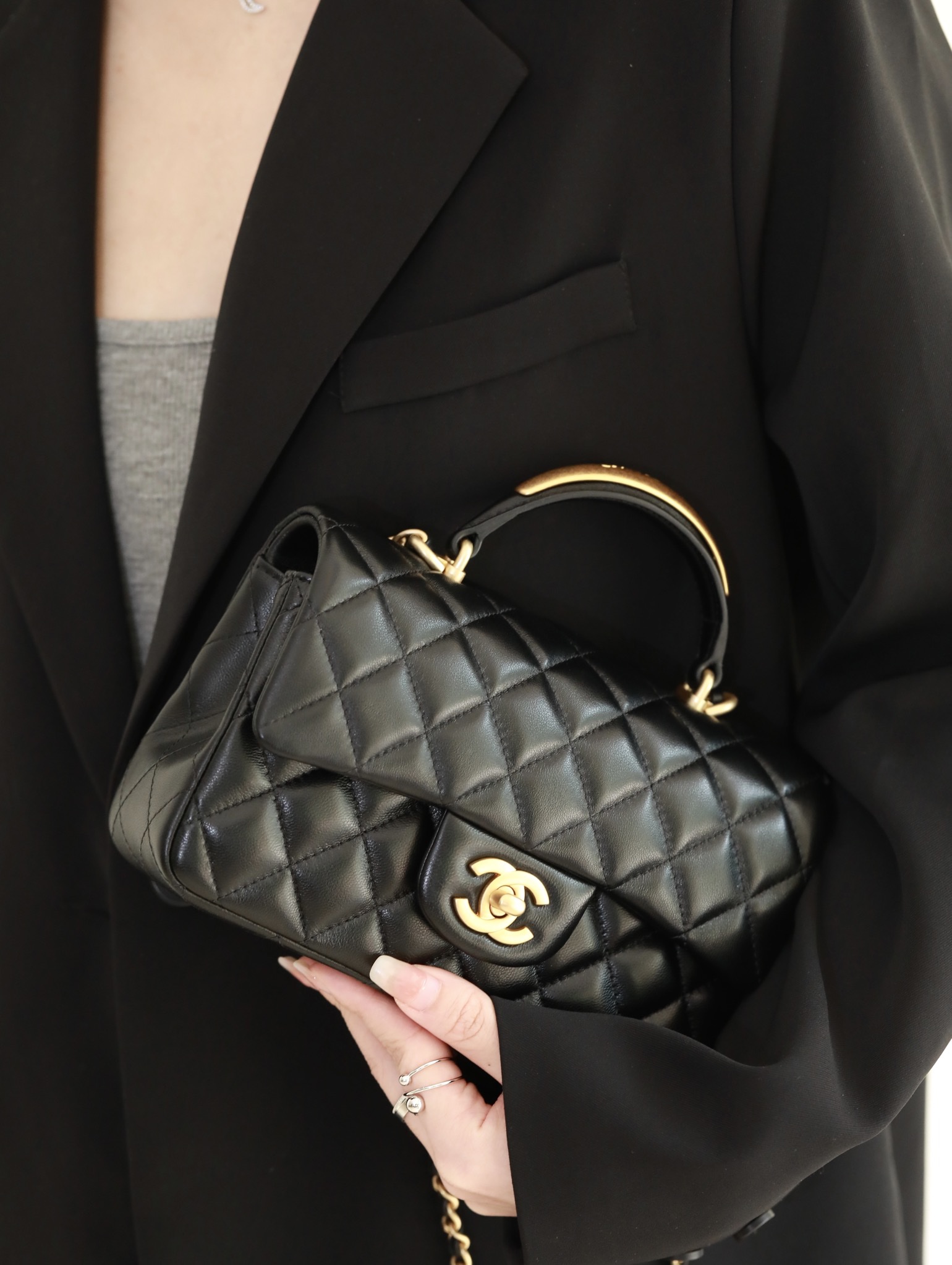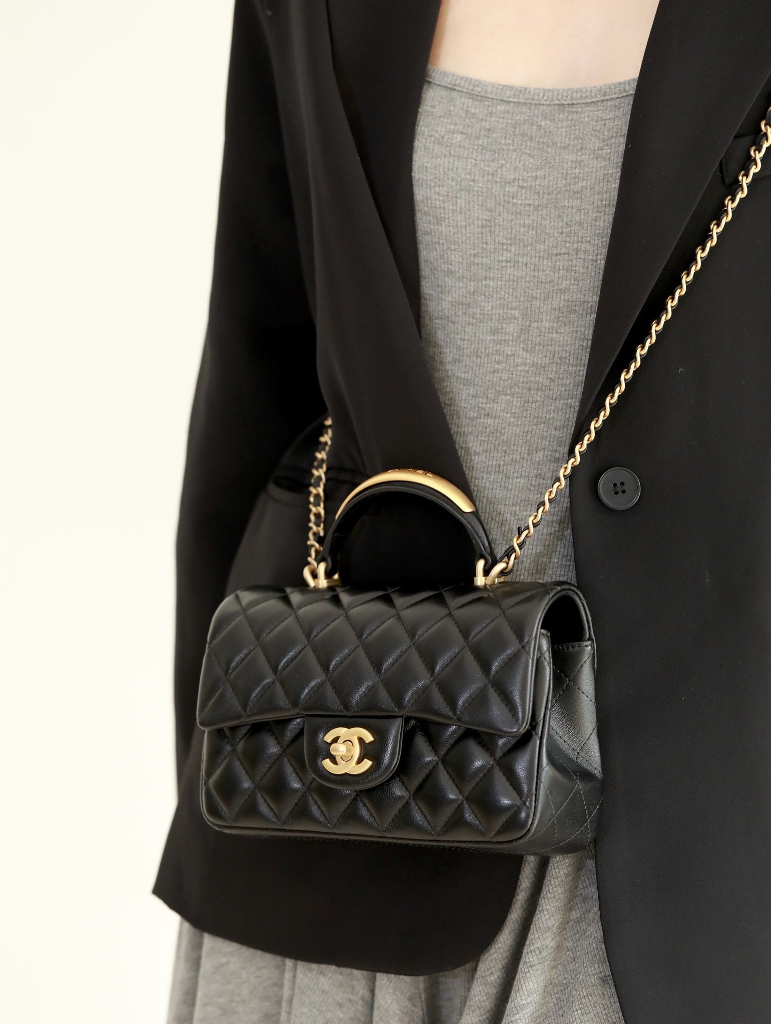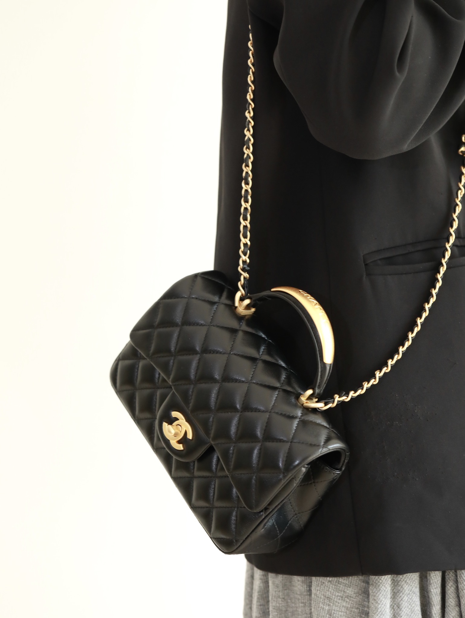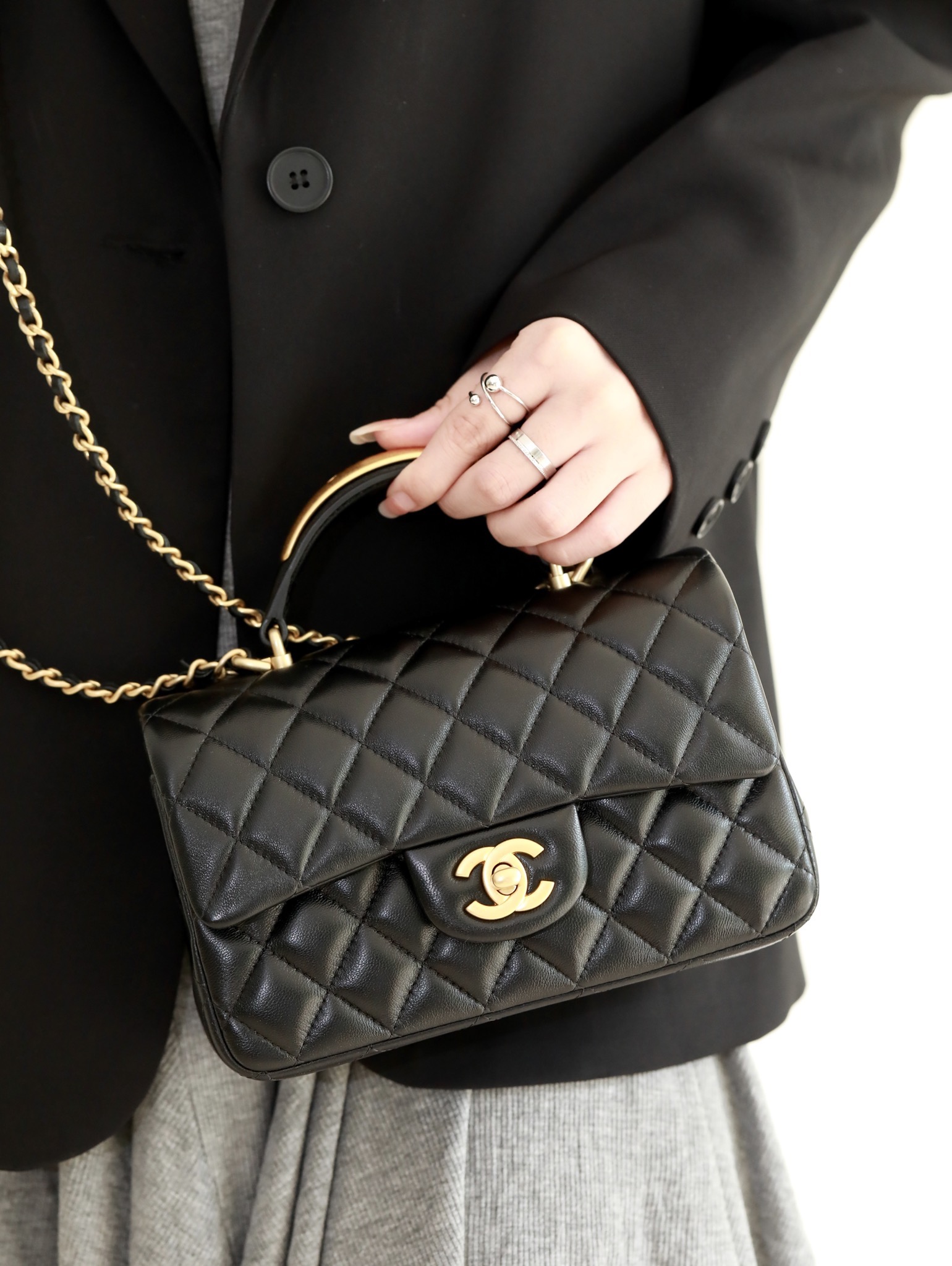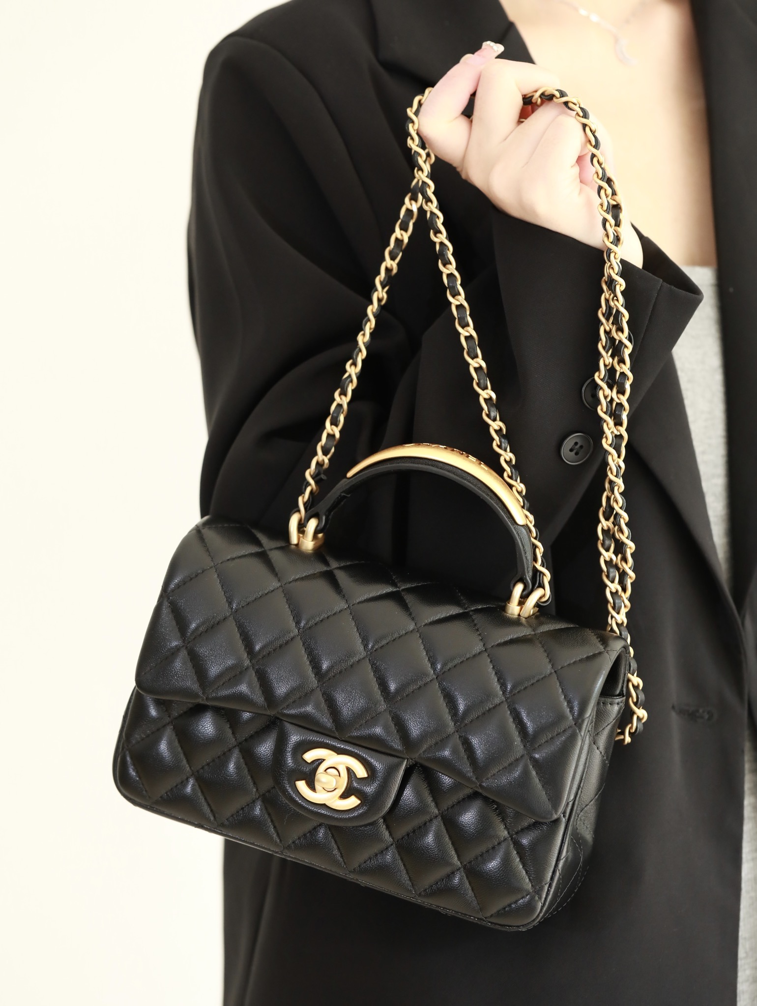 CHANEL Mini Rectangular Flap with Top Handle Black Lambskin Antique Gold Hardware