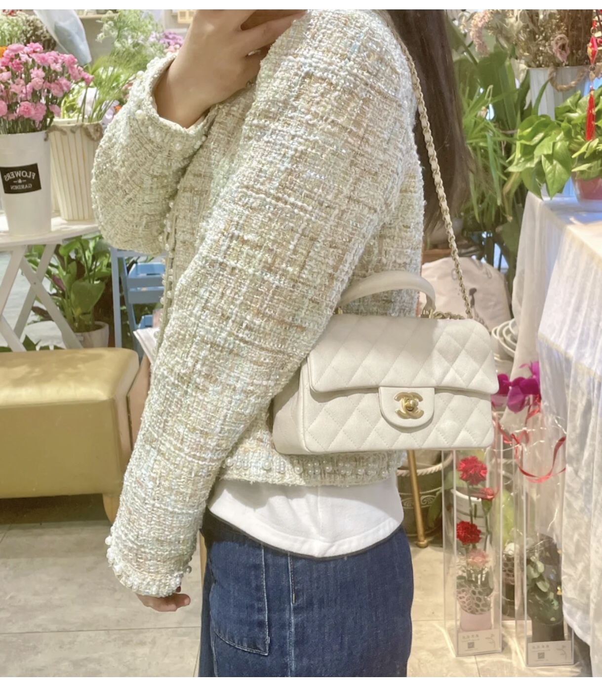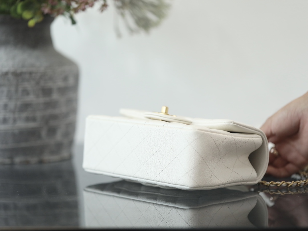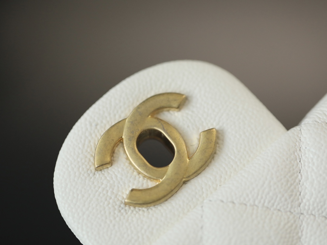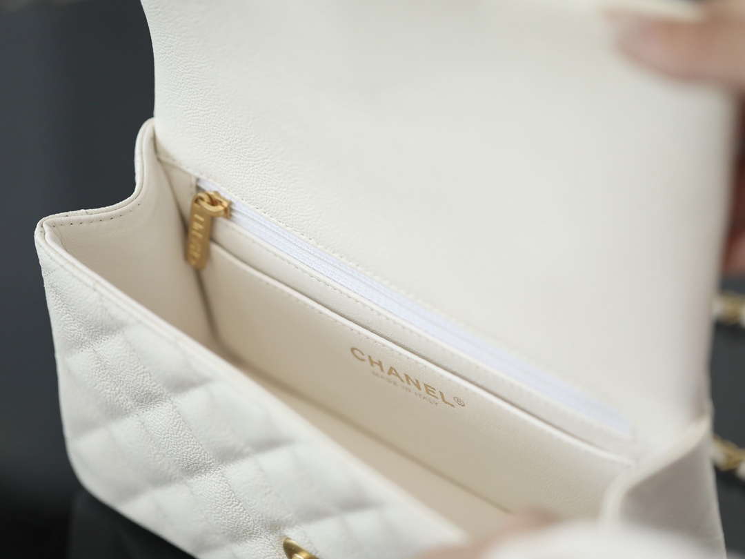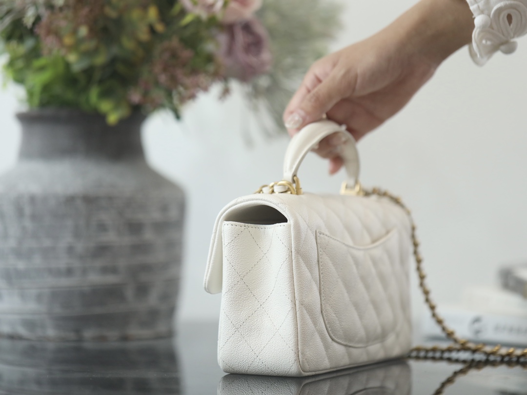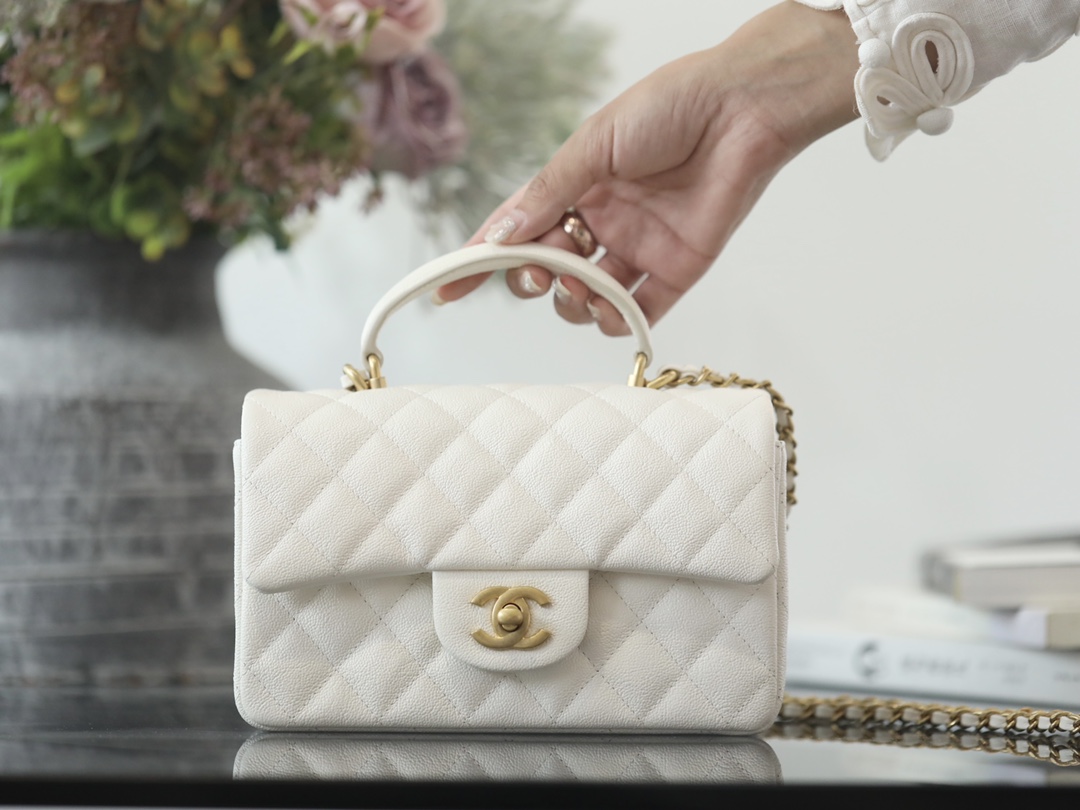 • CHANEL Mini Rectangular Flap with Top Handle White caviar Antique Gold Hardware