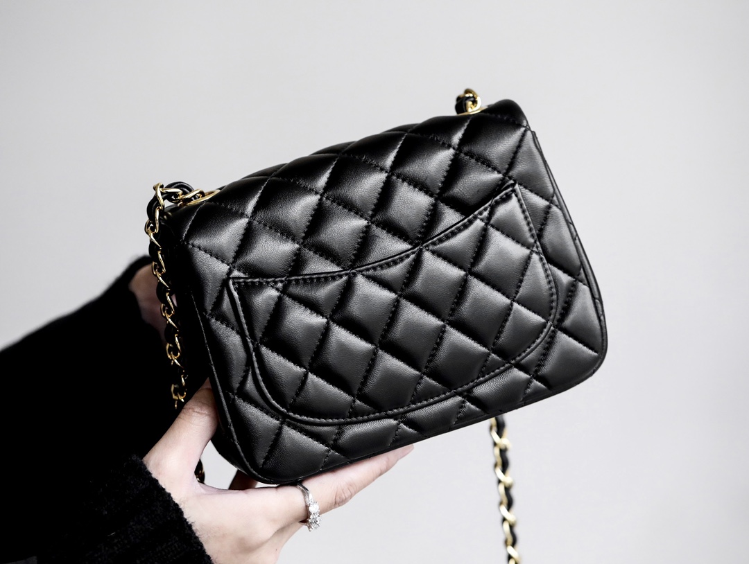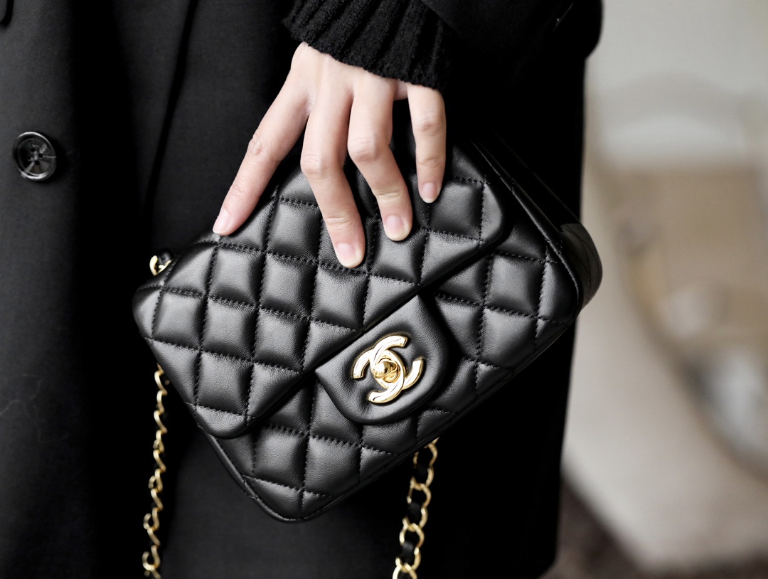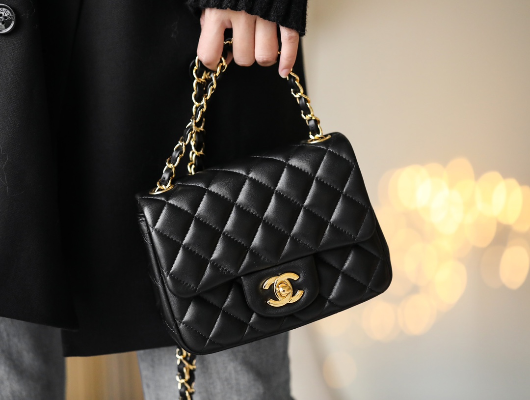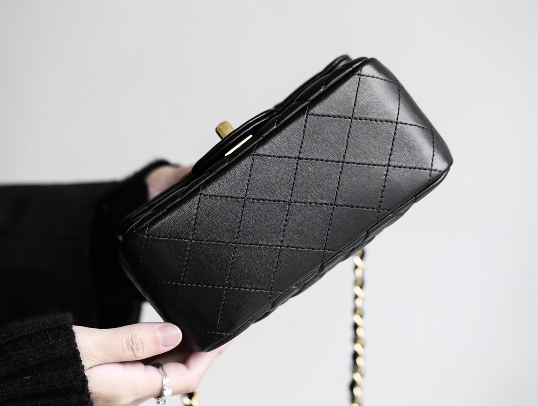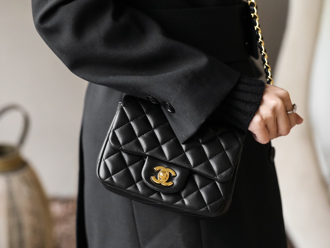 • CHANEL Mini Square Flap Bag Black Lambskin Light Gold Hardware