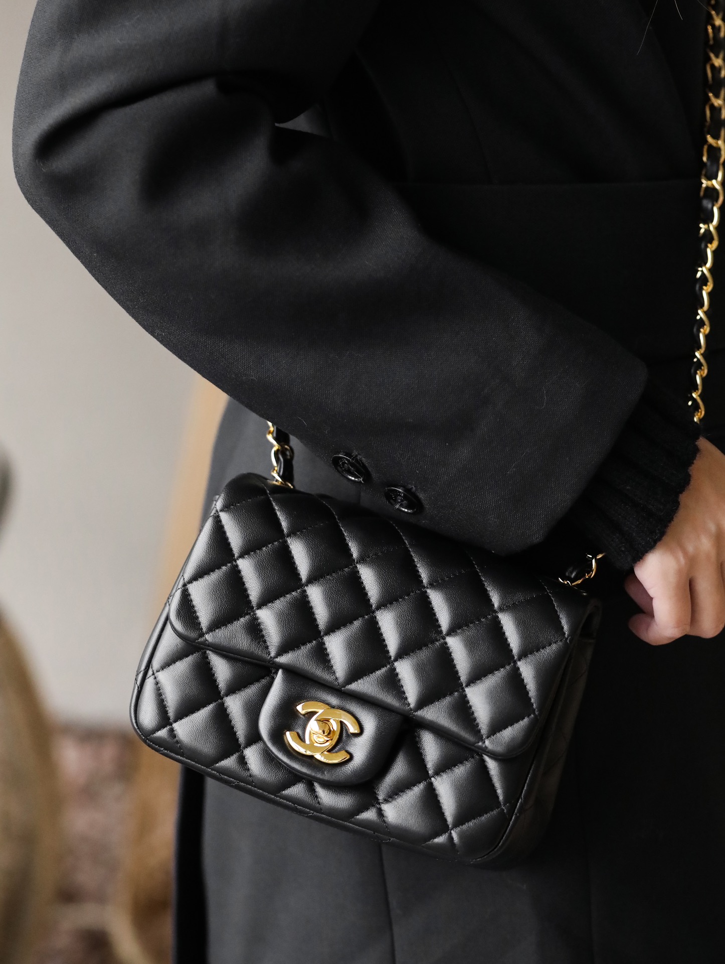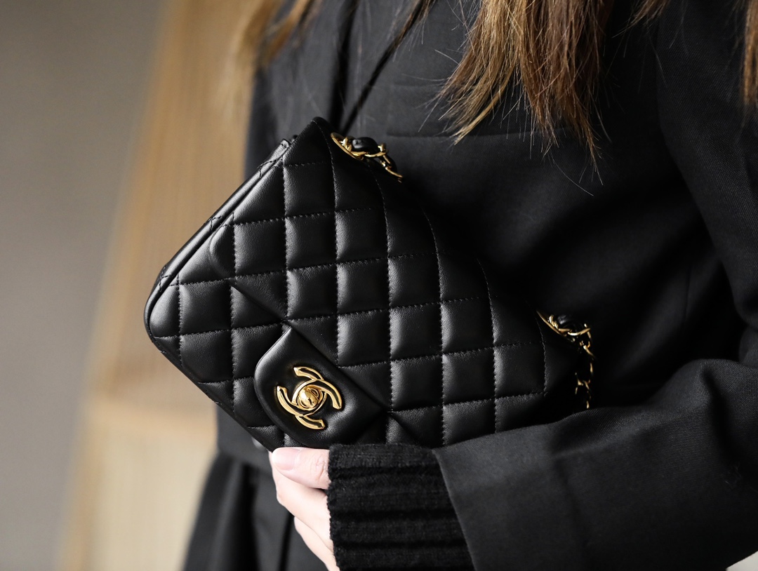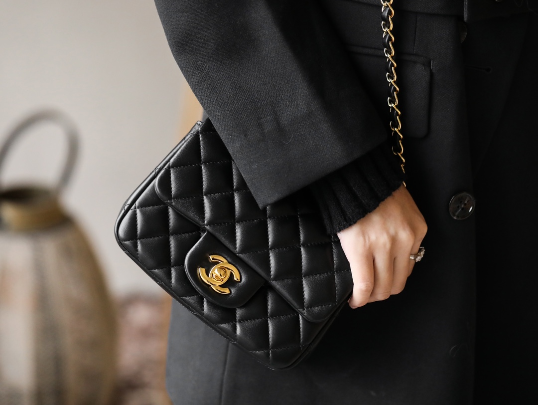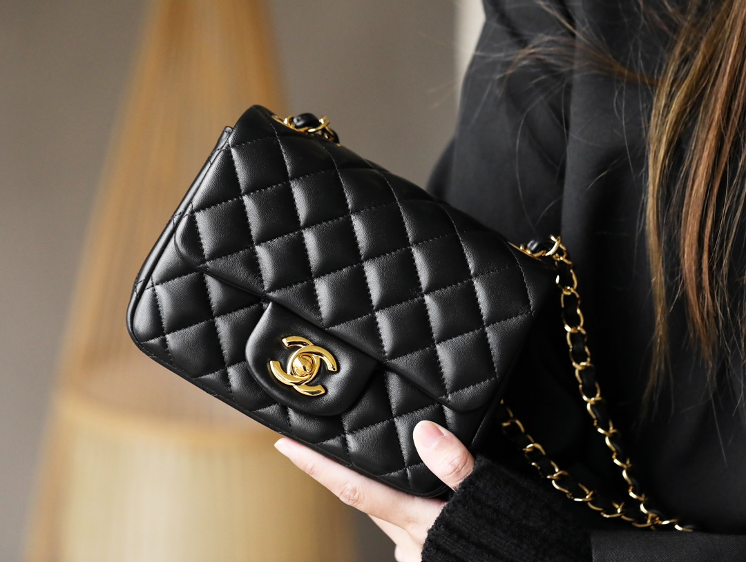 • CHANEL Mini Square Flap Bag Black Lambskin Light Gold Hardware