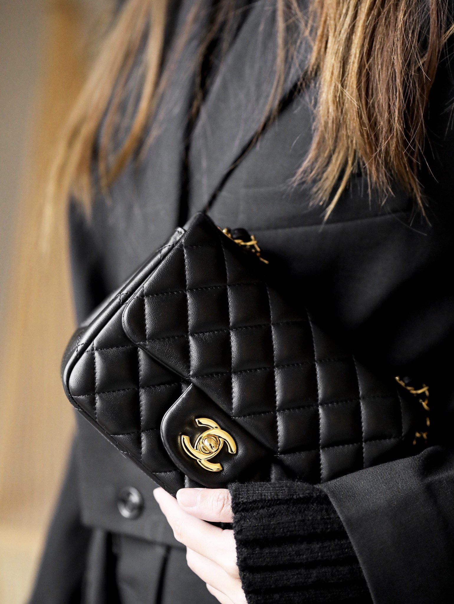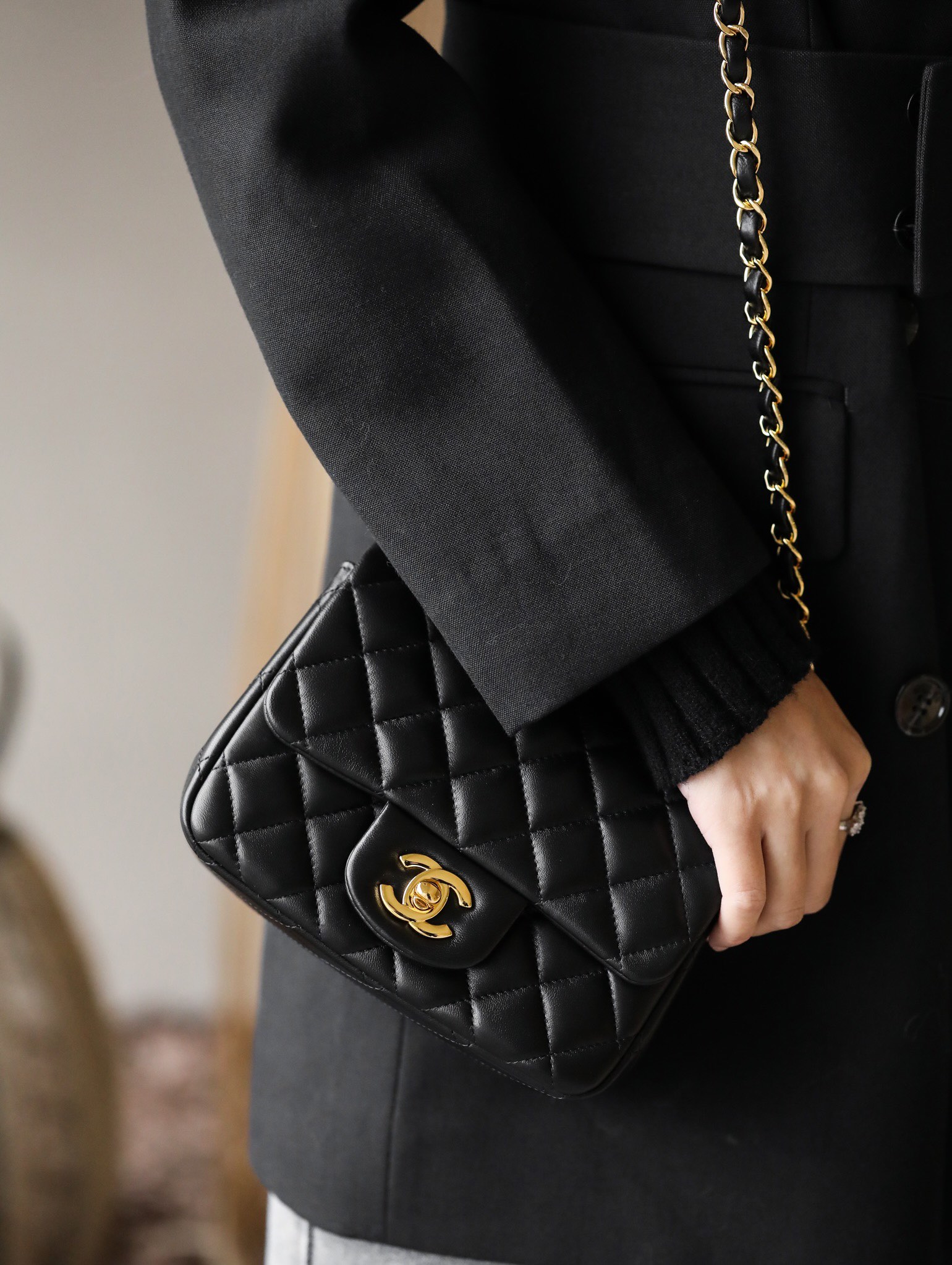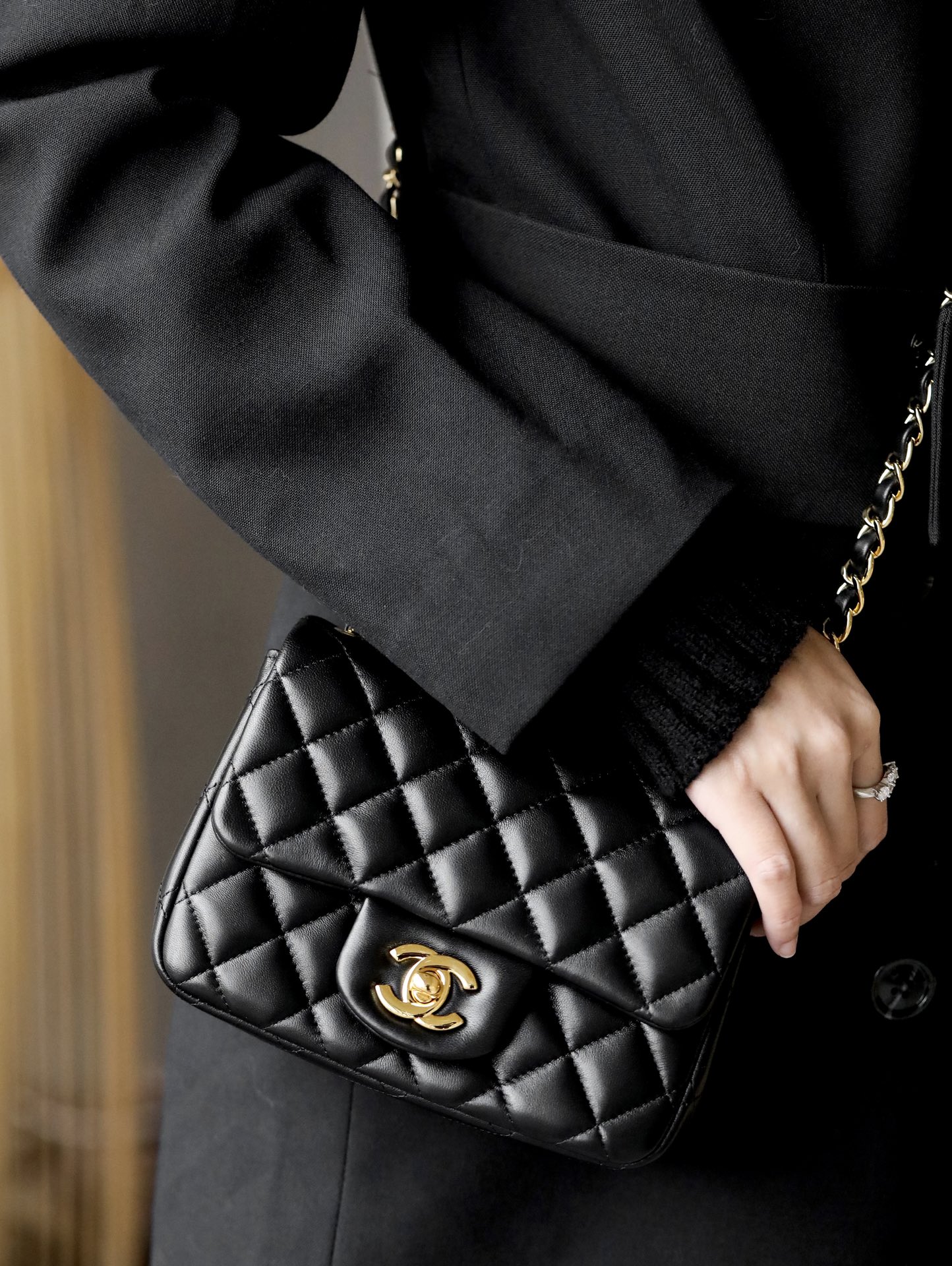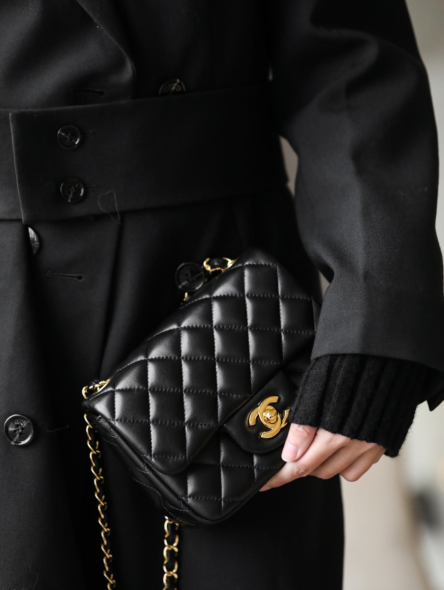 • CHANEL Mini Square Flap Bag Black Lambskin Light Gold Hardware