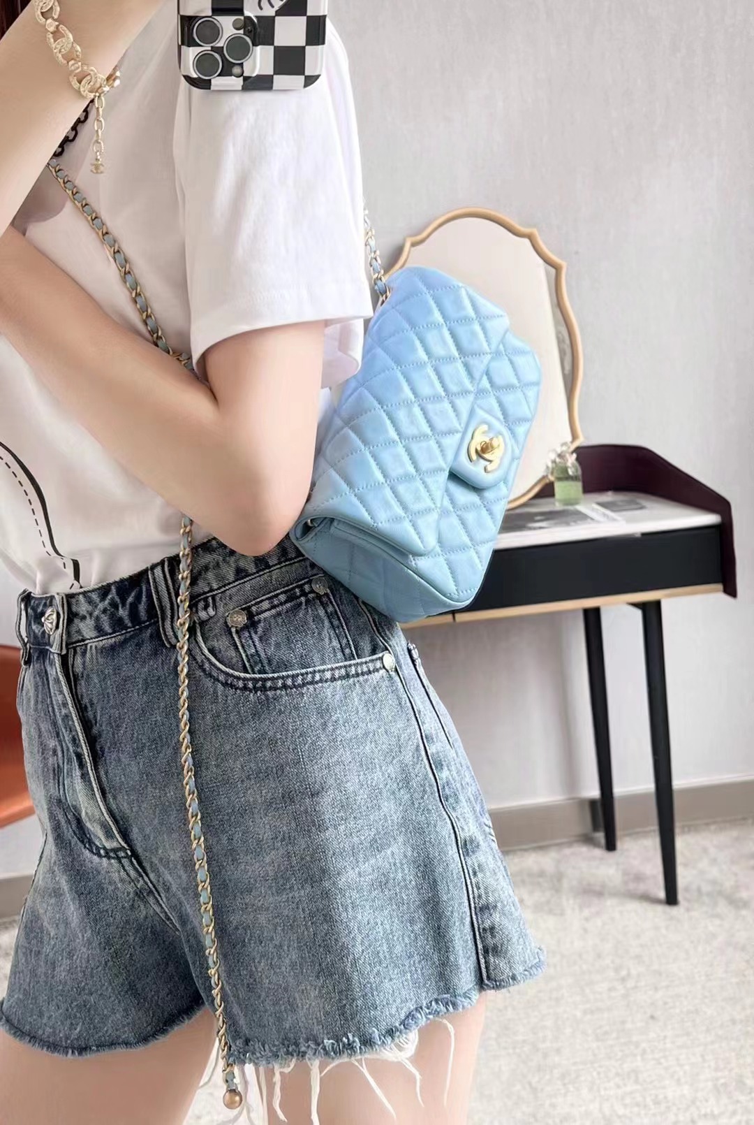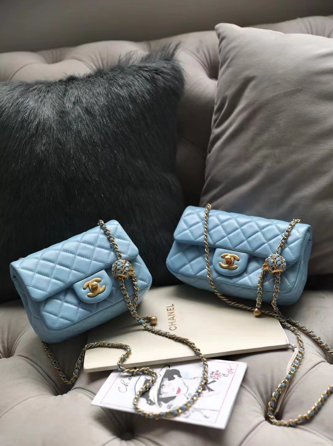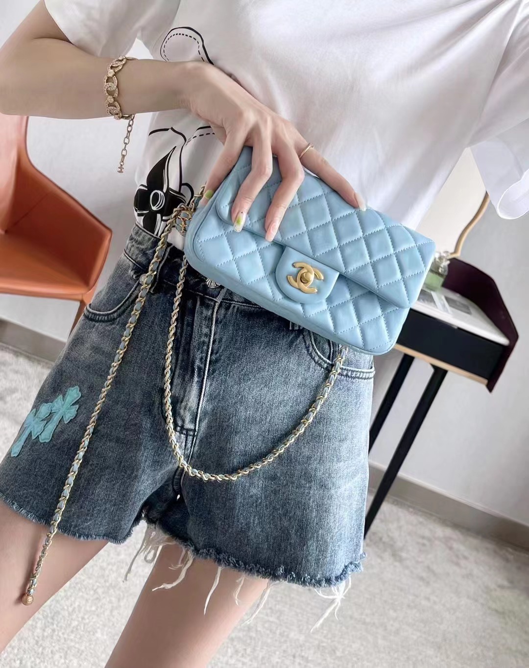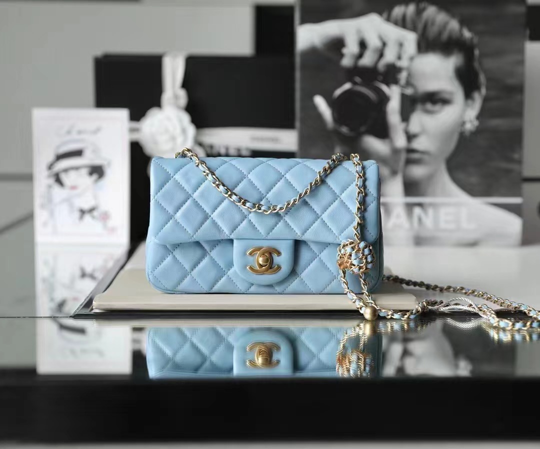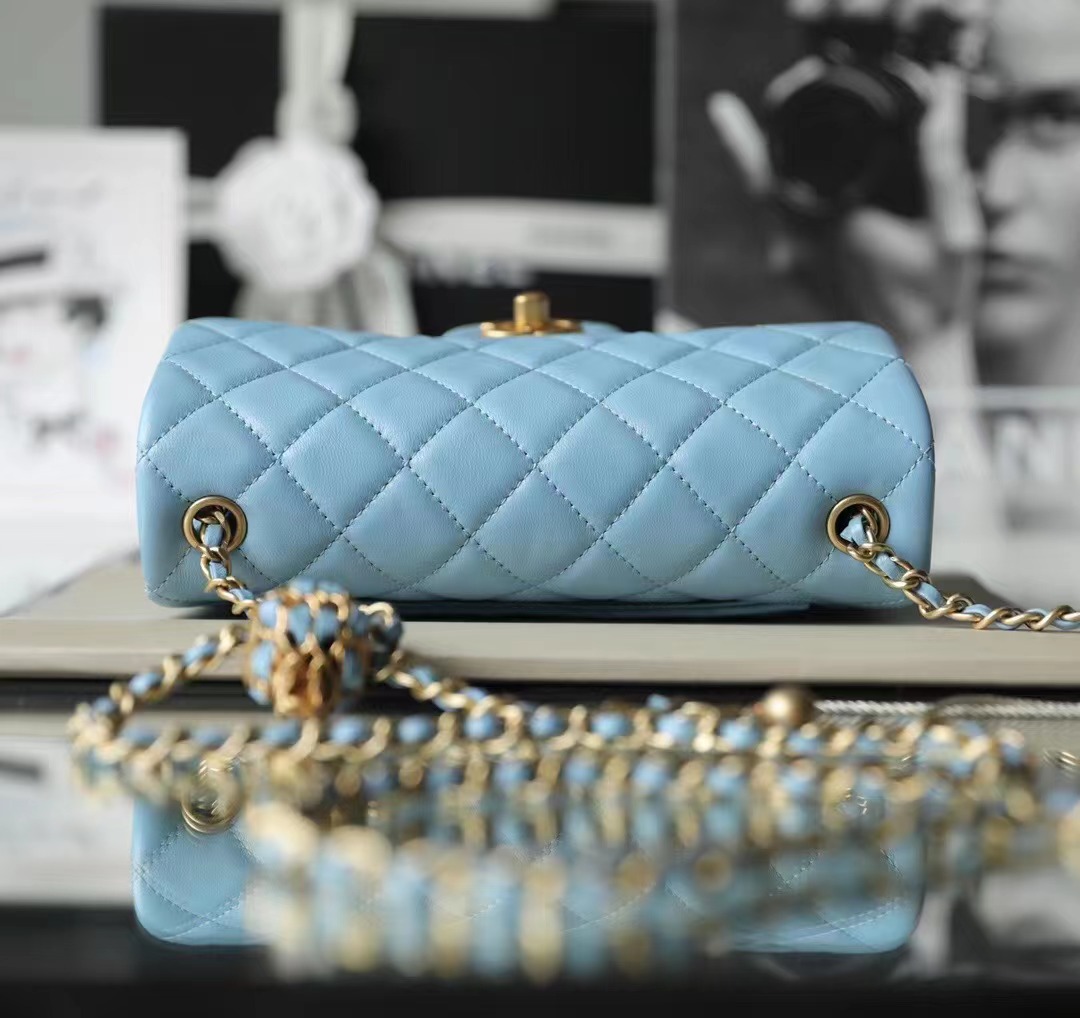 • Chanel Pearl Crush Mini Rectangular Flap Bag baby blue Lambskin Antique Gold Hardware