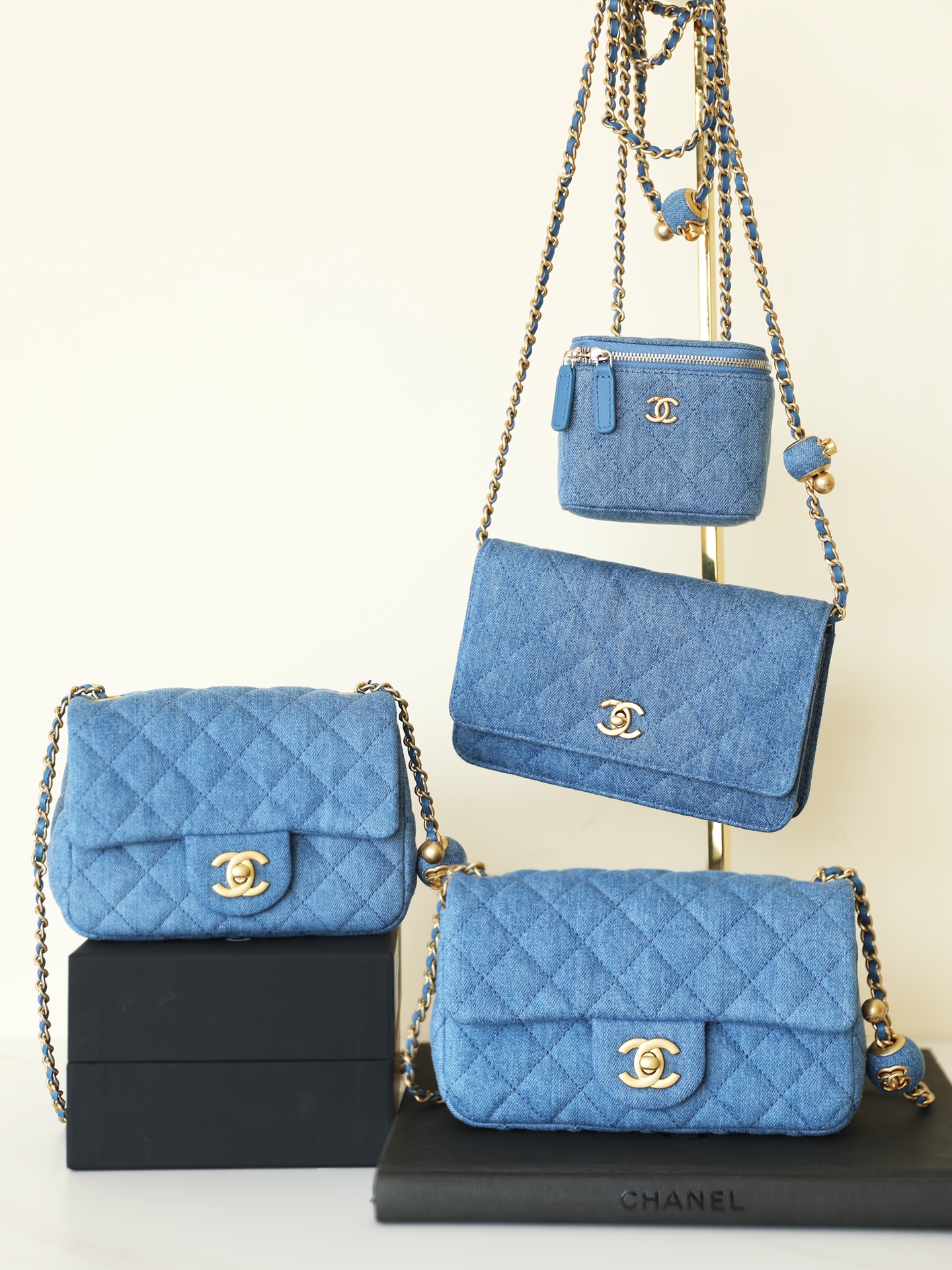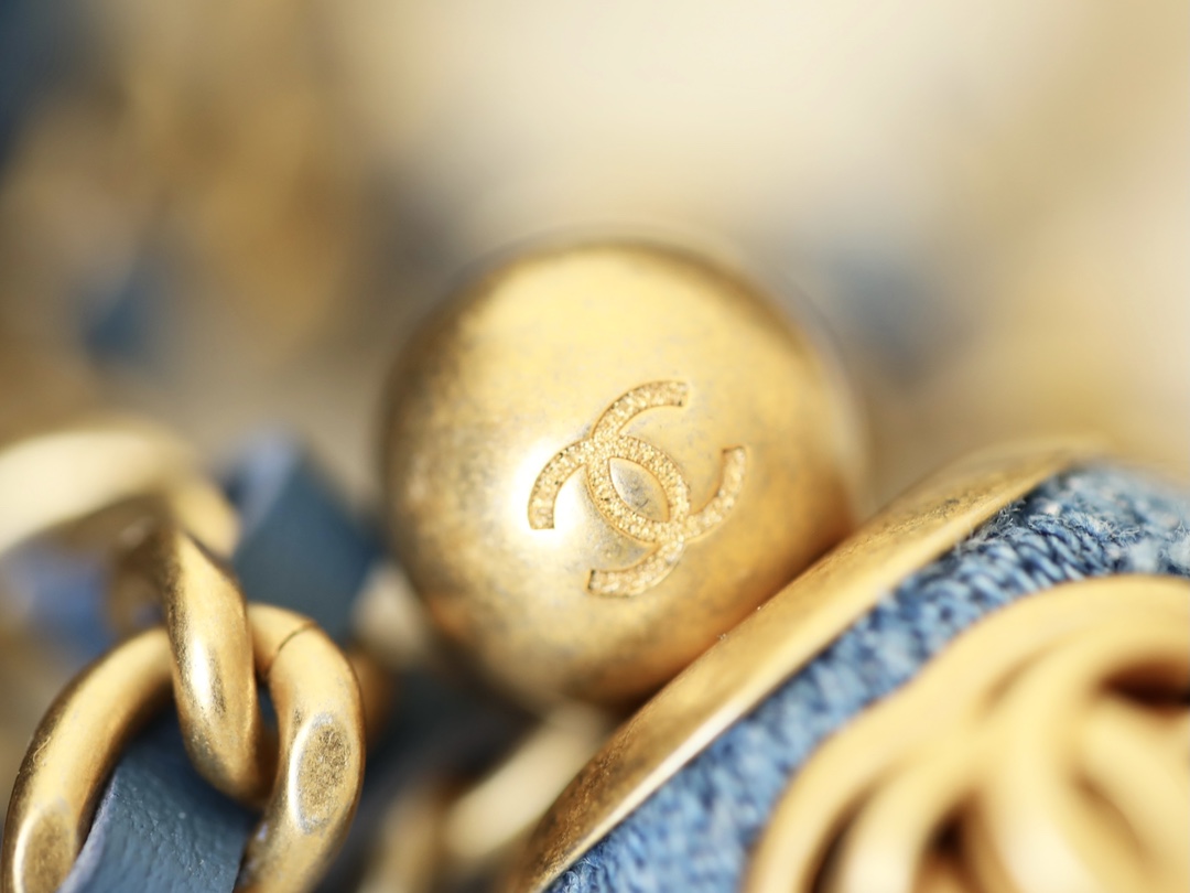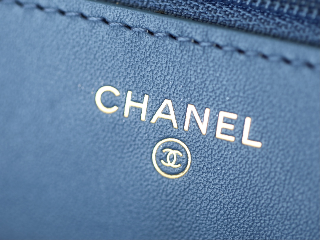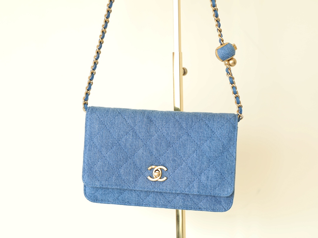 • CHANEL Quilted Pearl Crush Wallet on Chain WOC Denim Aged Gold Hardware
