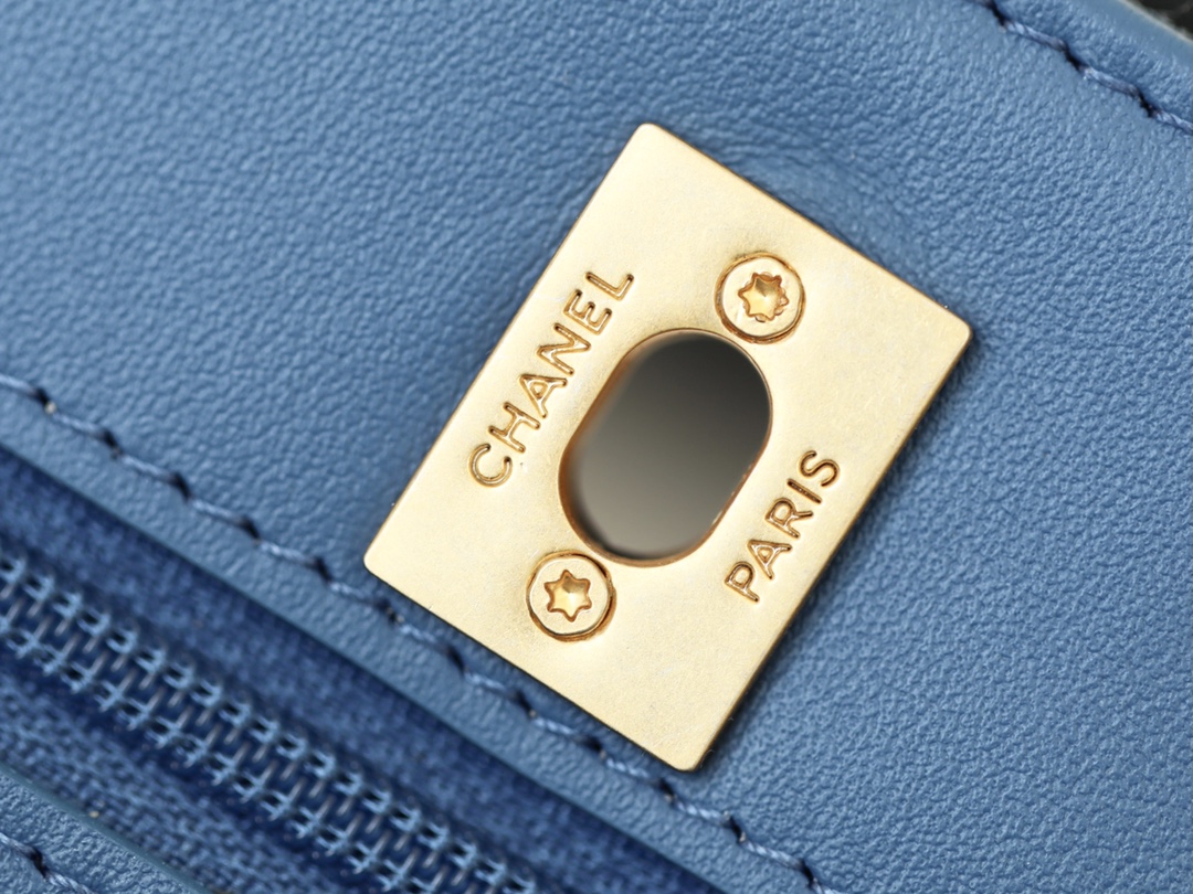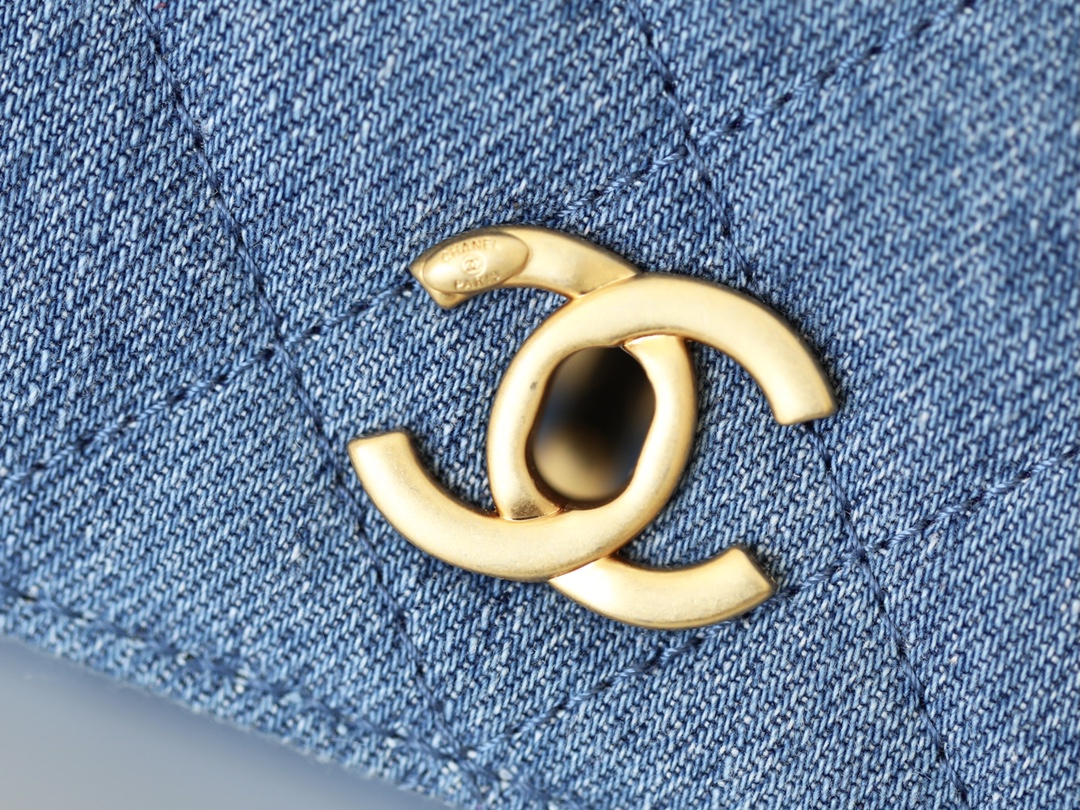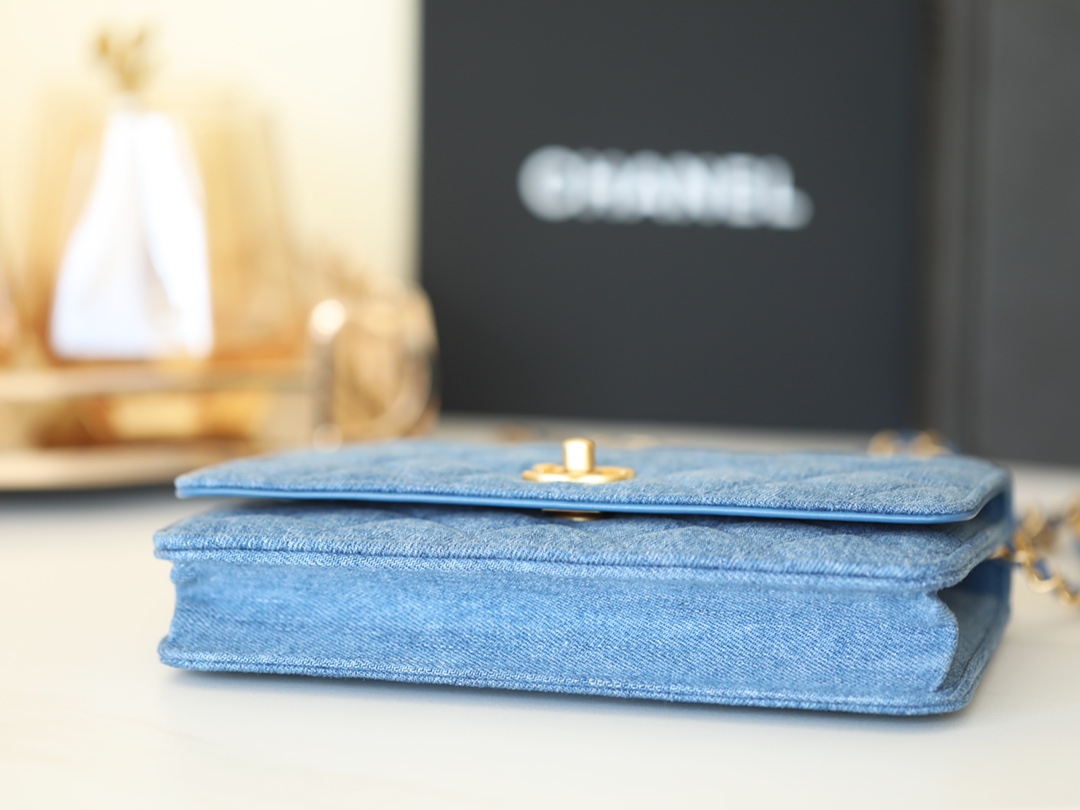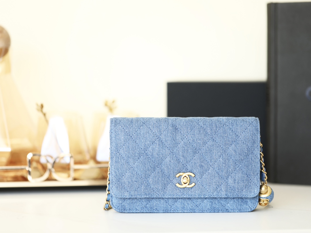 CHANEL Quilted Pearl Crush Wallet on Chain WOC Denim Aged Gold Hardware