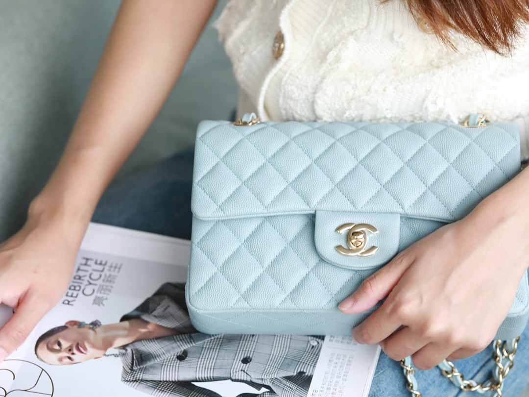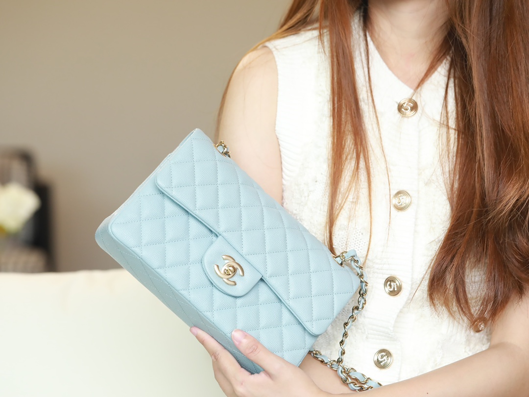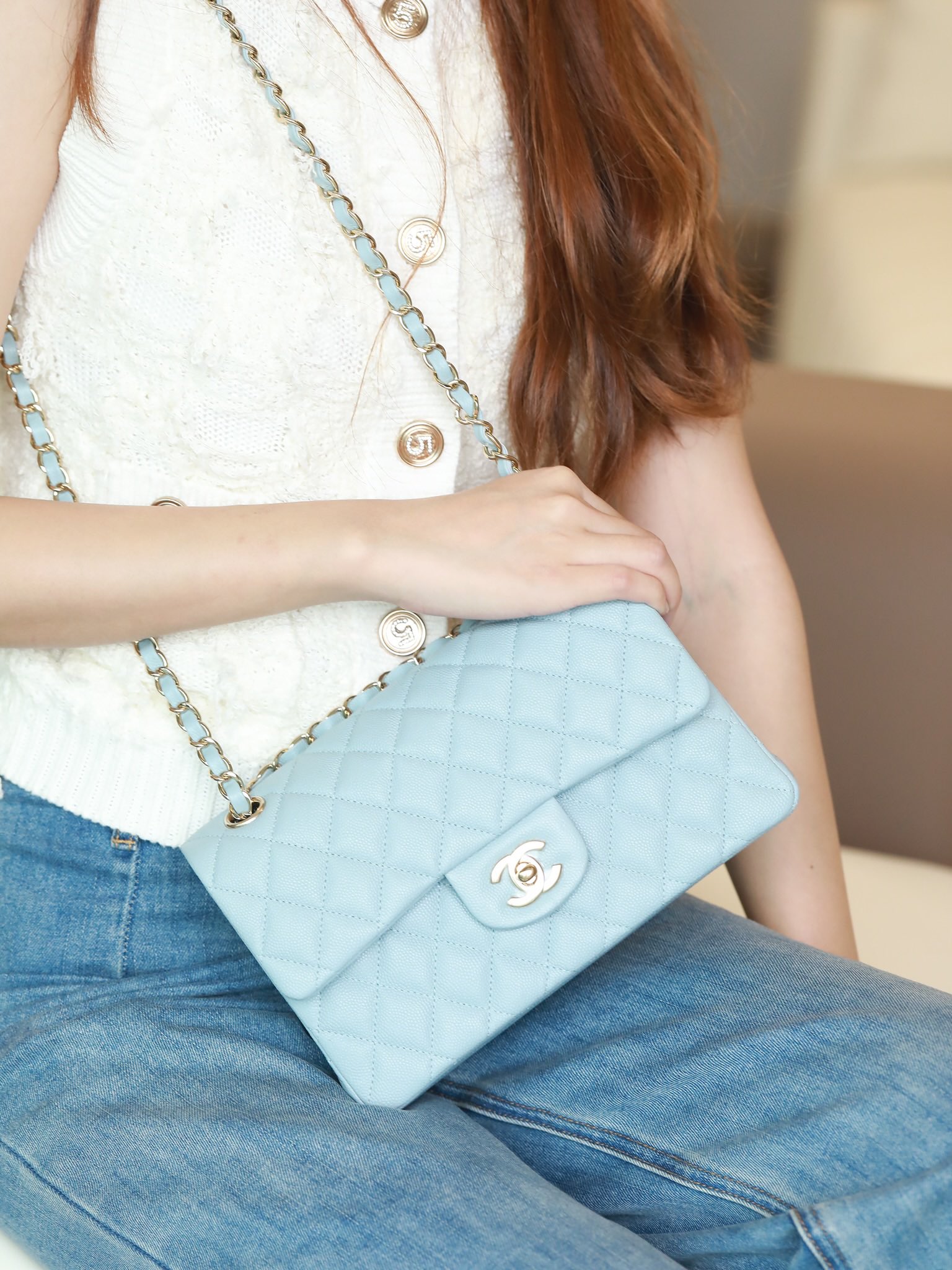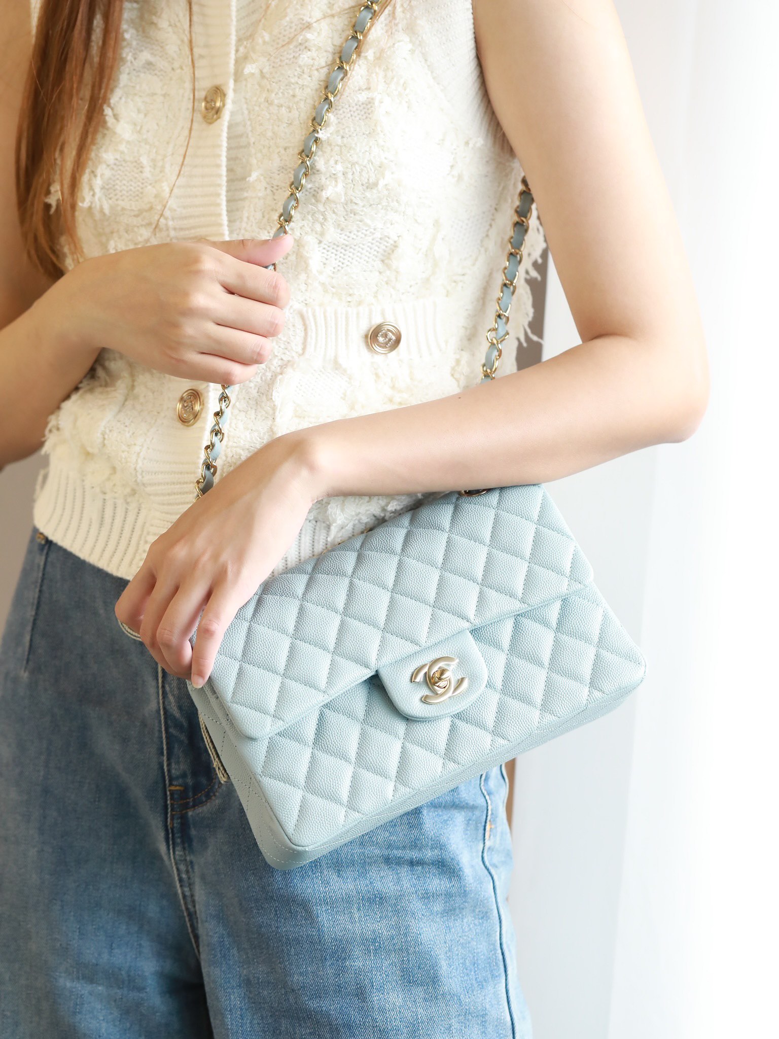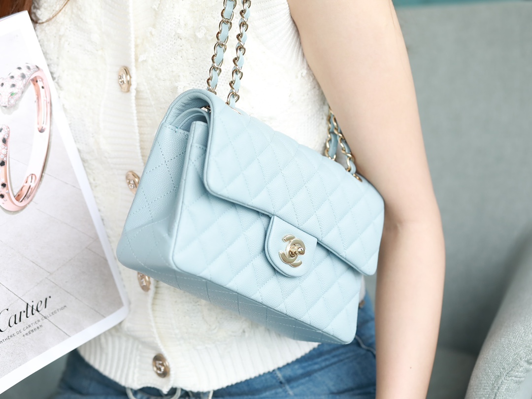 • CHANEL Small Classic Double Flap baby blue Caviar Light Gold Hardware