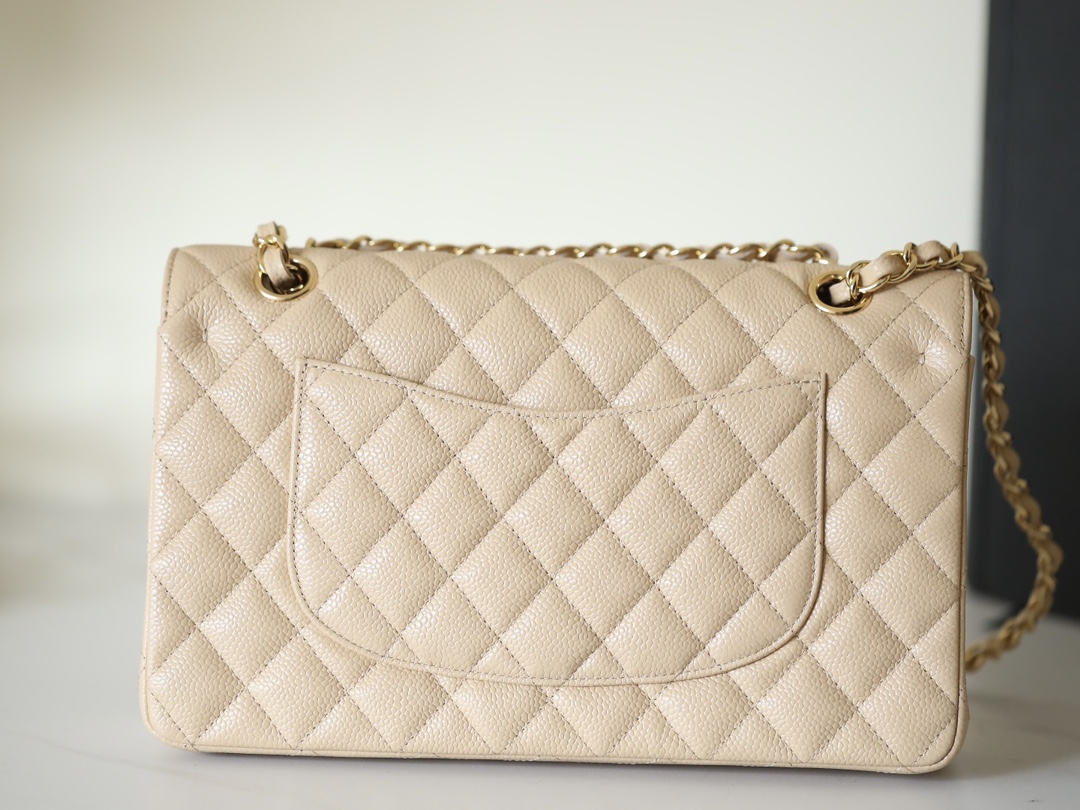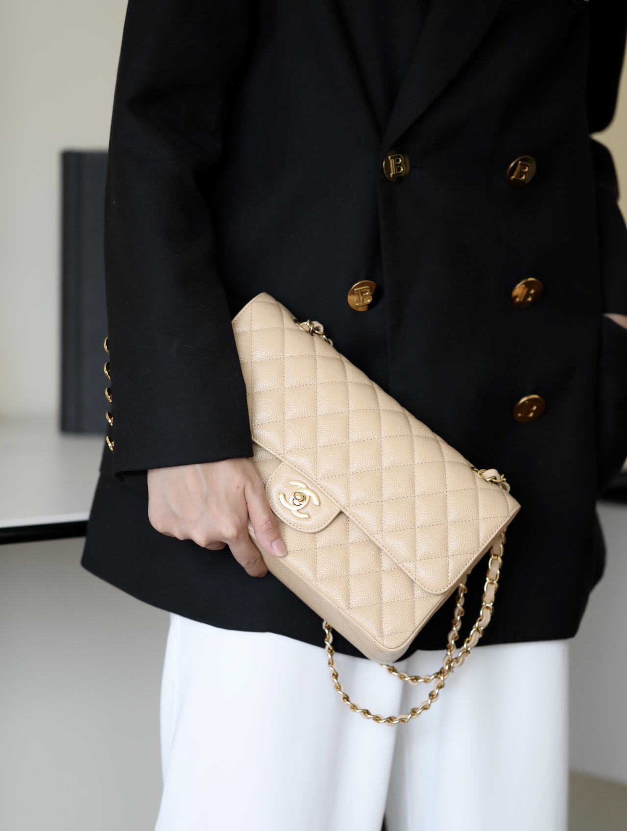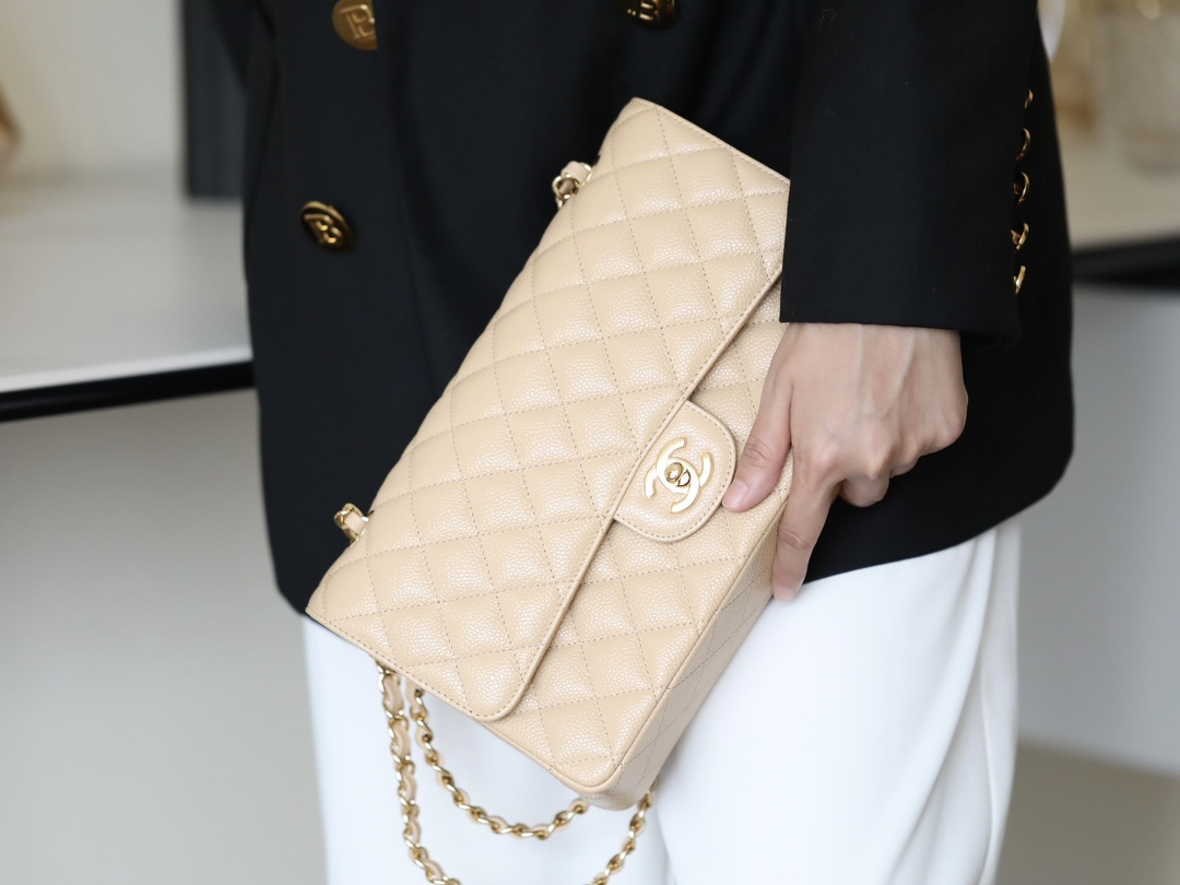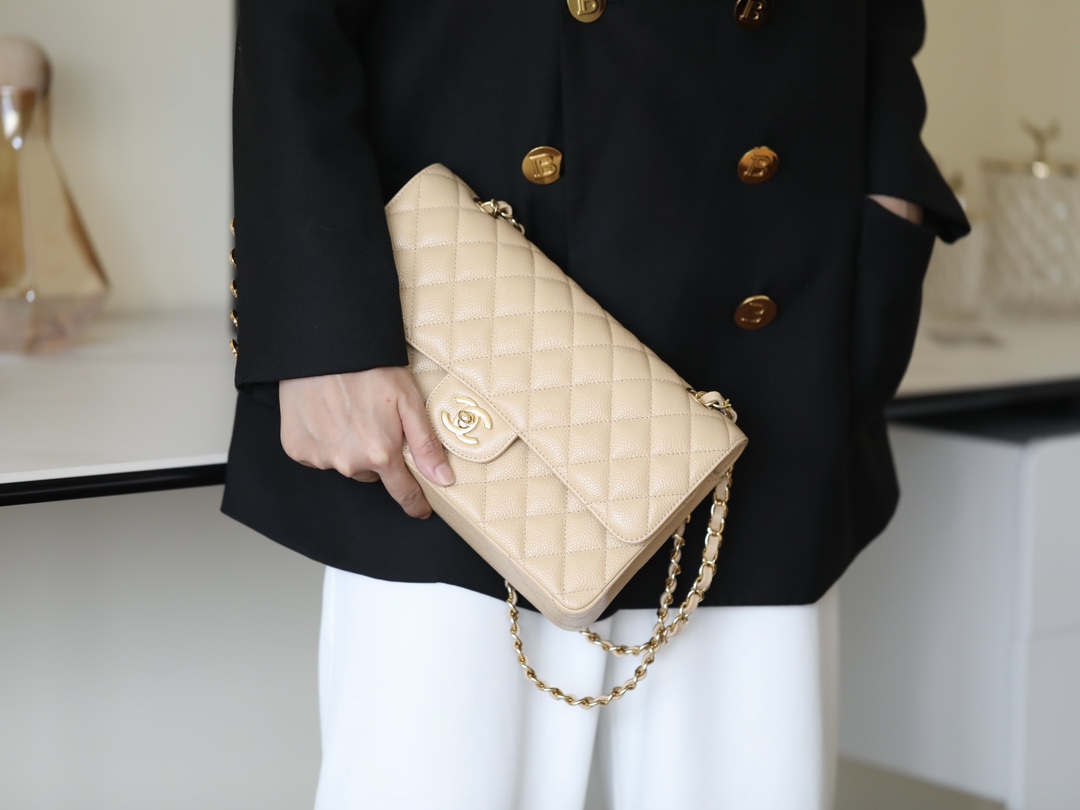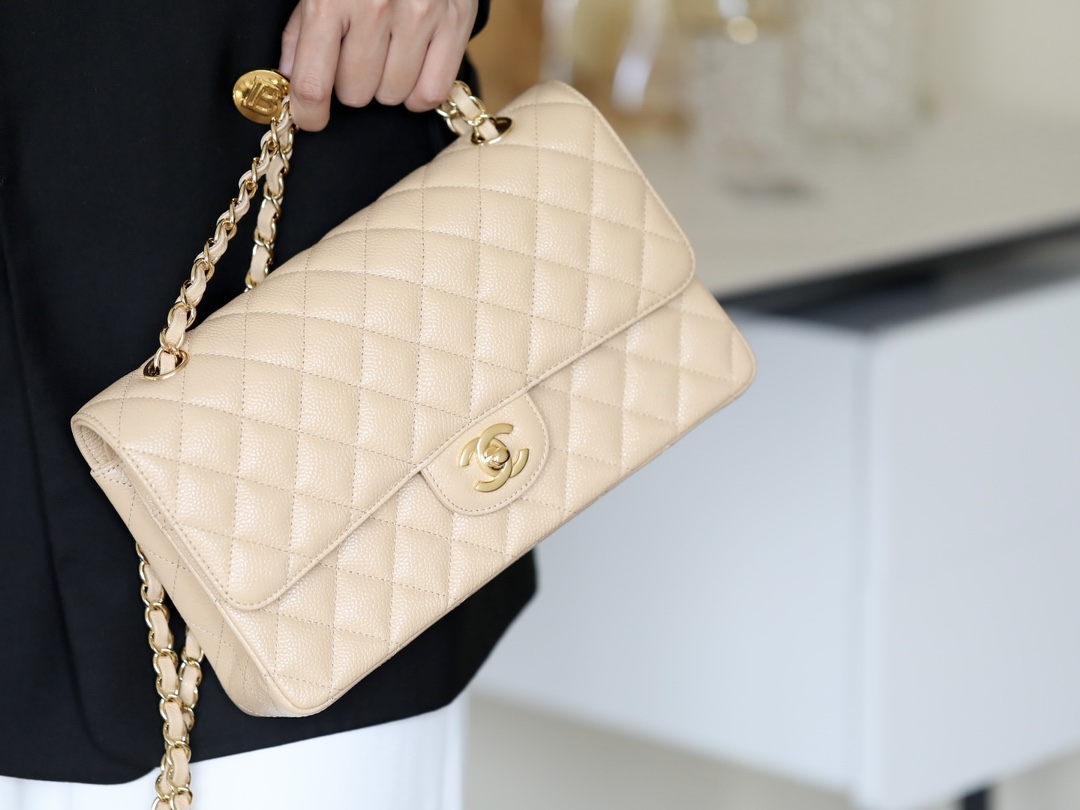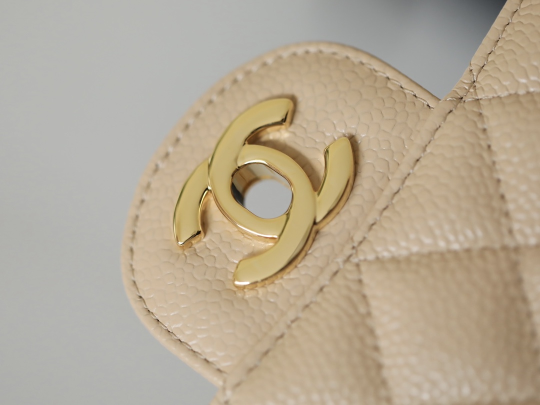 • CHANEL Small Classic Double Flap Creamy Apricot Caviar Light Gold Hardware