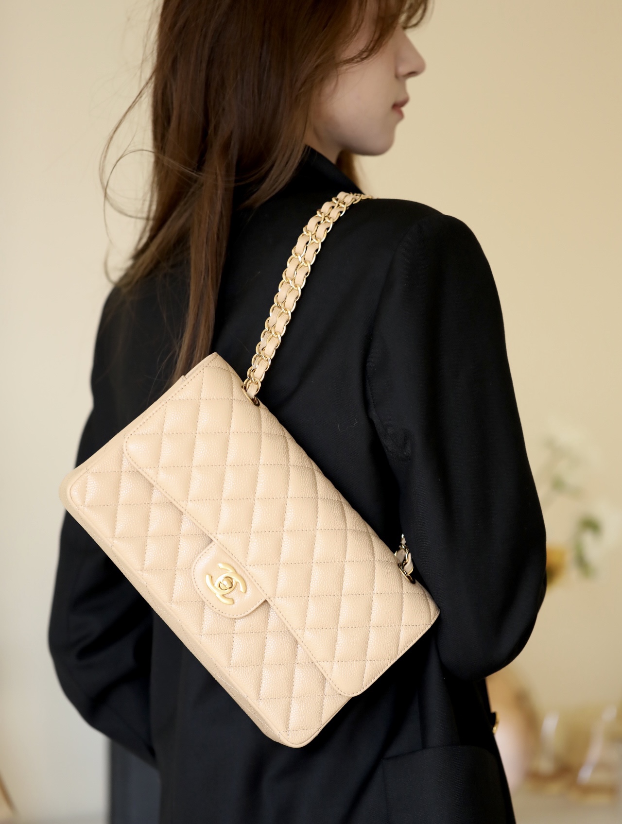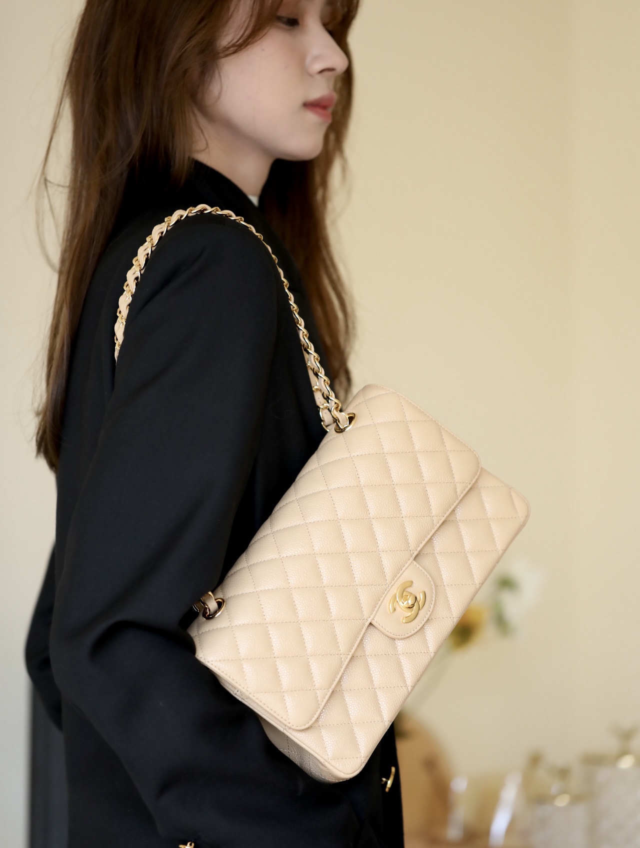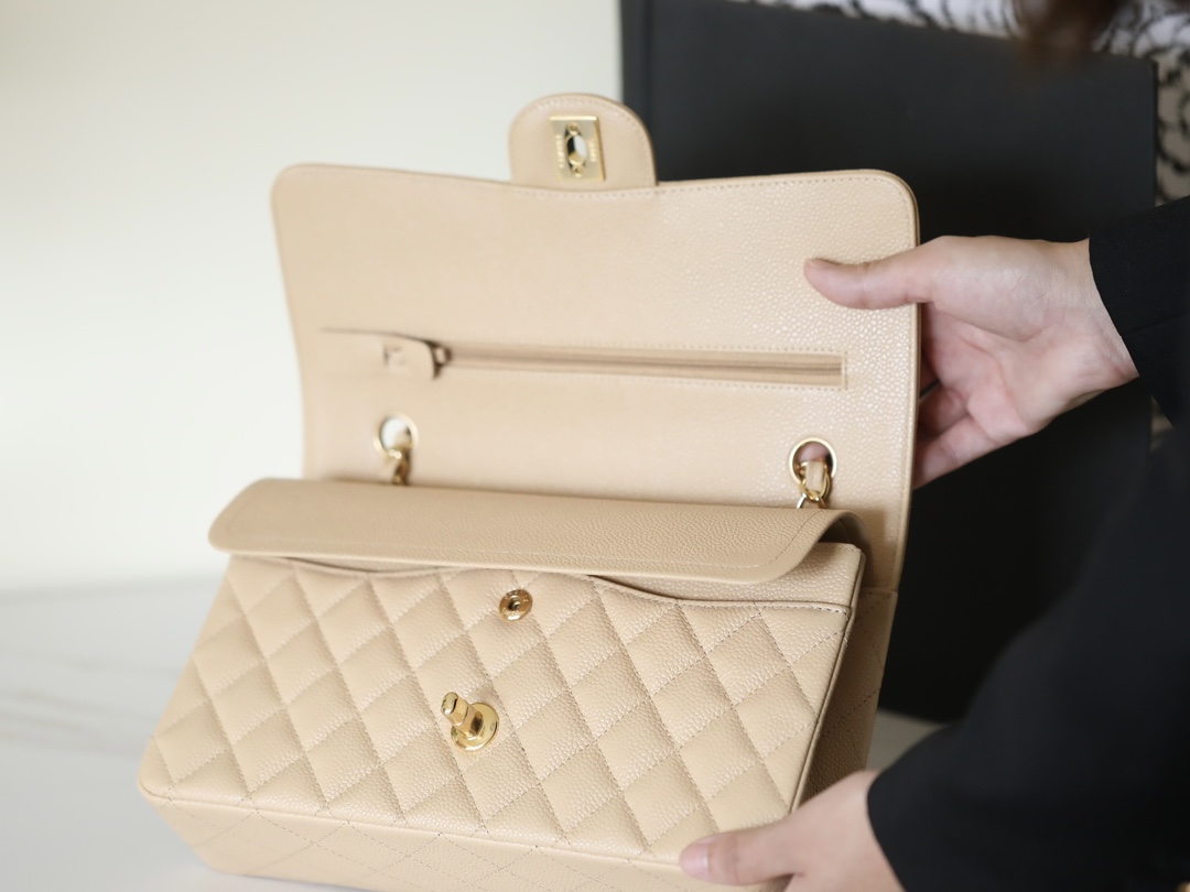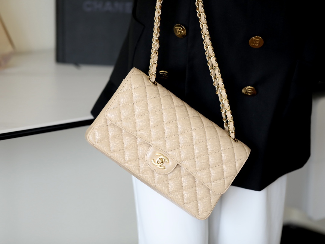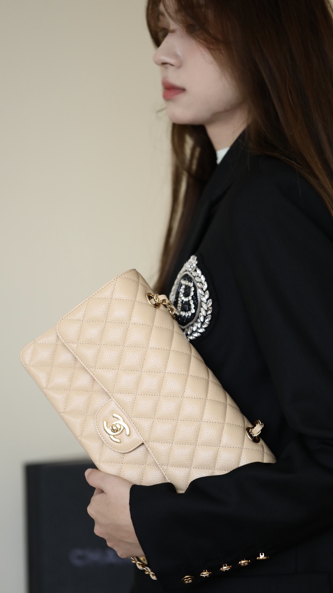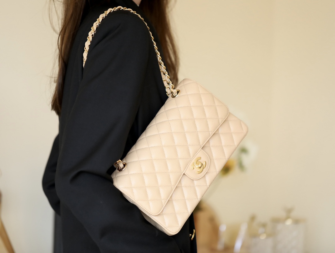 • CHANEL Small Classic Double Flap Creamy Apricot Caviar Light Gold Hardware
