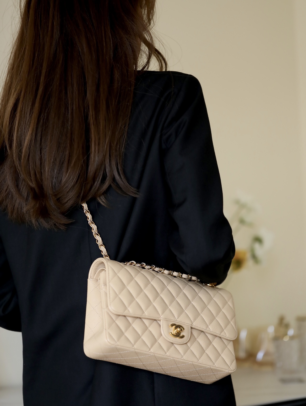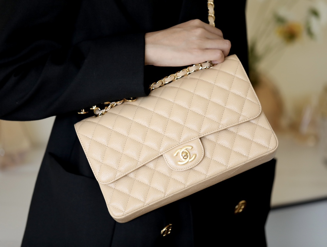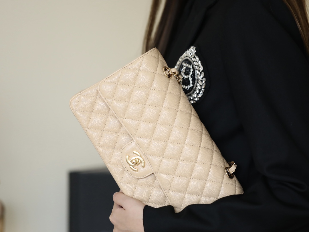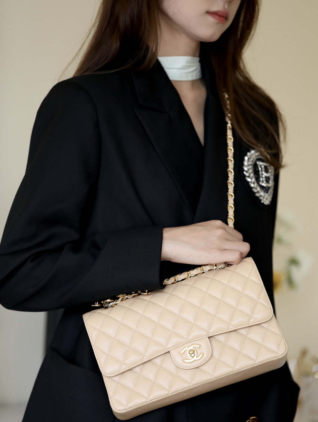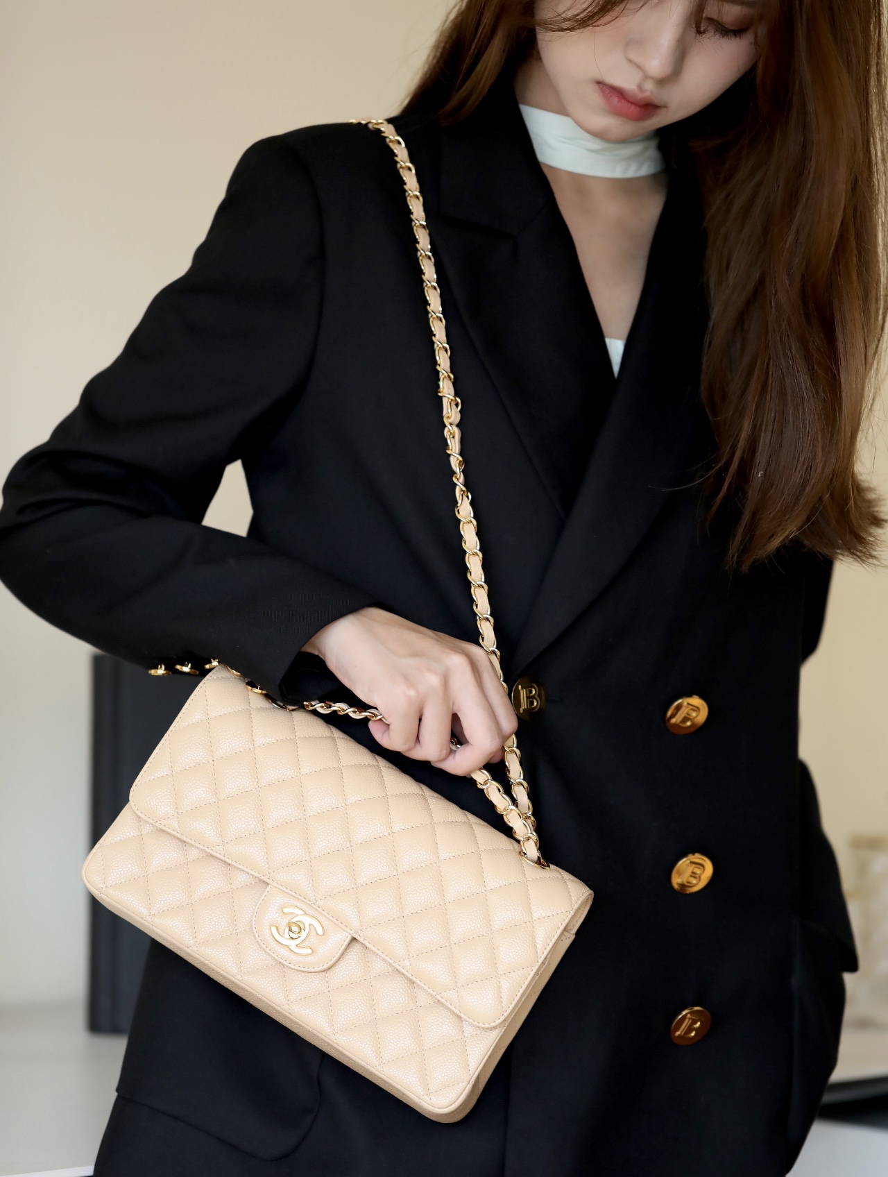 • CHANEL Small Classic Double Flap Creamy Apricot Caviar Light Gold Hardware
