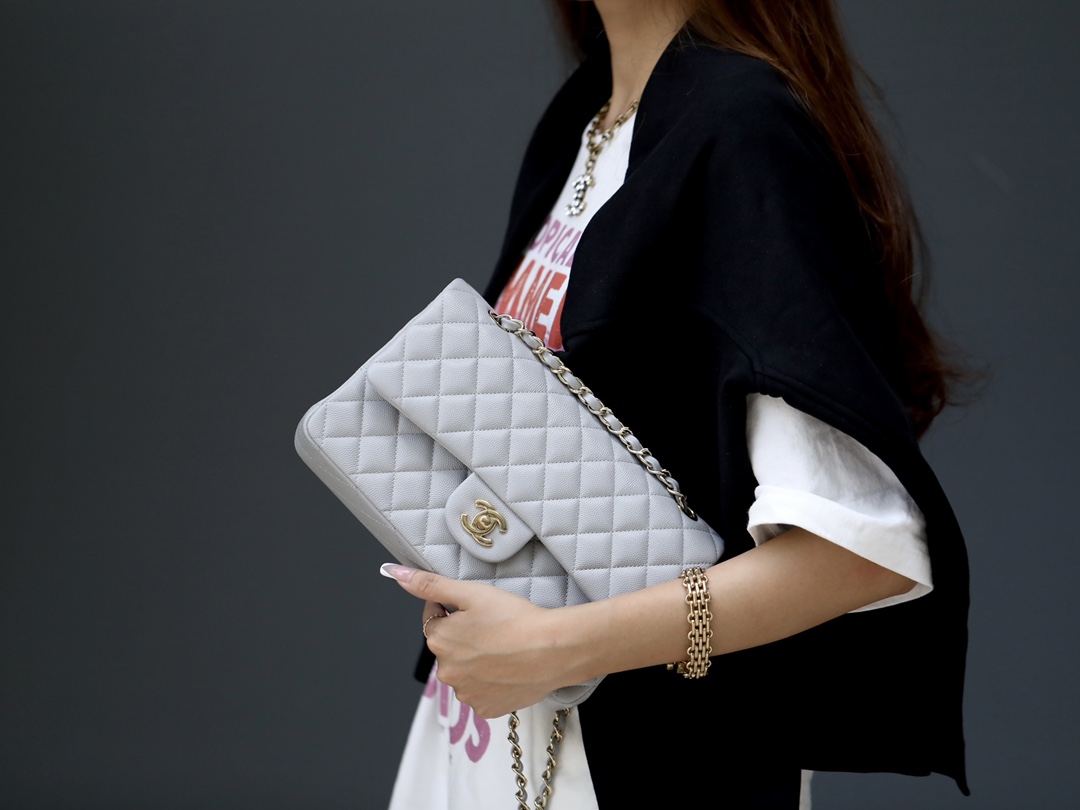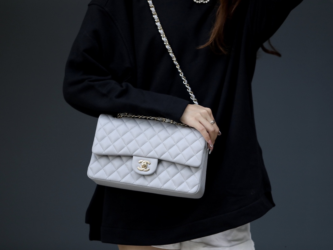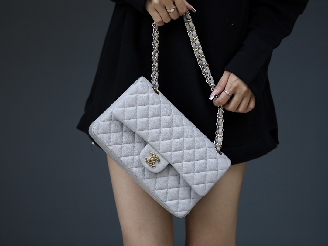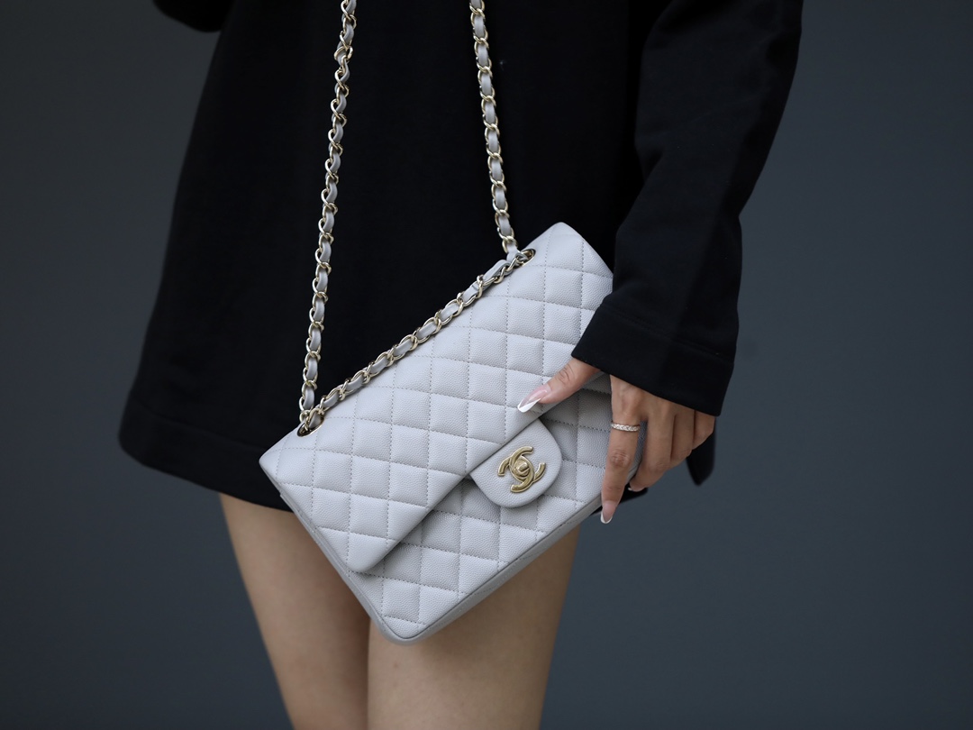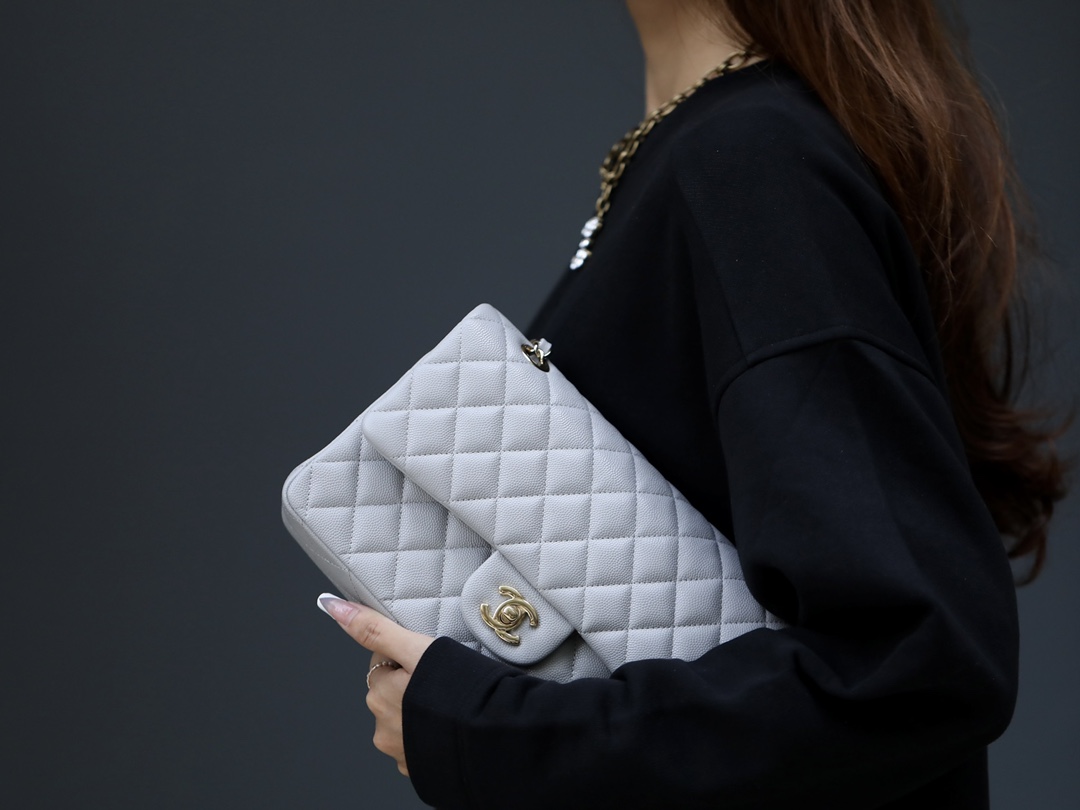 • CHANEL Small Classic Double Flap Light Grey Caviar Light Gold Hardware