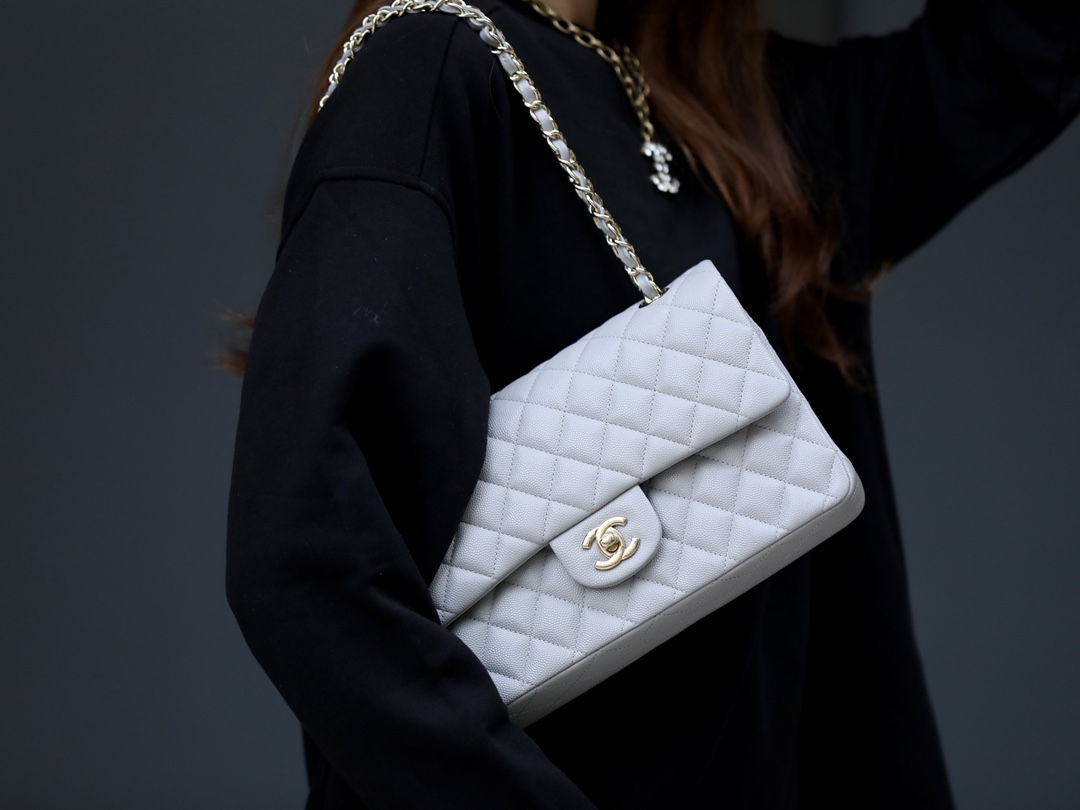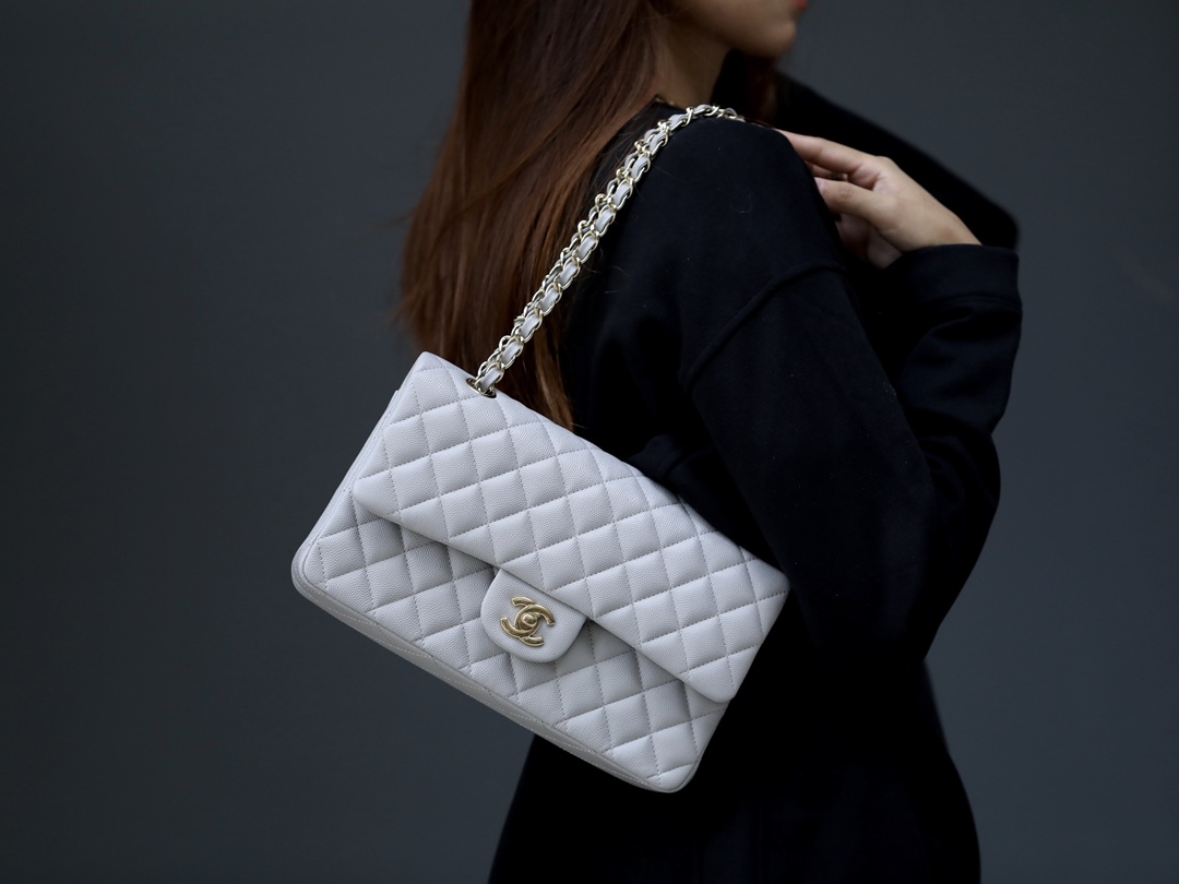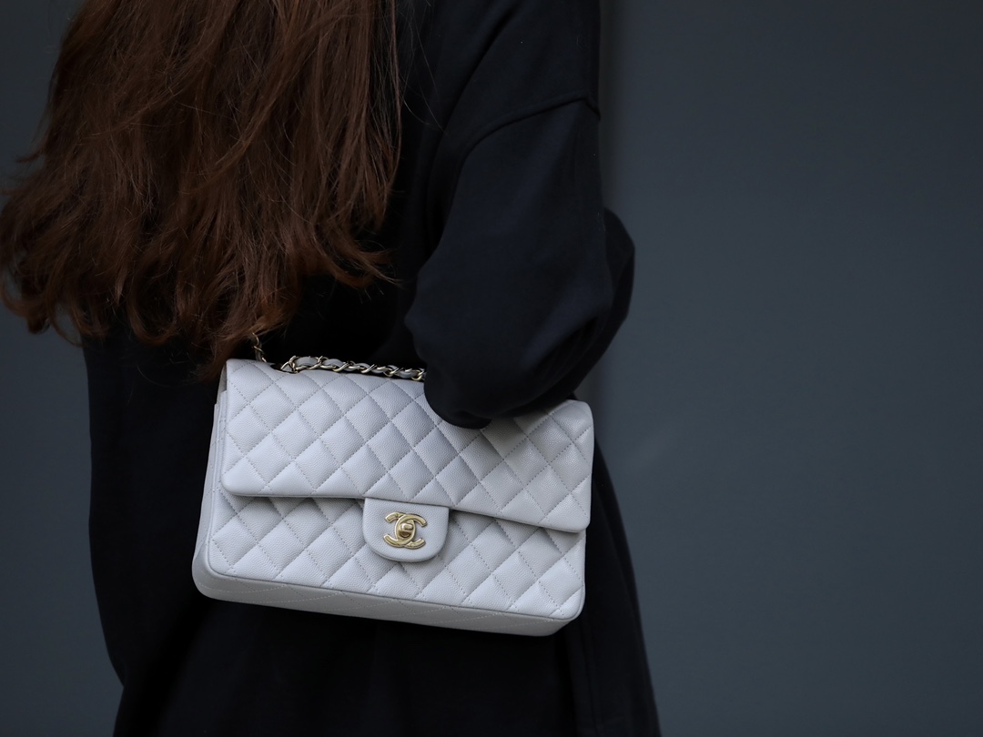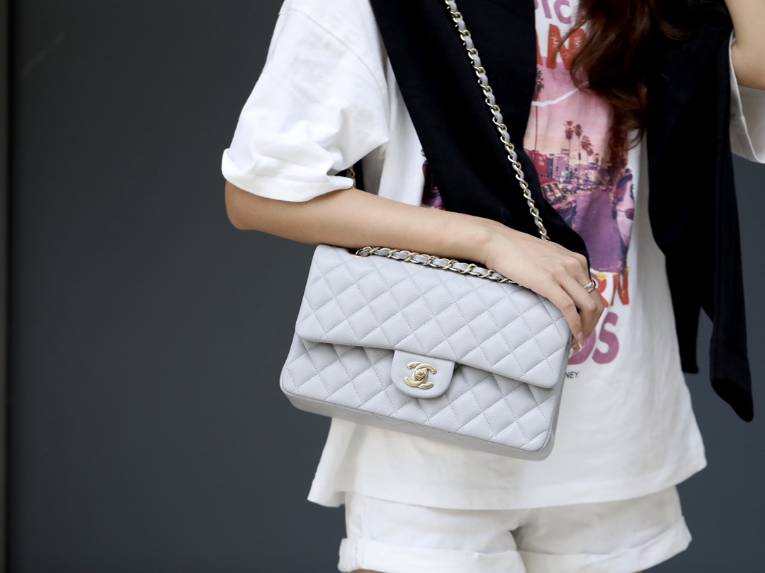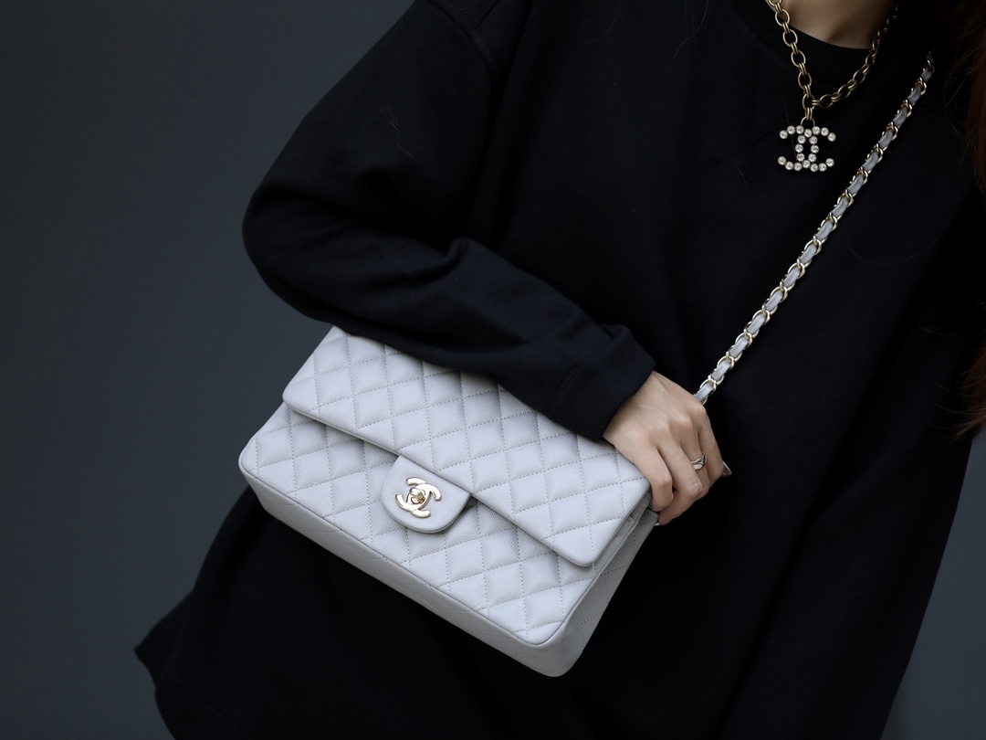 • CHANEL Small Classic Double Flap Light Grey Caviar Light Gold Hardware