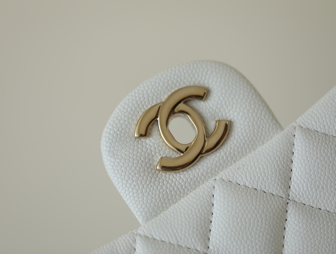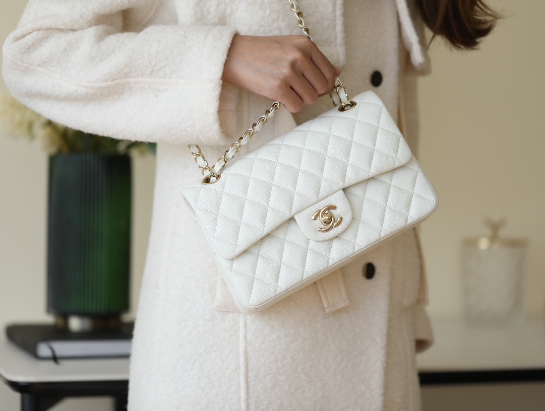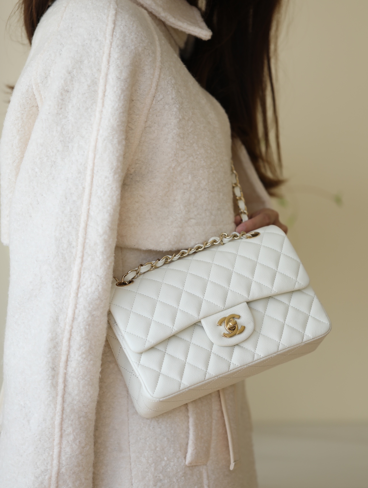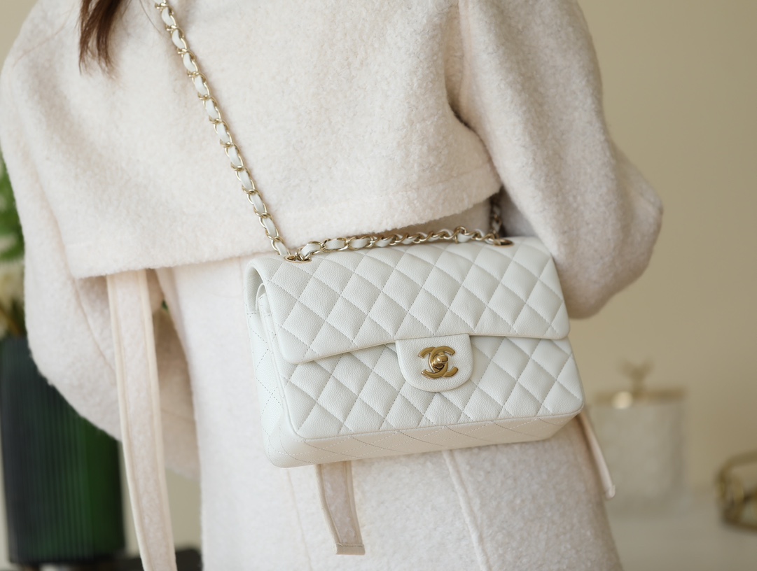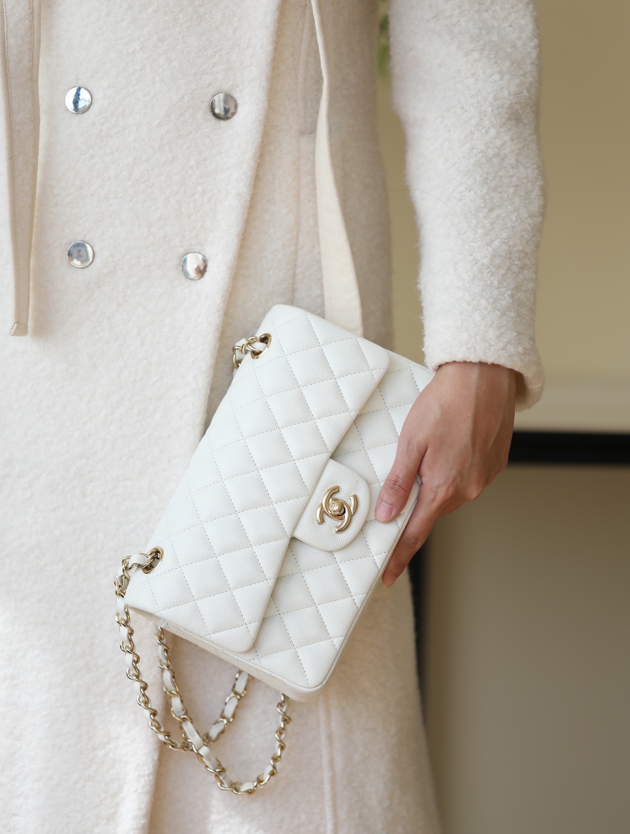 • CHANEL Small Classic Double Flap White Caviar Light Gold Hardware