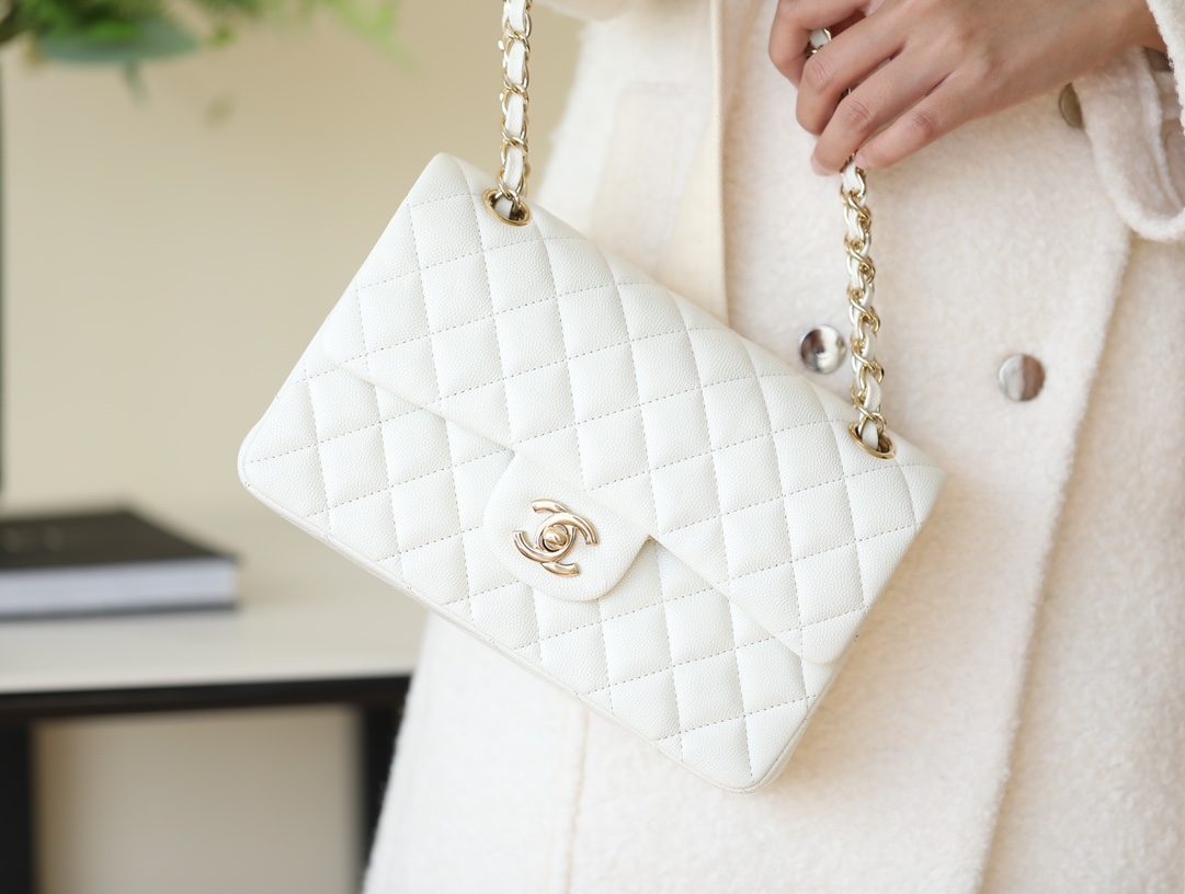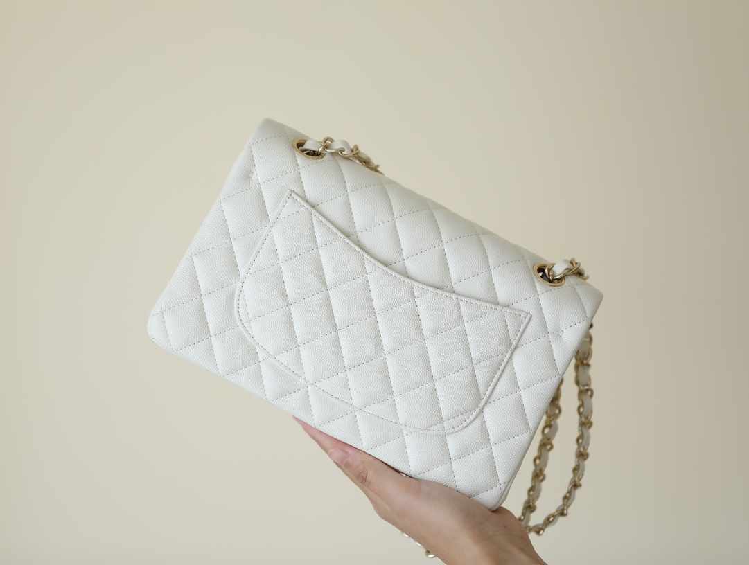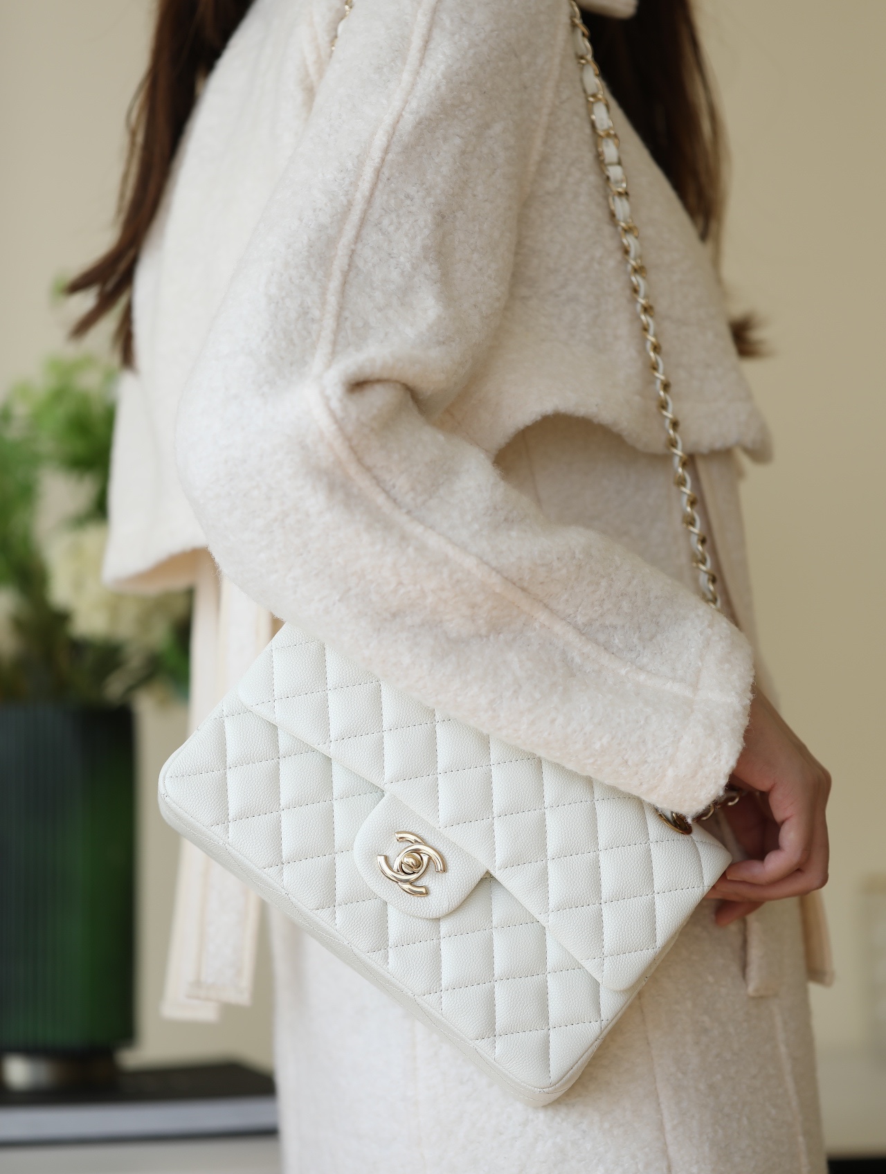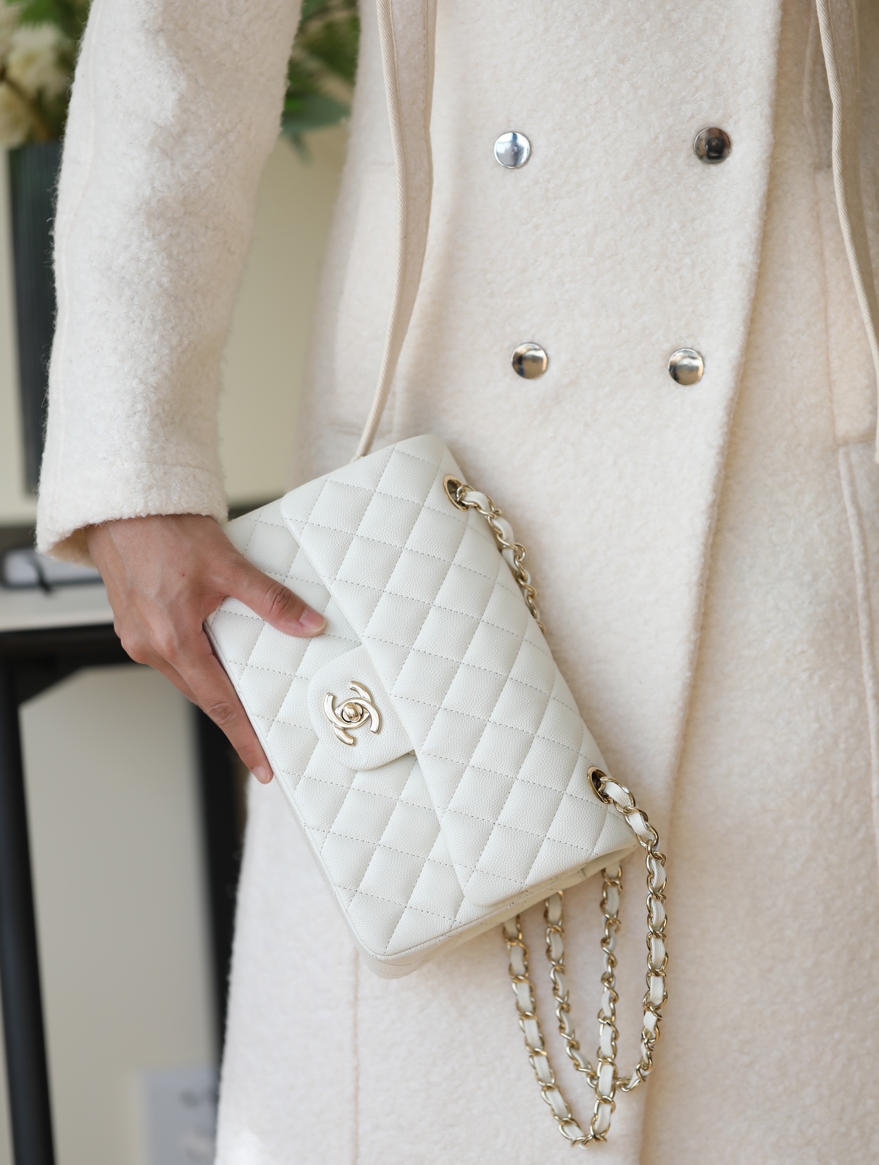• CHANEL Small Classic Double Flap White Caviar Light Gold Hardware