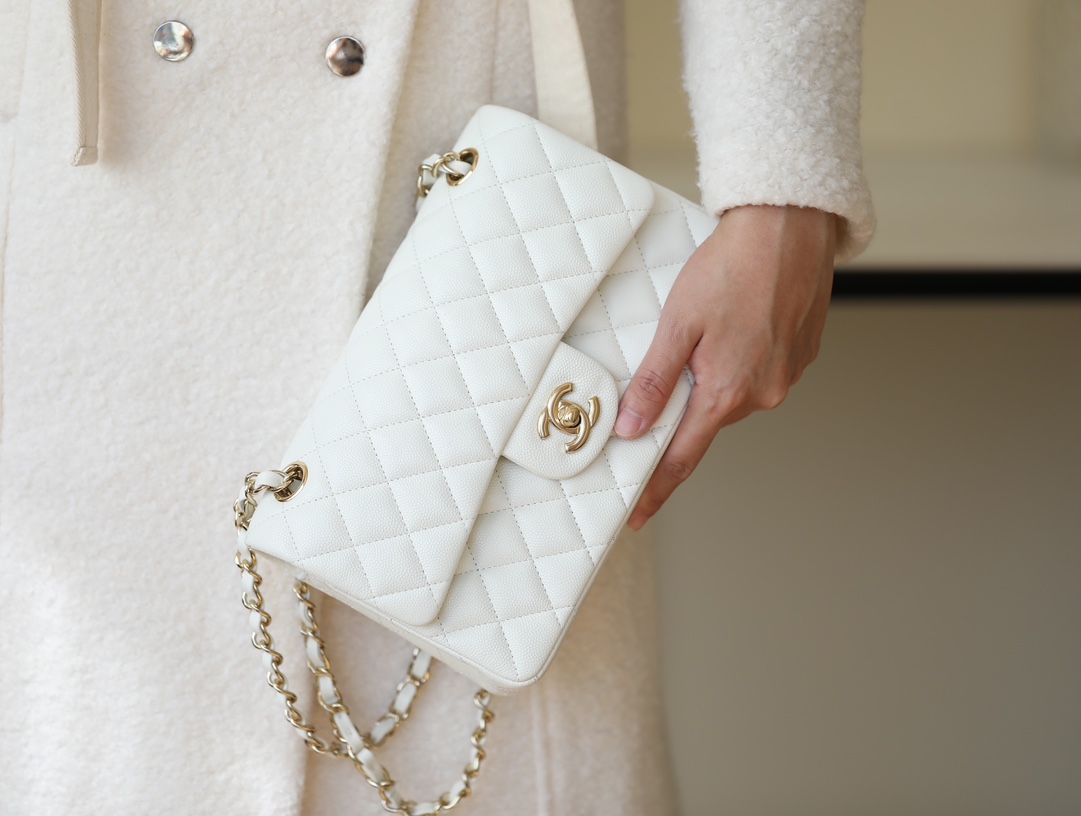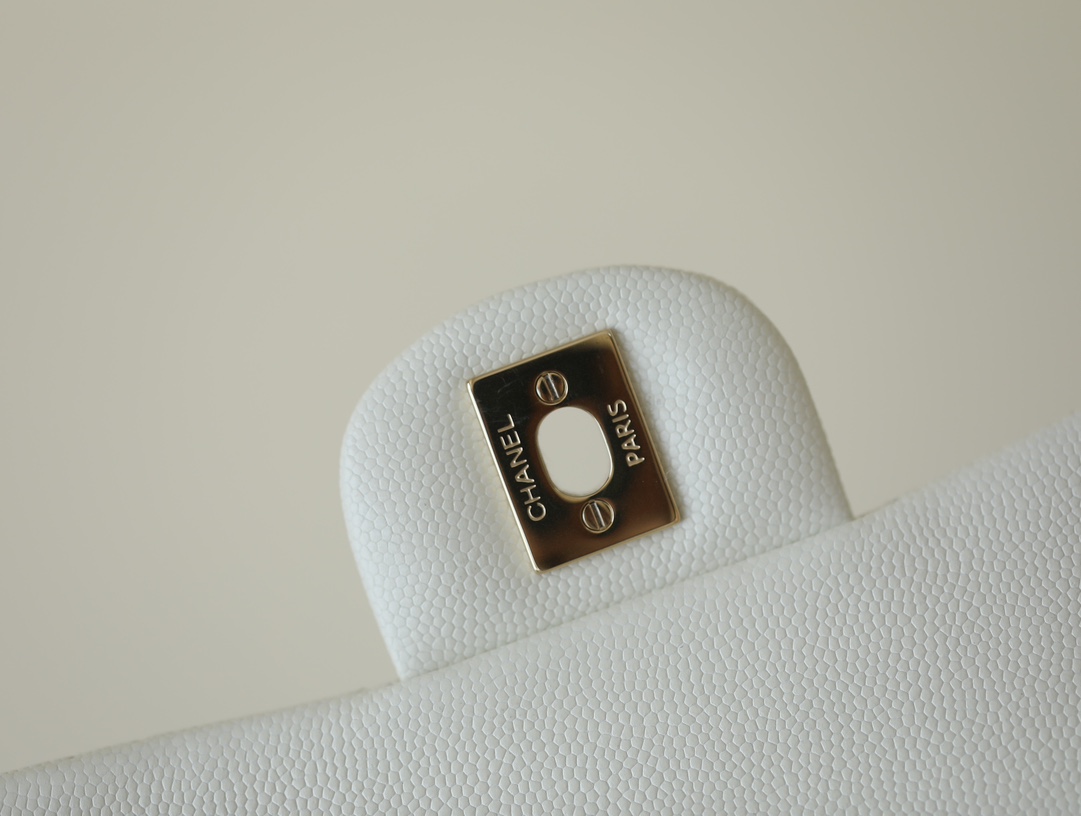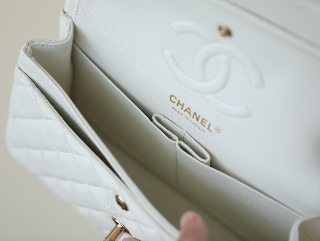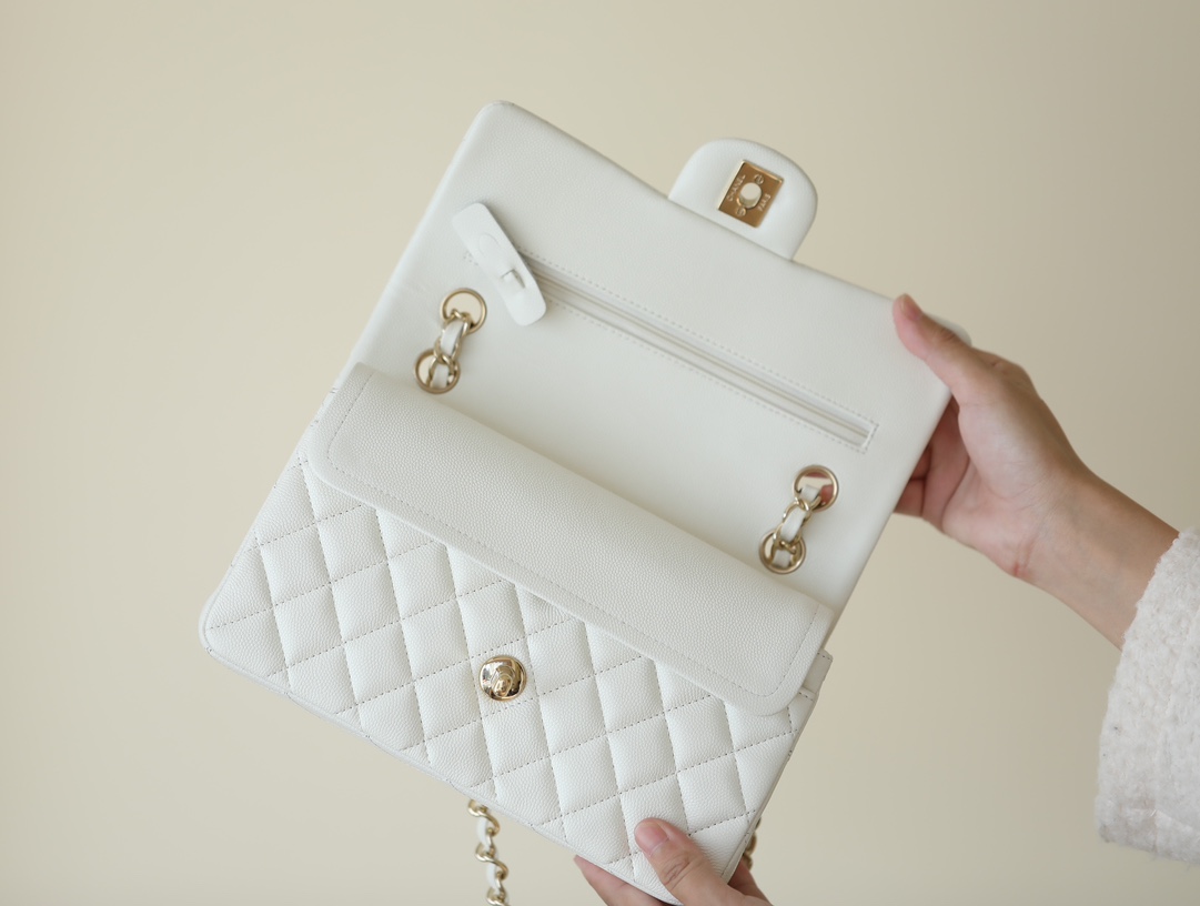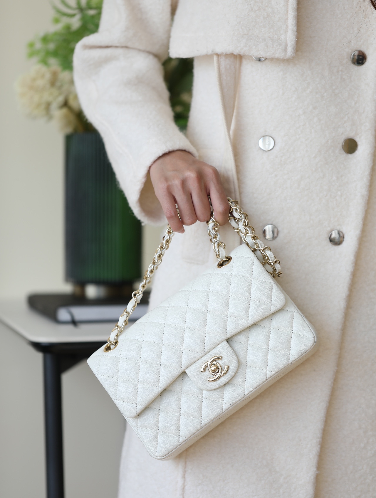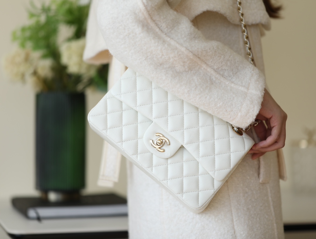 • CHANEL Small Classic Double Flap White Caviar Light Gold Hardware