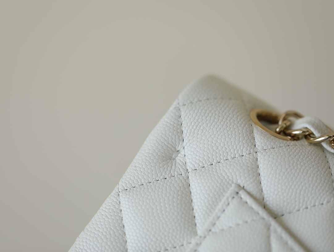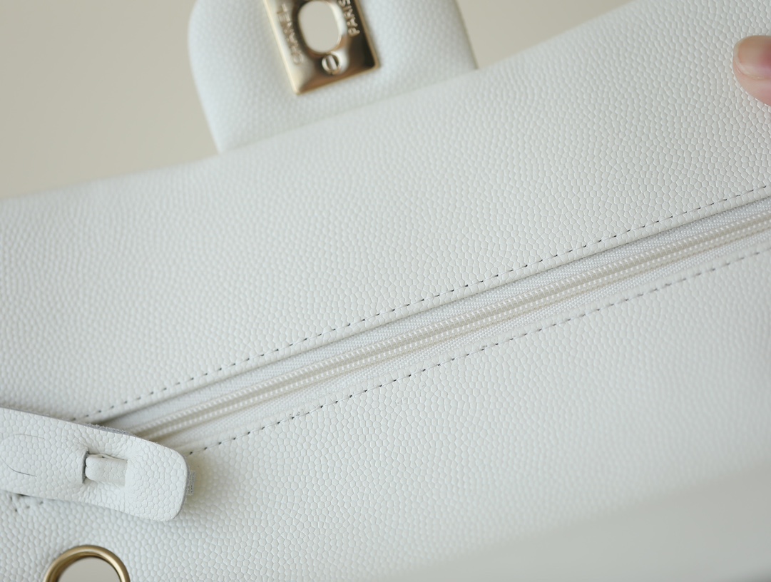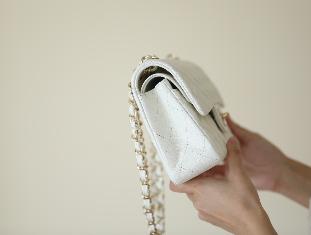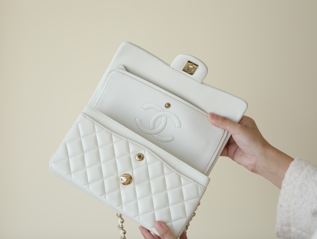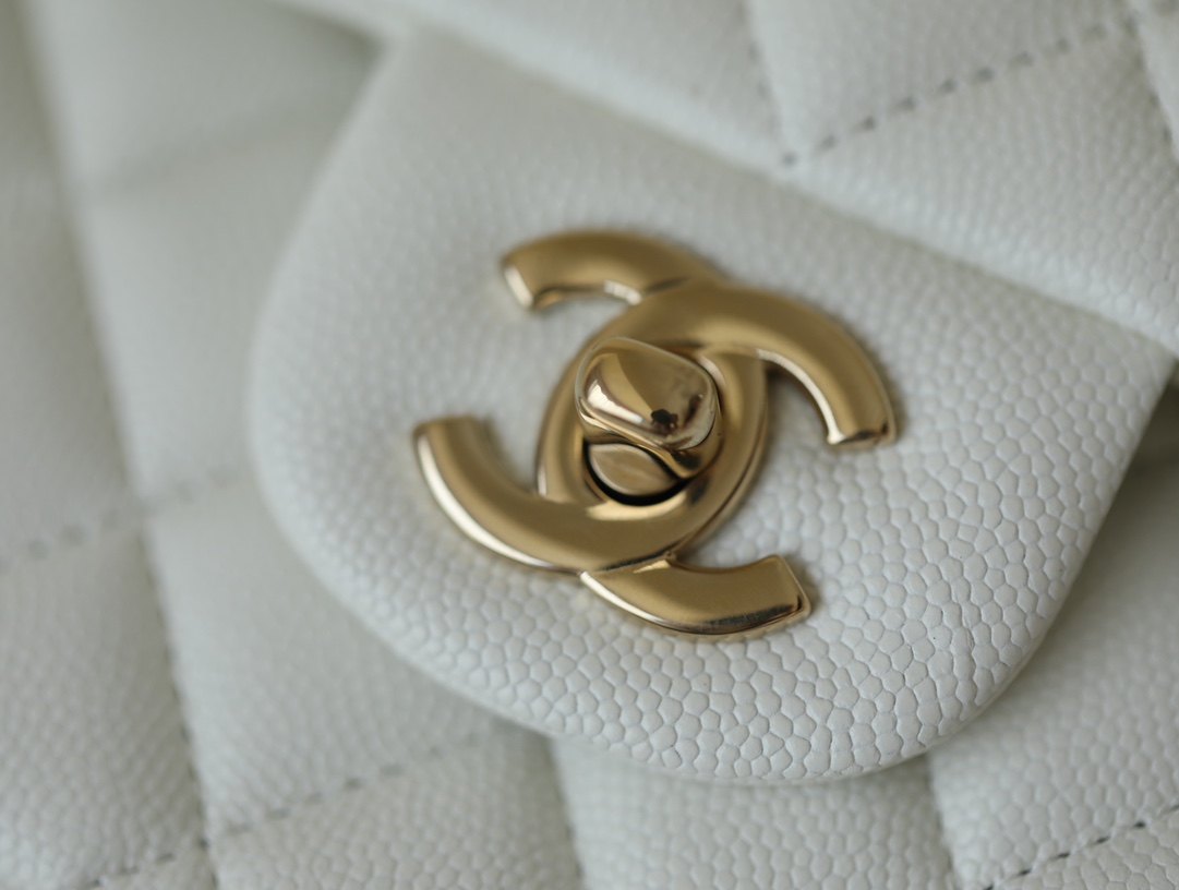 • CHANEL Small Classic Double Flap White Caviar Light Gold Hardware