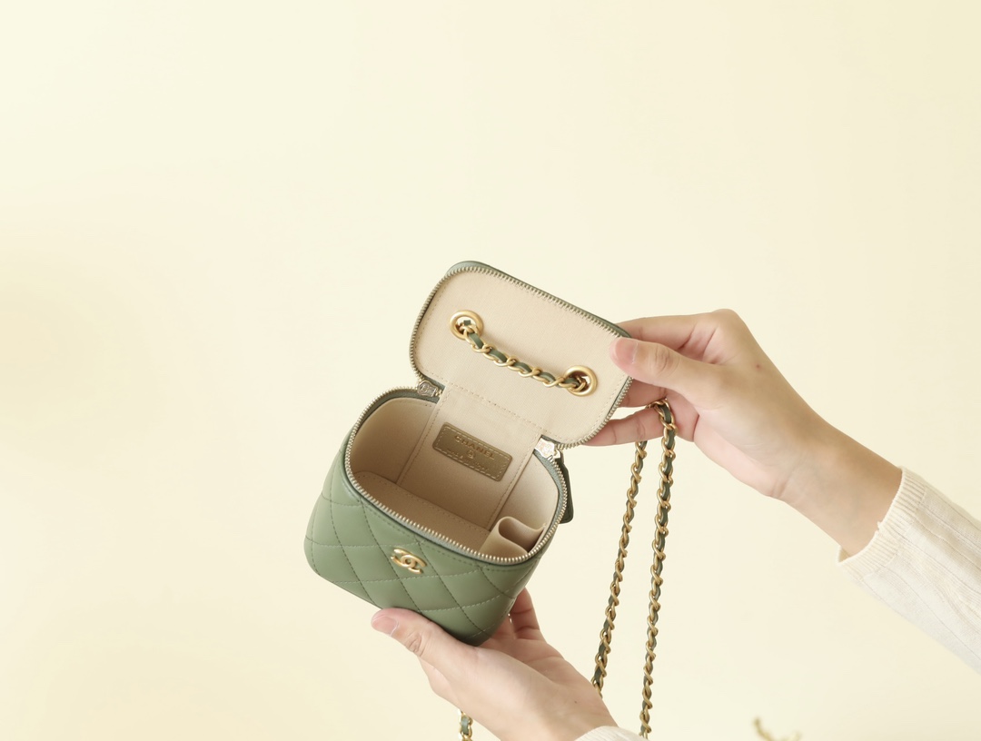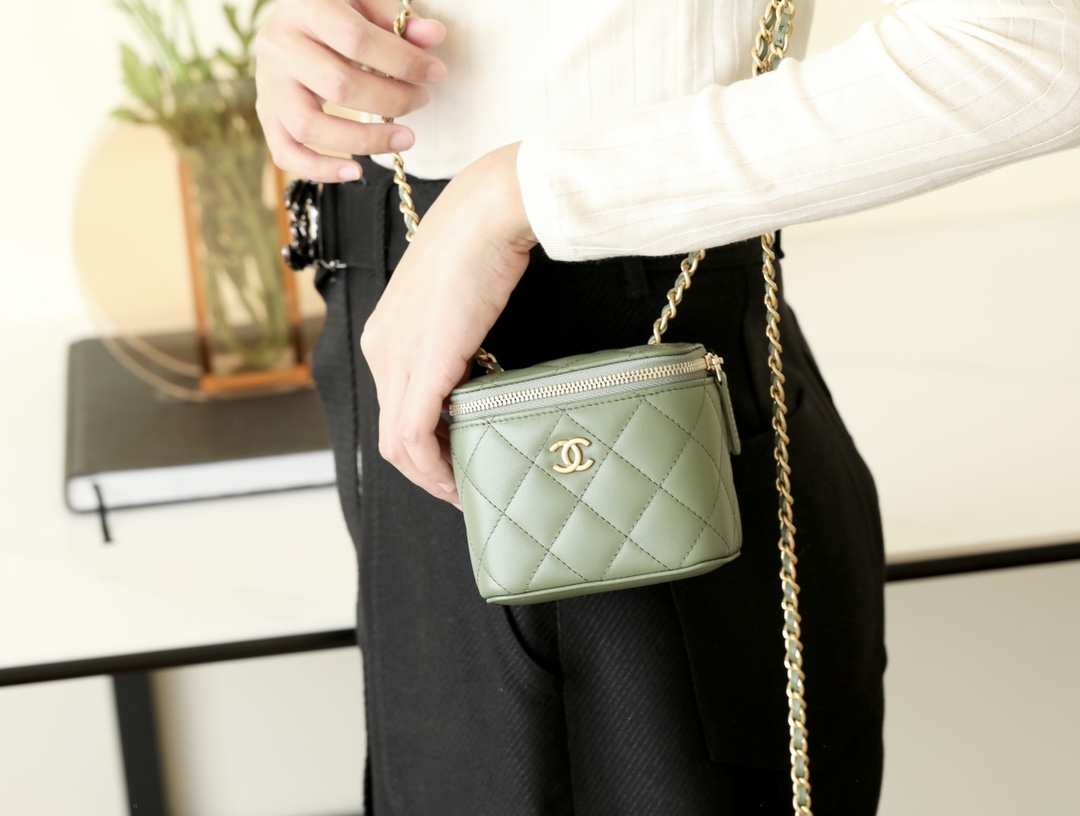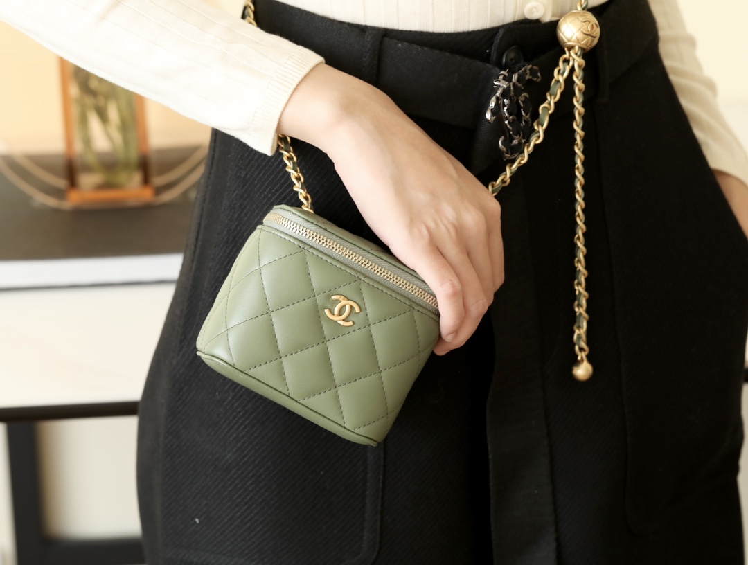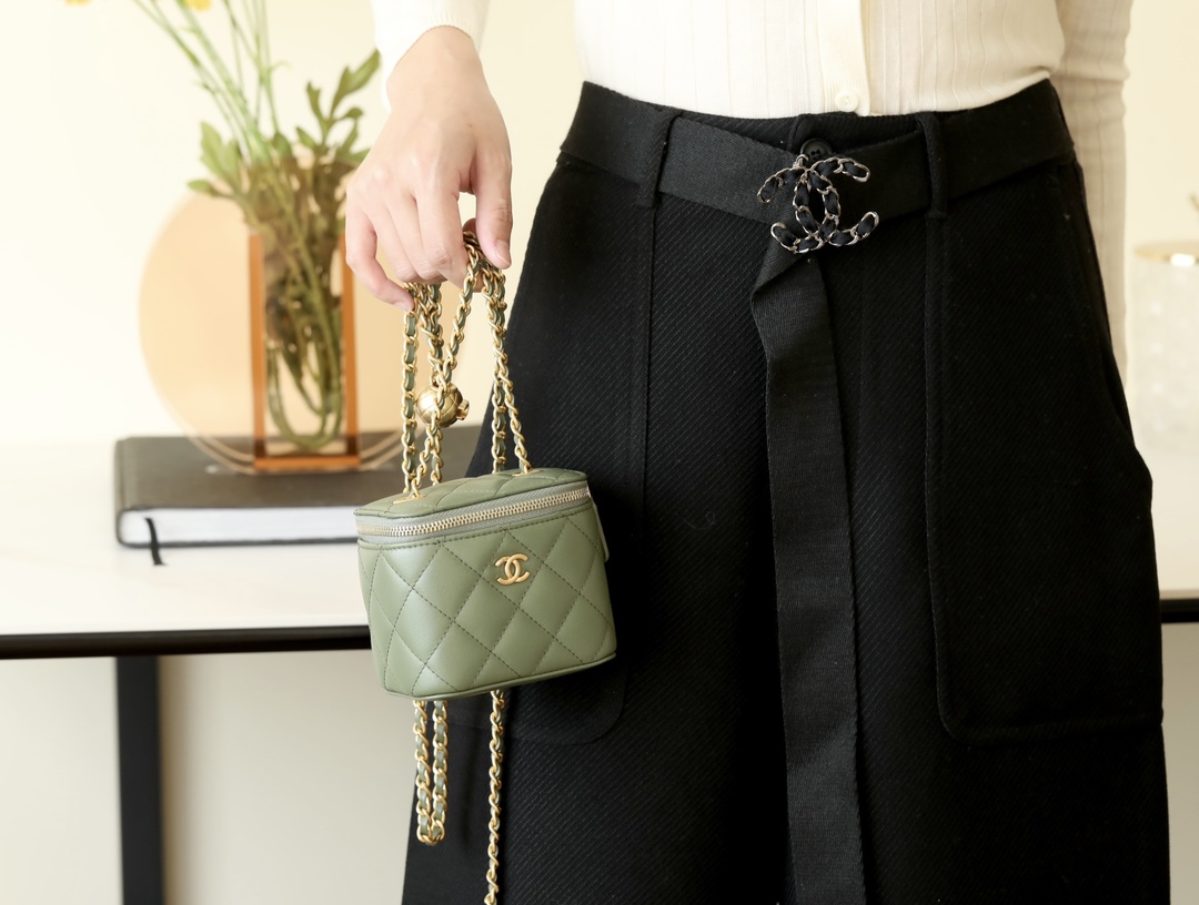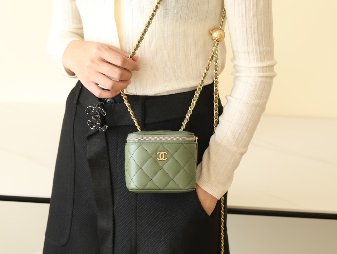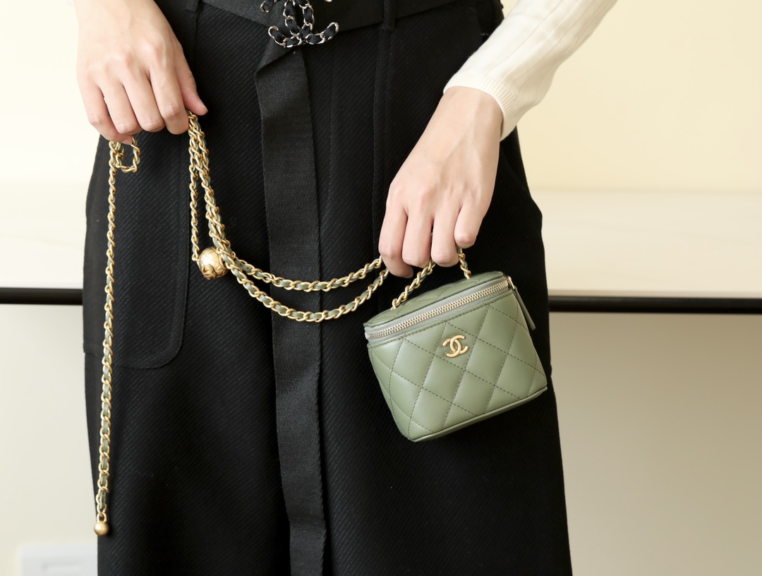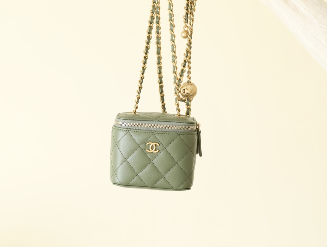 • CHANEL Spring-Summer Mini Classic Box With Gold Ball Lambskin olive green