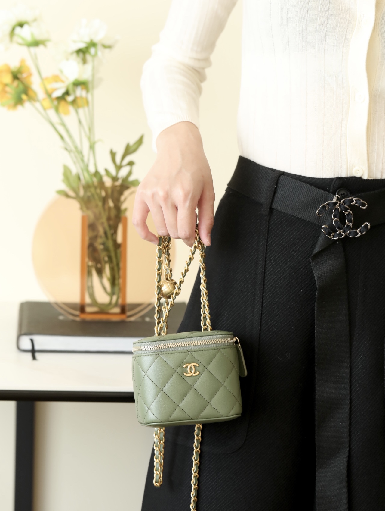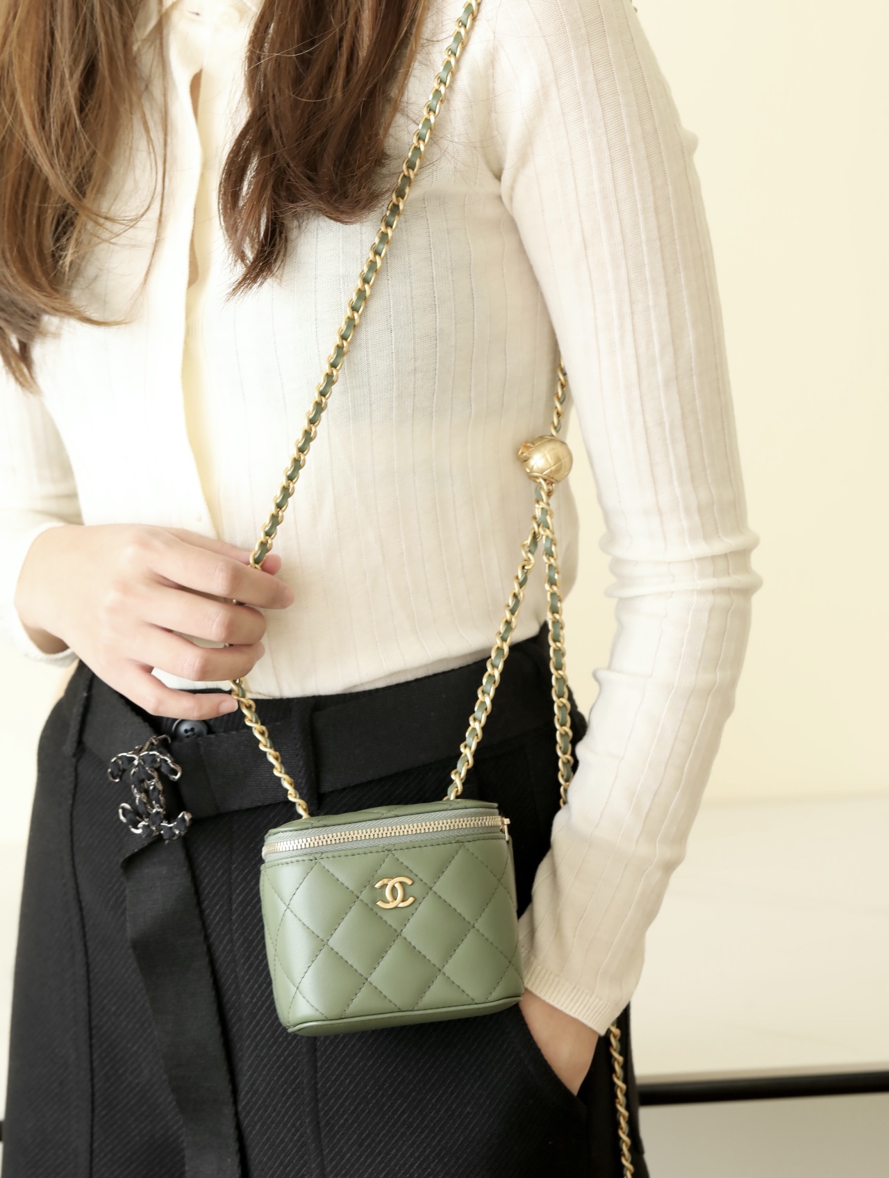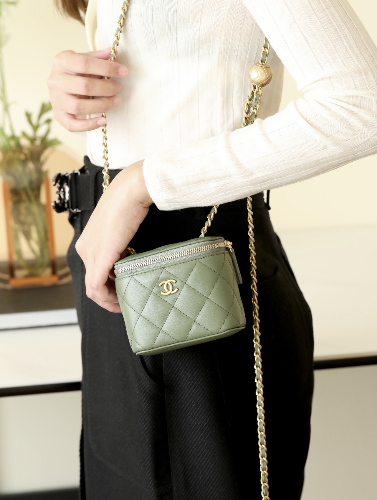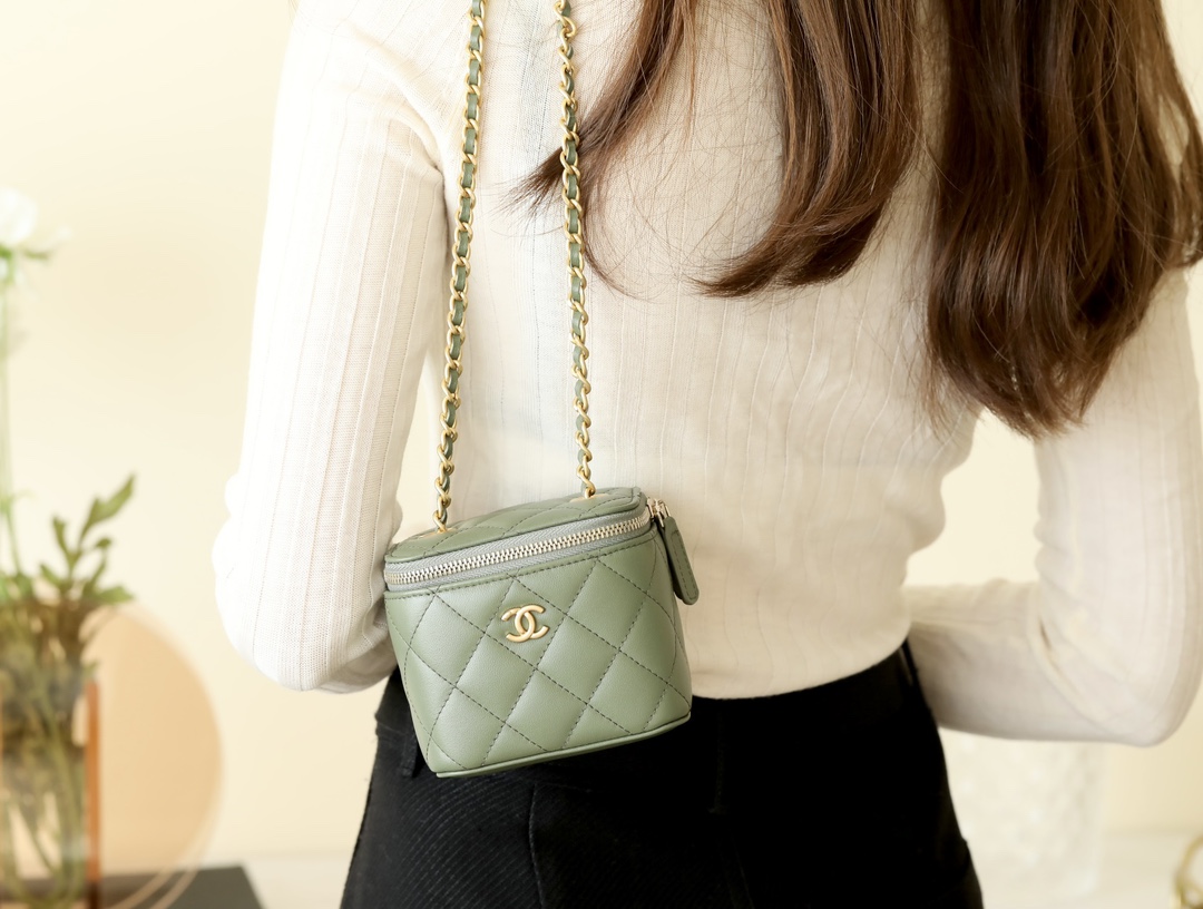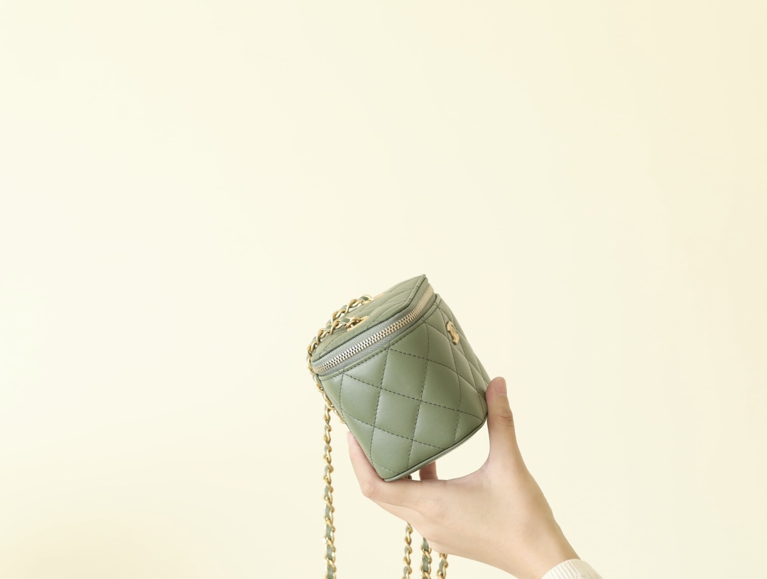• CHANEL Spring-Summer Mini Classic Box With Gold Ball Lambskin olive green