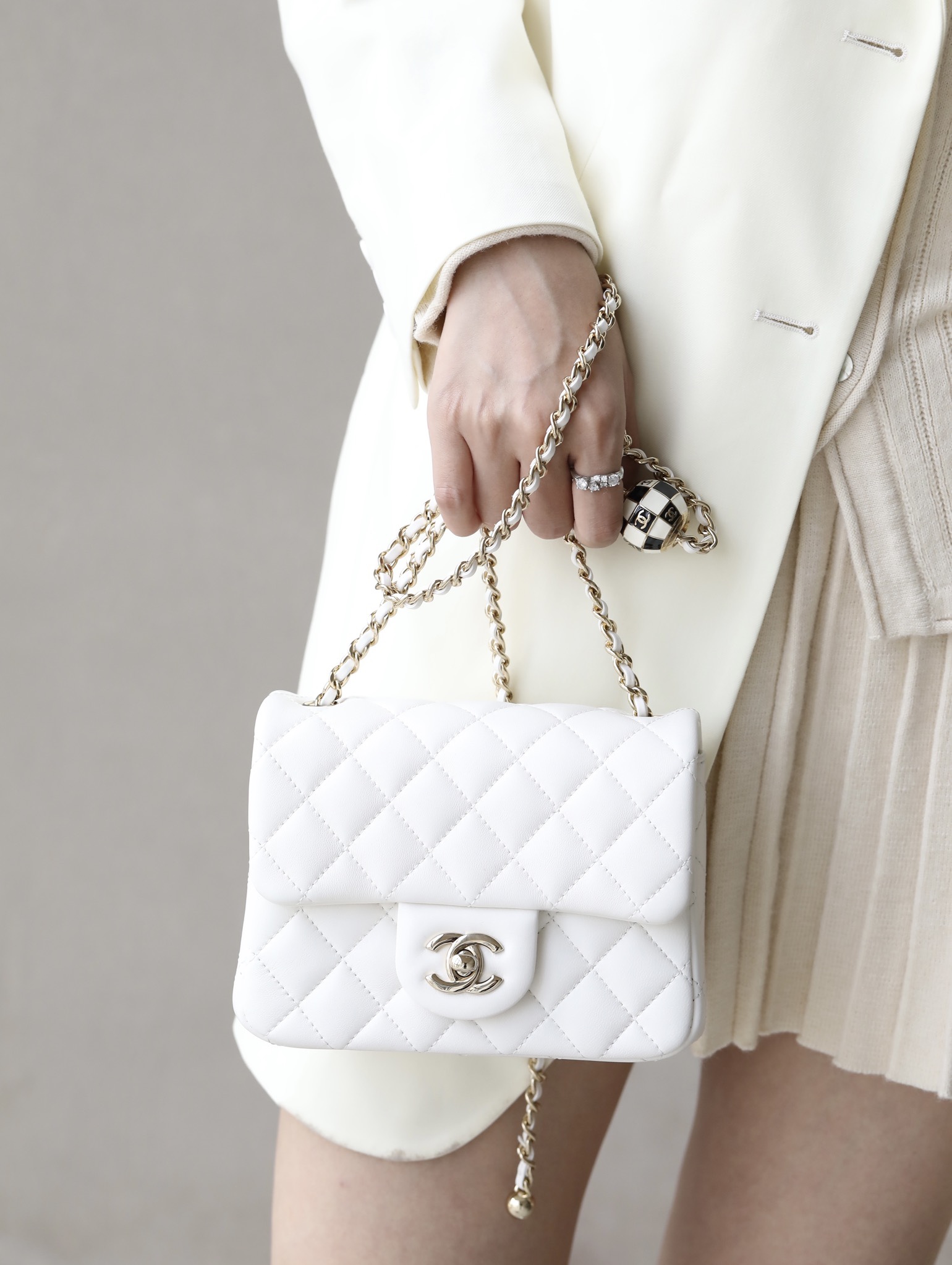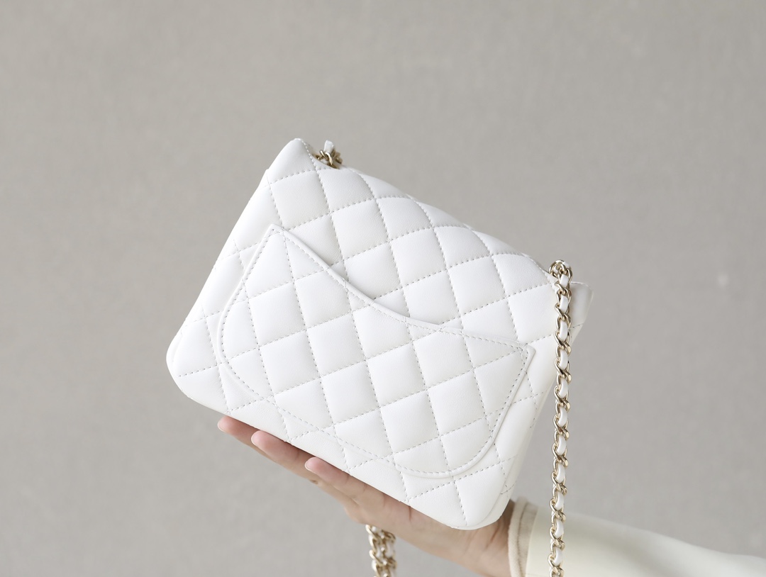 • CHANEL White Mini Flap Bag in Lambskin Enamel Gold Tone Metal