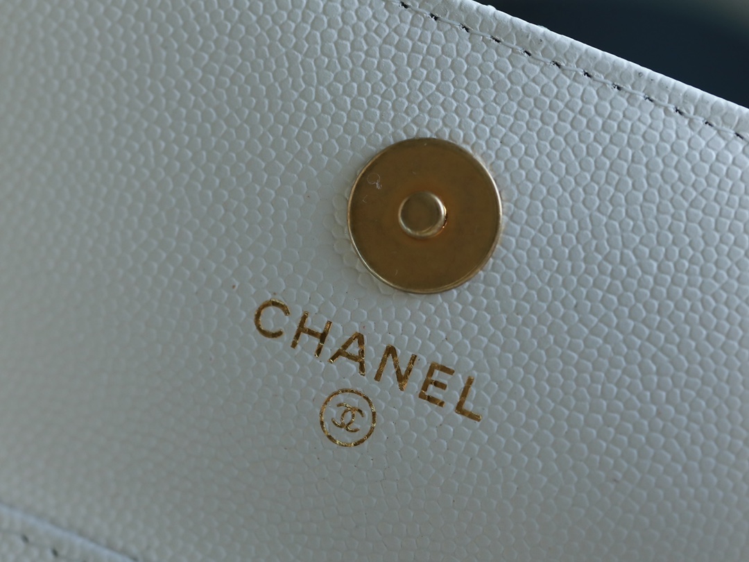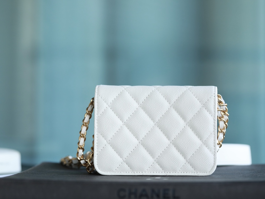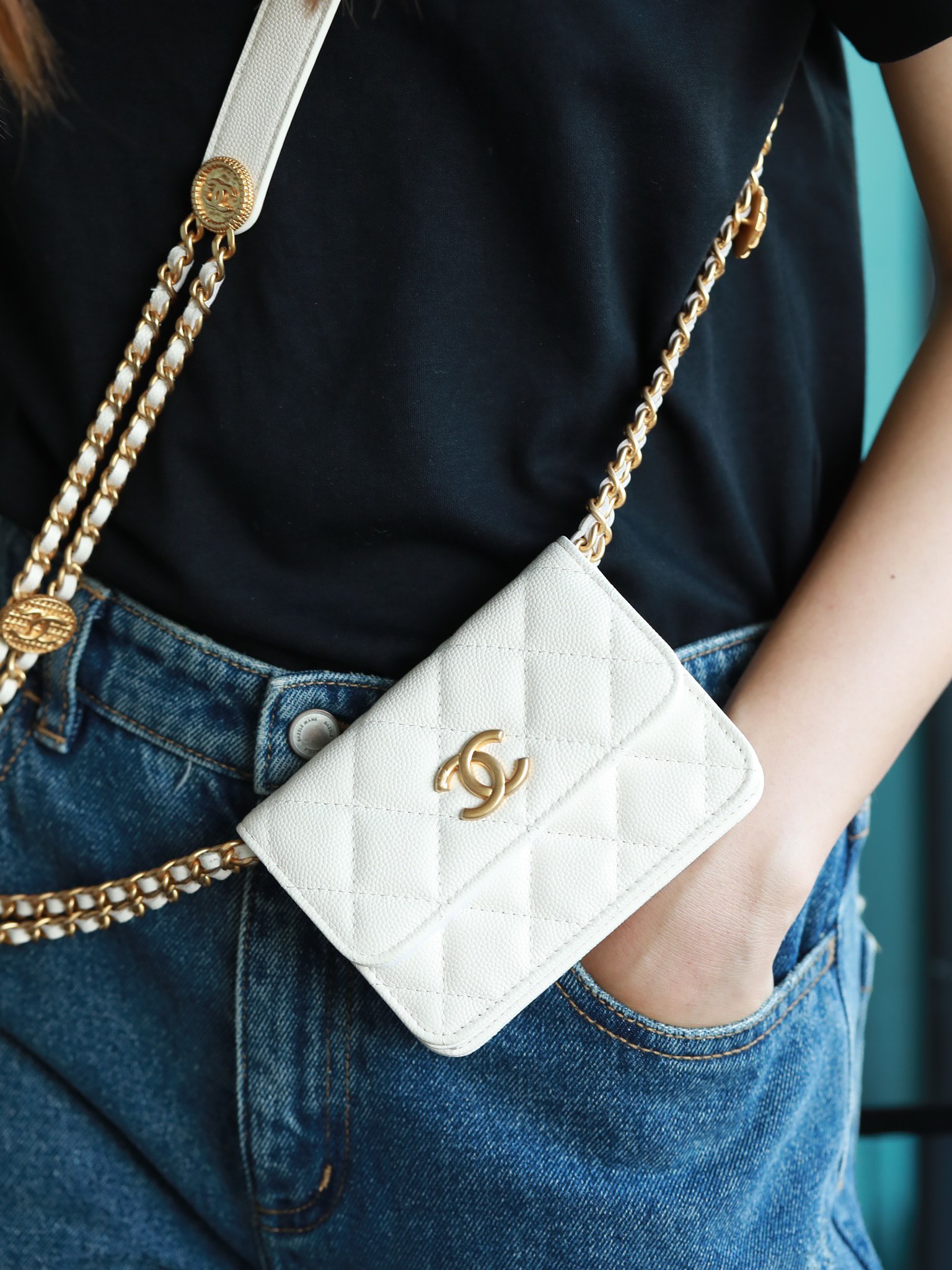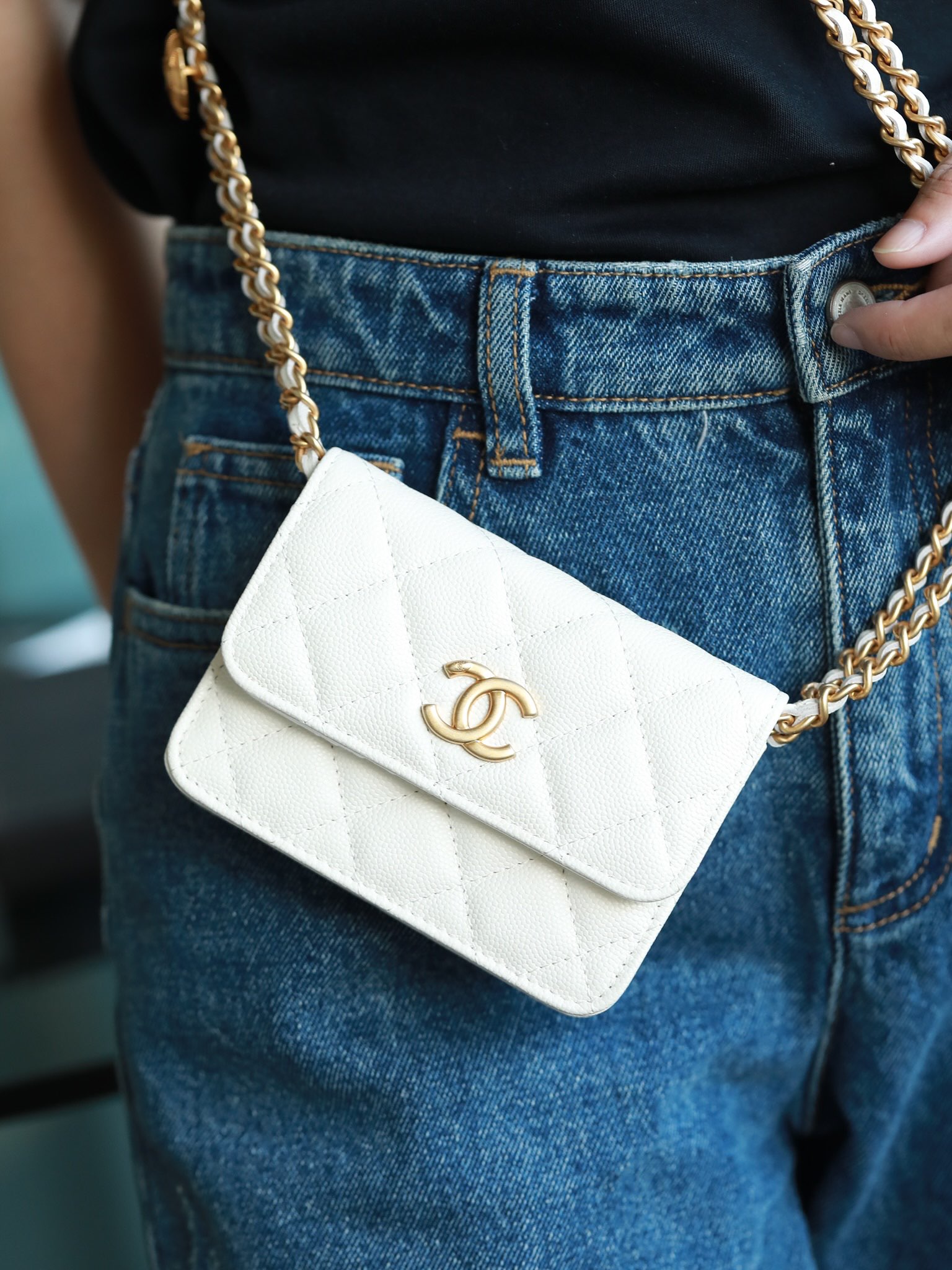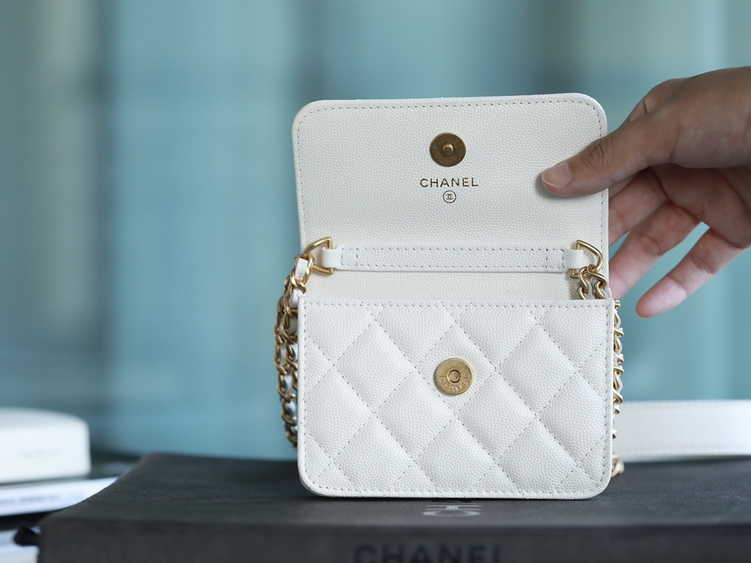 • CHANEL White Quilted Caviar Belt Bag Aged Gold Hardware