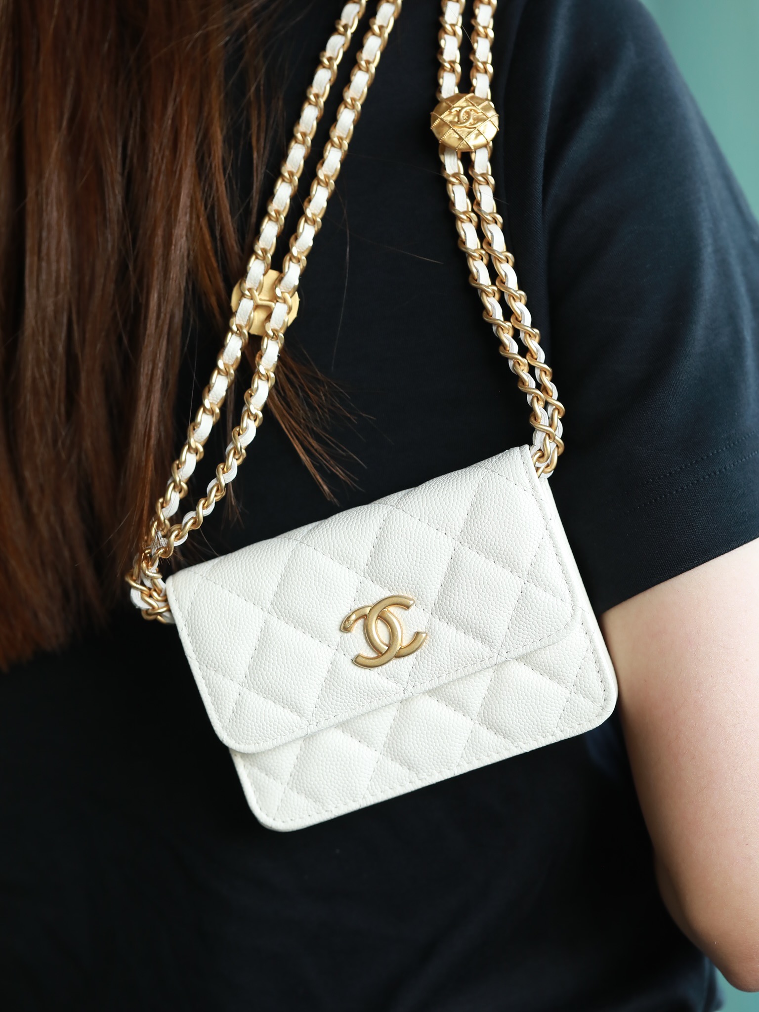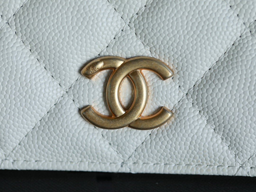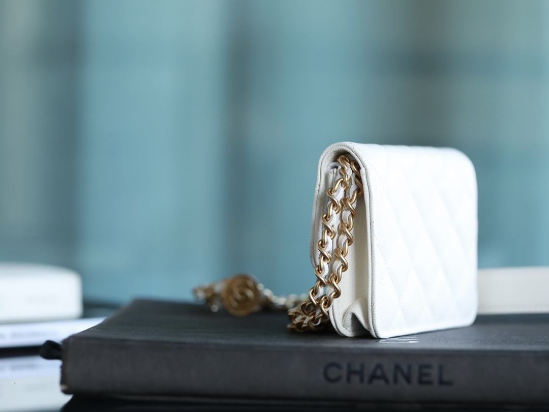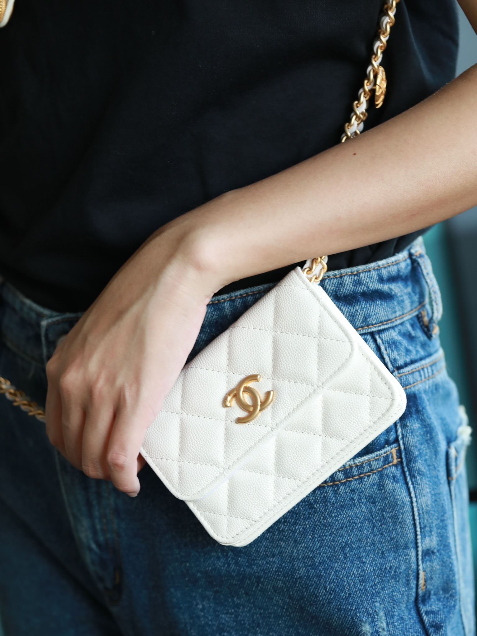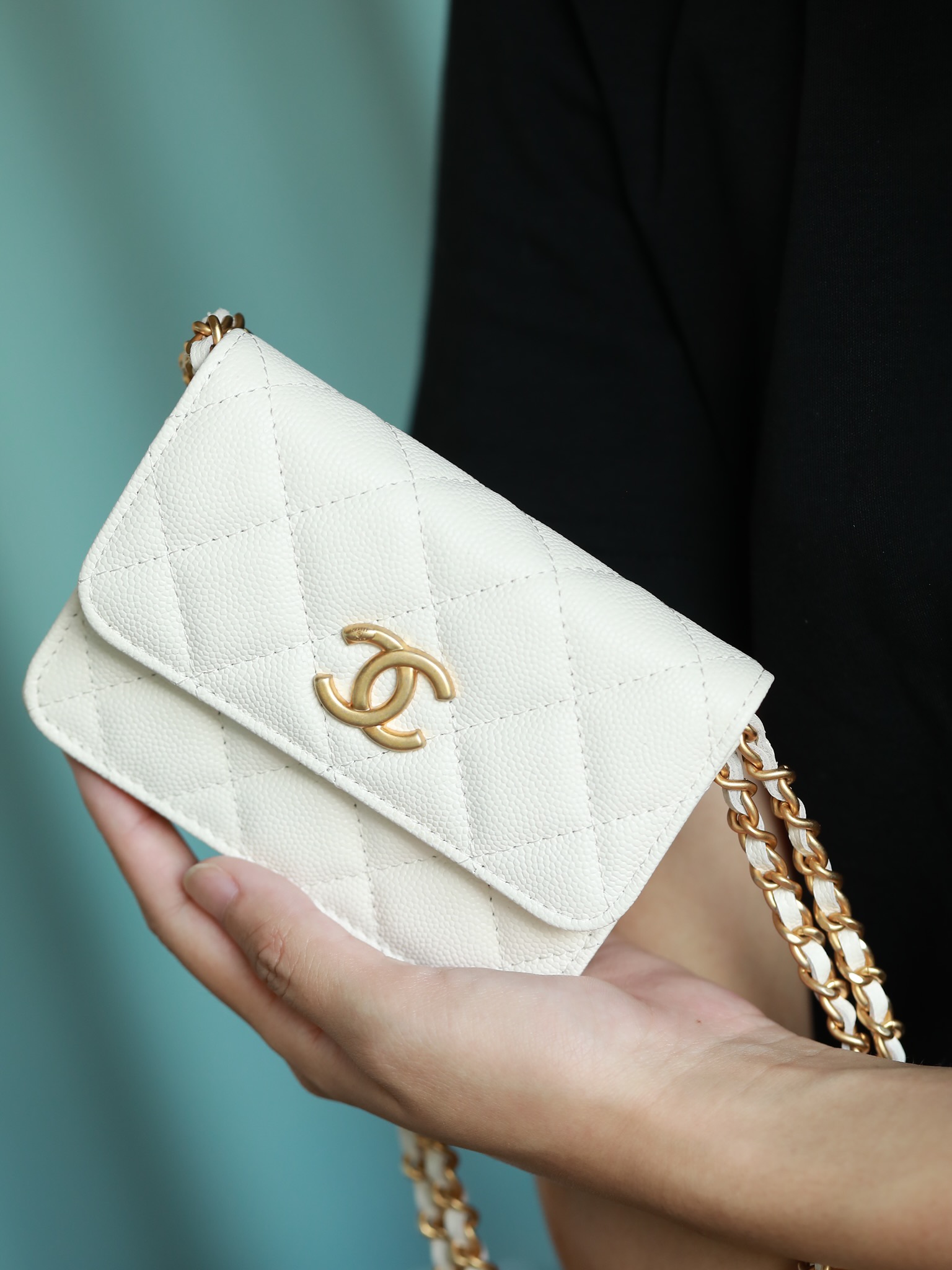 • CHANEL White Quilted Caviar Belt Bag Aged Gold Hardware