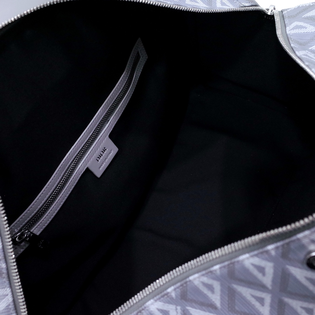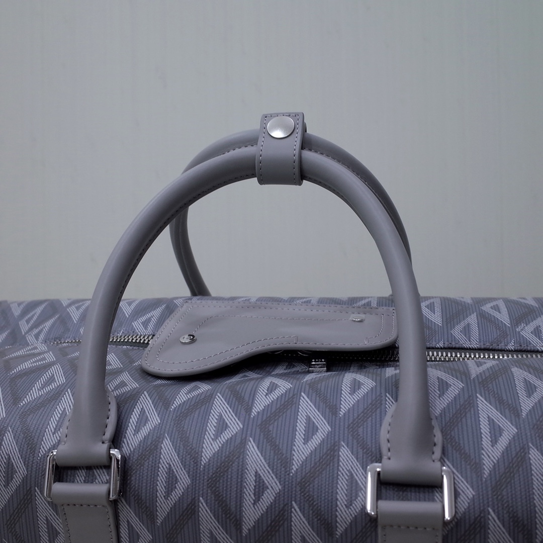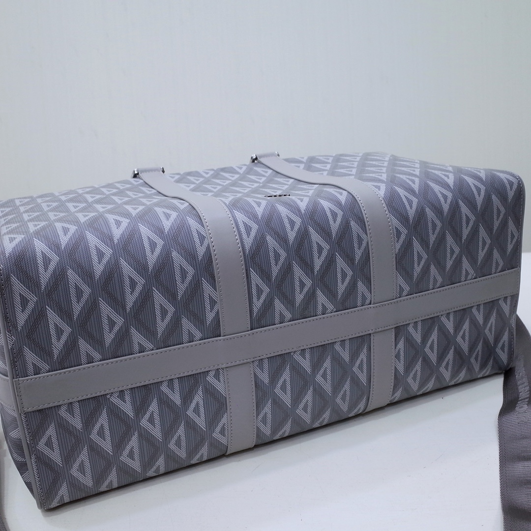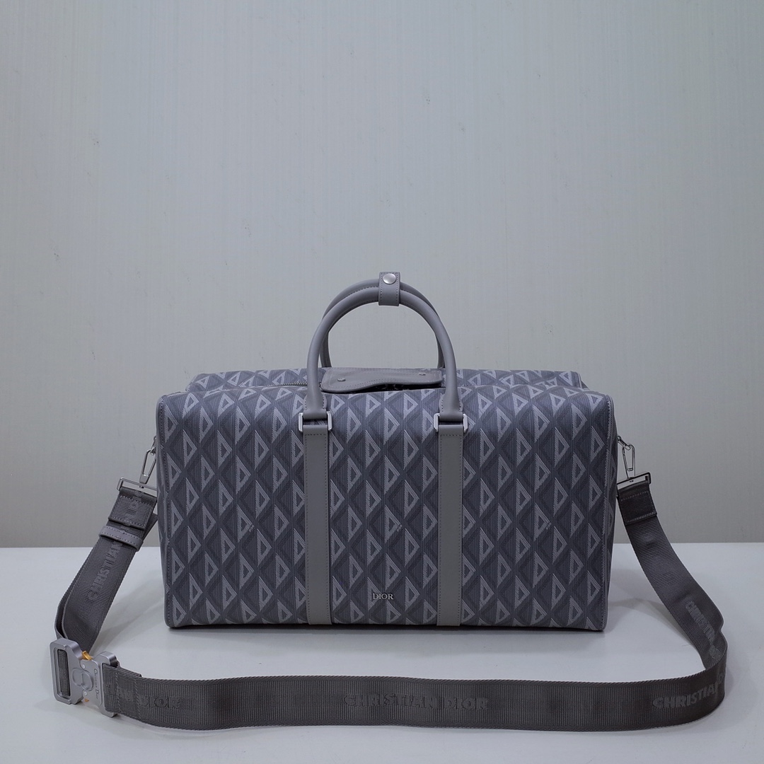The House's newest essential, the Dior Lingot 50 Duffle bag, showcases a practical and elegant design. Crafted in navy blue CD Diamond canvas inspired by the House's archives, the functional and elegant design is enhanced by tonal smooth calfskin details. A zipped compartment with a Saddle flap will hold all the essentials. The folding top handles and adjustable, removable shoulder strap allow the bag to be carried by hand, worn over the shoulder or crossbody.