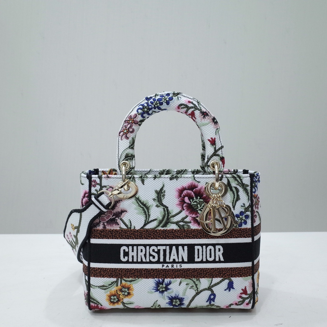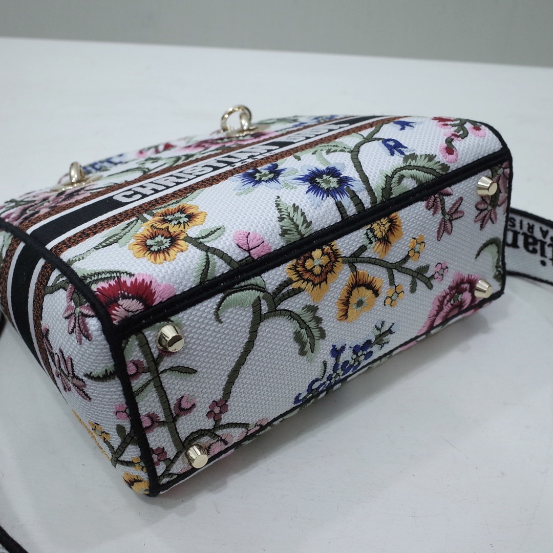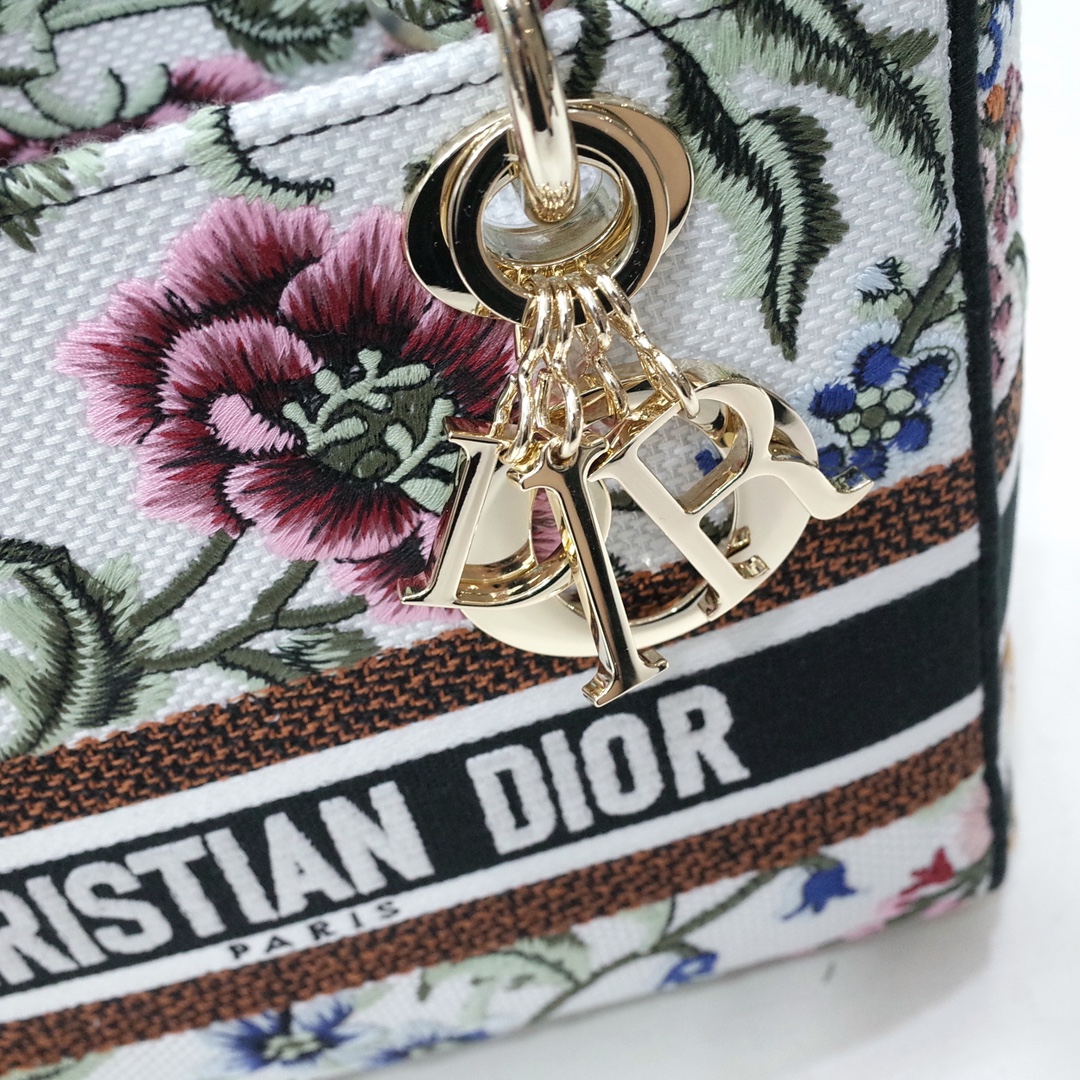 The Lady D-Lite bag combines classic elegance with House modernity. The style is fully embroidered with the white multicolor Dior Petites Fleurs motif, a vibrant homage to Mr. Dior's passion for florals. A Christian Dior Paris signature adorns the front, while D.I.O.R. charms in pale gold-finish metal further enhance and highlight the silhouette. Featuring a wide embroidered shoulder strap, the medium Lady D-Lite bag can be carried by hand, worn over the shoulder or crossbody.