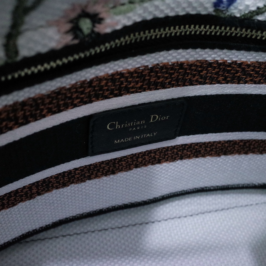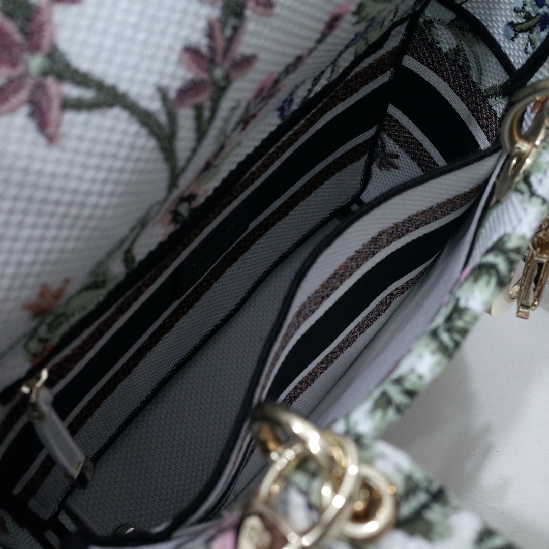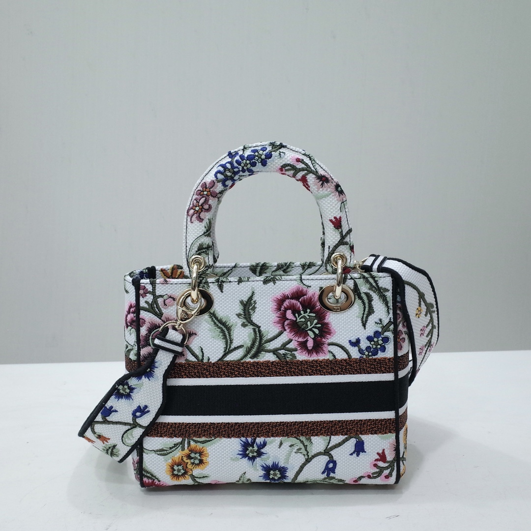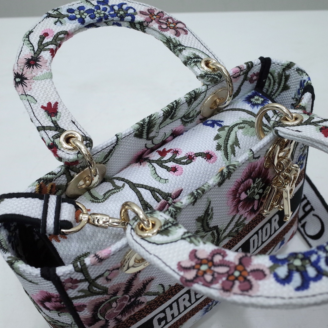 The Lady D-Lite bag combines classic elegance with House modernity. The style is fully embroidered with the white multicolor Dior Petites Fleurs motif, a vibrant homage to Mr. Dior's passion for florals. A Christian Dior Paris signature adorns the front, while D.I.O.R. charms in pale gold-finish metal further enhance and highlight the silhouette. Featuring a wide embroidered shoulder strap, the medium Lady D-Lite bag can be carried by hand, worn over the shoulder or crossbody.