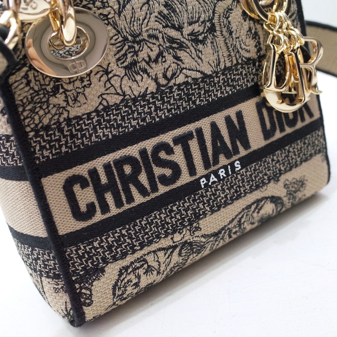 The Lady D-Lite bag combines classic elegance with House modernity. The style is fully embroidered with the hallmark brown Toile de Jouy motif and is accented by the 'CHRISTIAN DIOR PARIS' signature on the front, while pale gold-finish metal 'D.I.O.R.' charms embellish and illuminate the silhouette. Equipped with a wide, reversible and removable embroidered shoulder strap, the miniature Lady D-Lite bag can be carried by hand or worn crossbody.