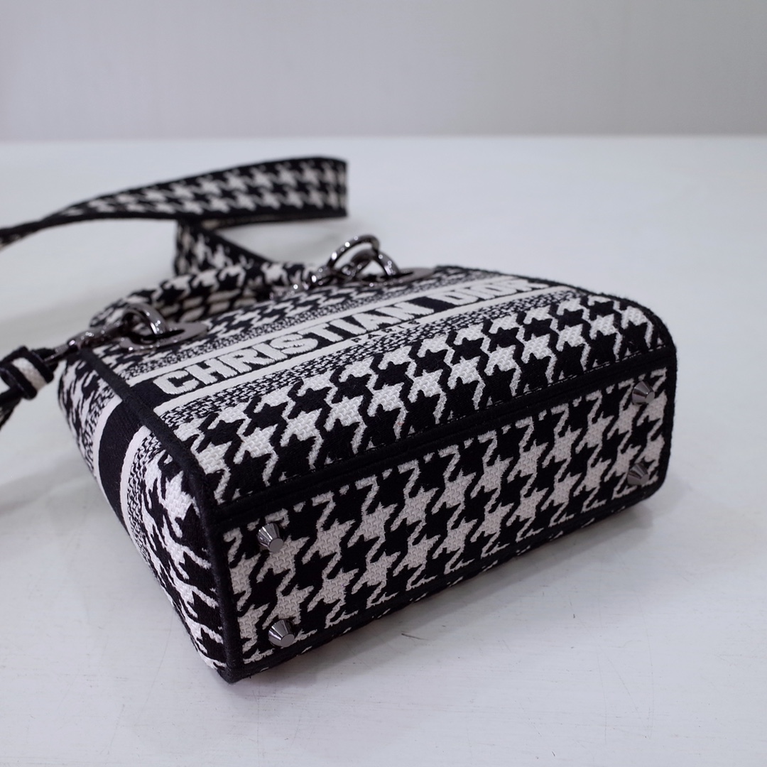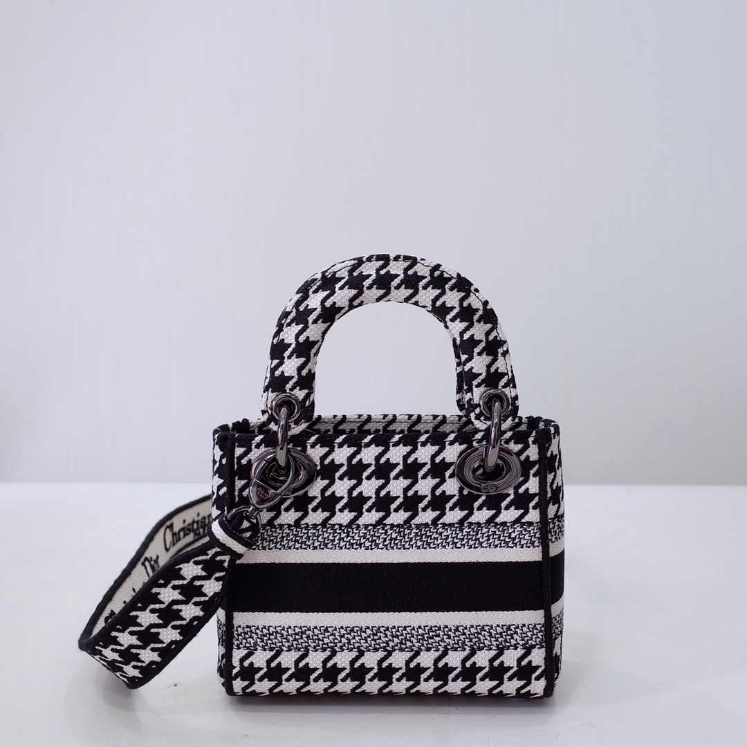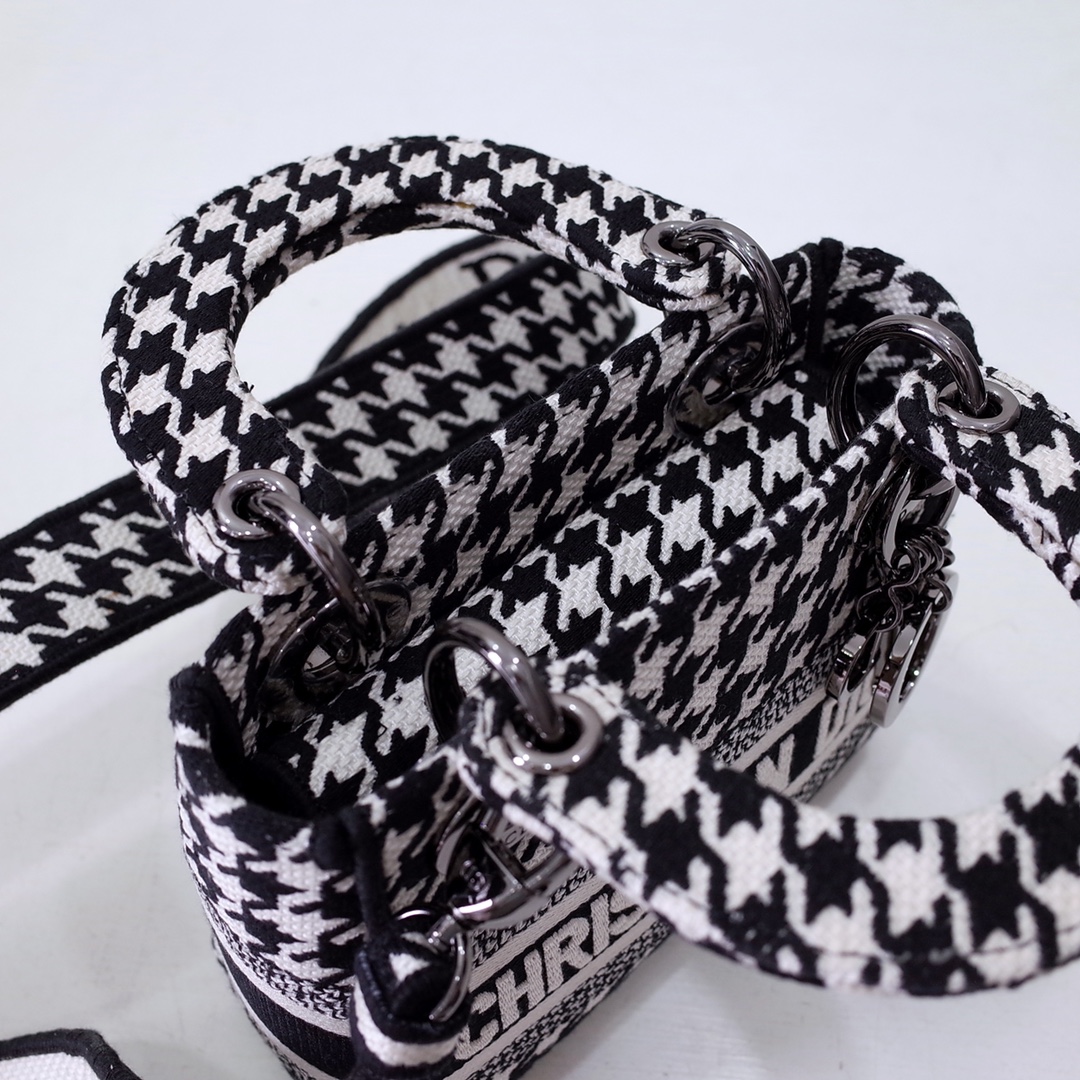 Mini Lady D-Lite Bag White and Black Houndstooth Embroidery