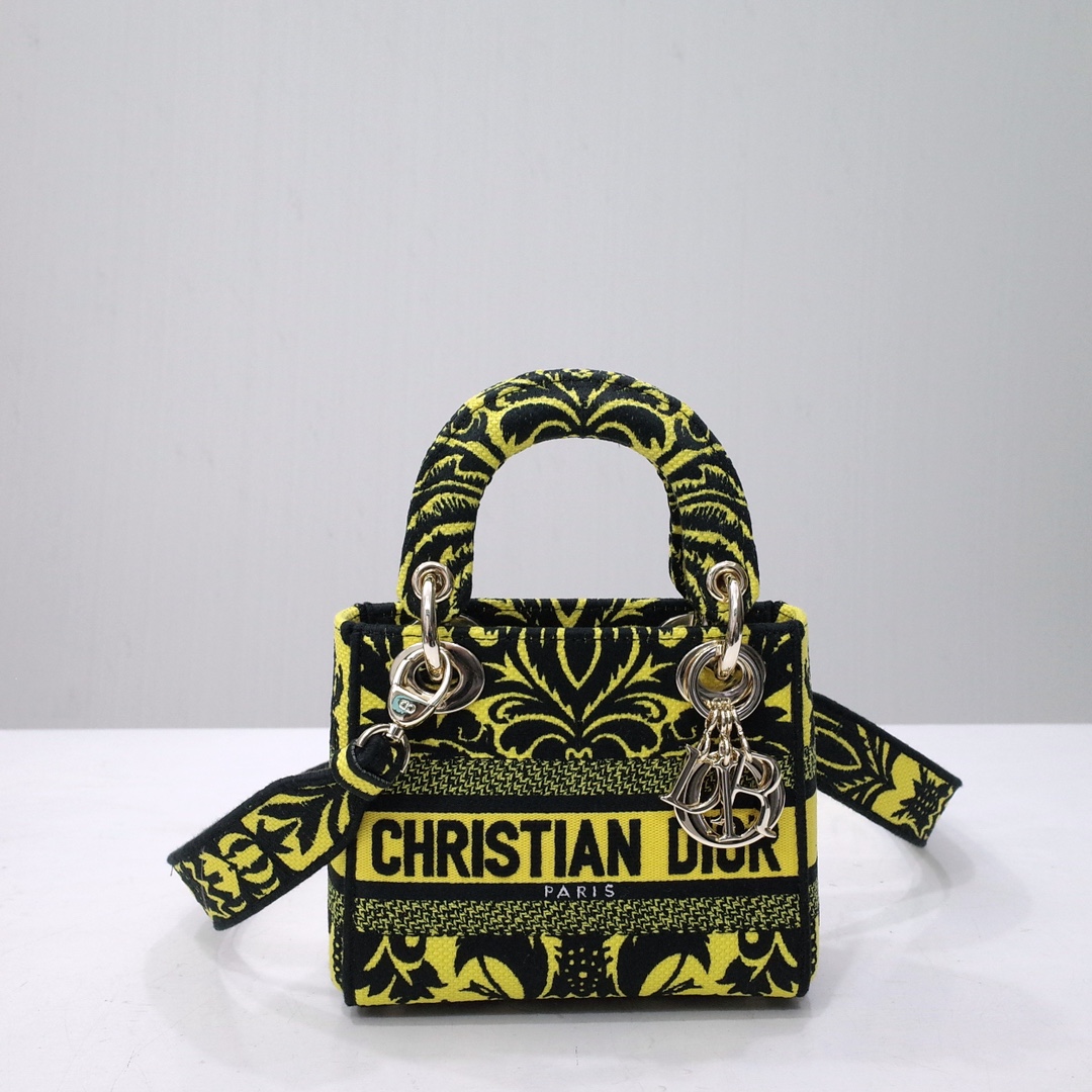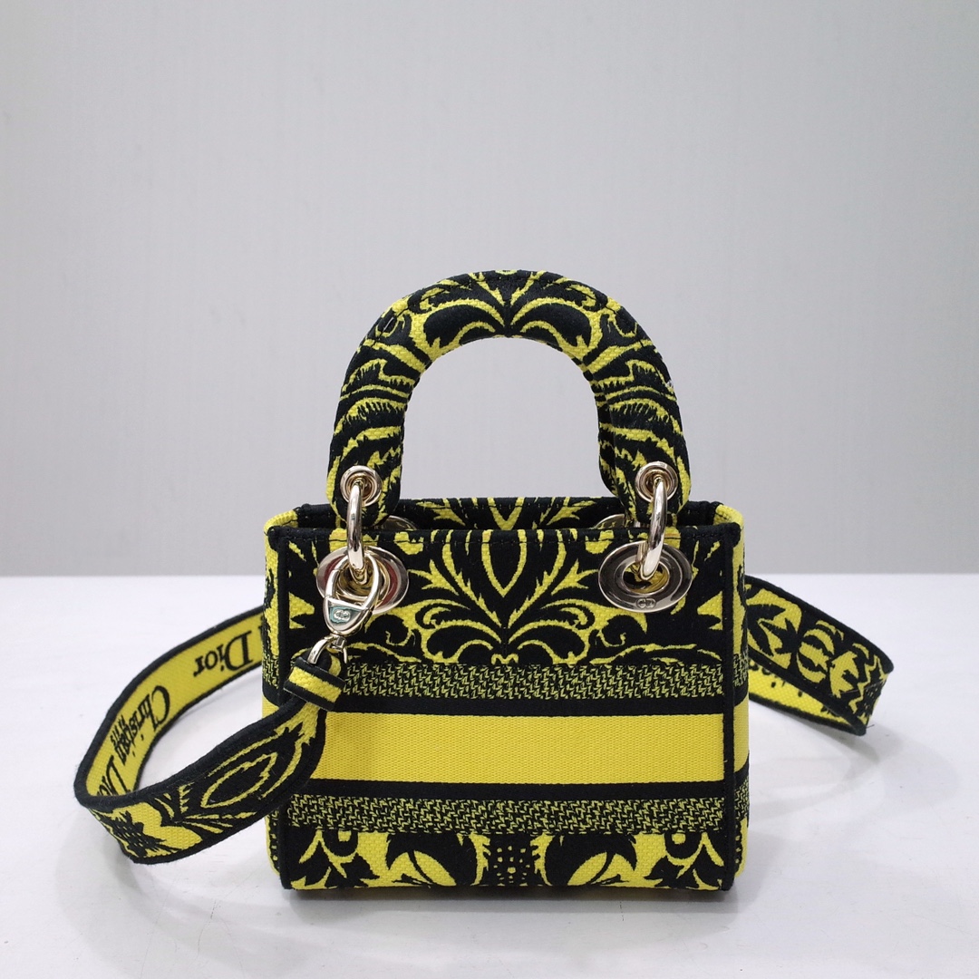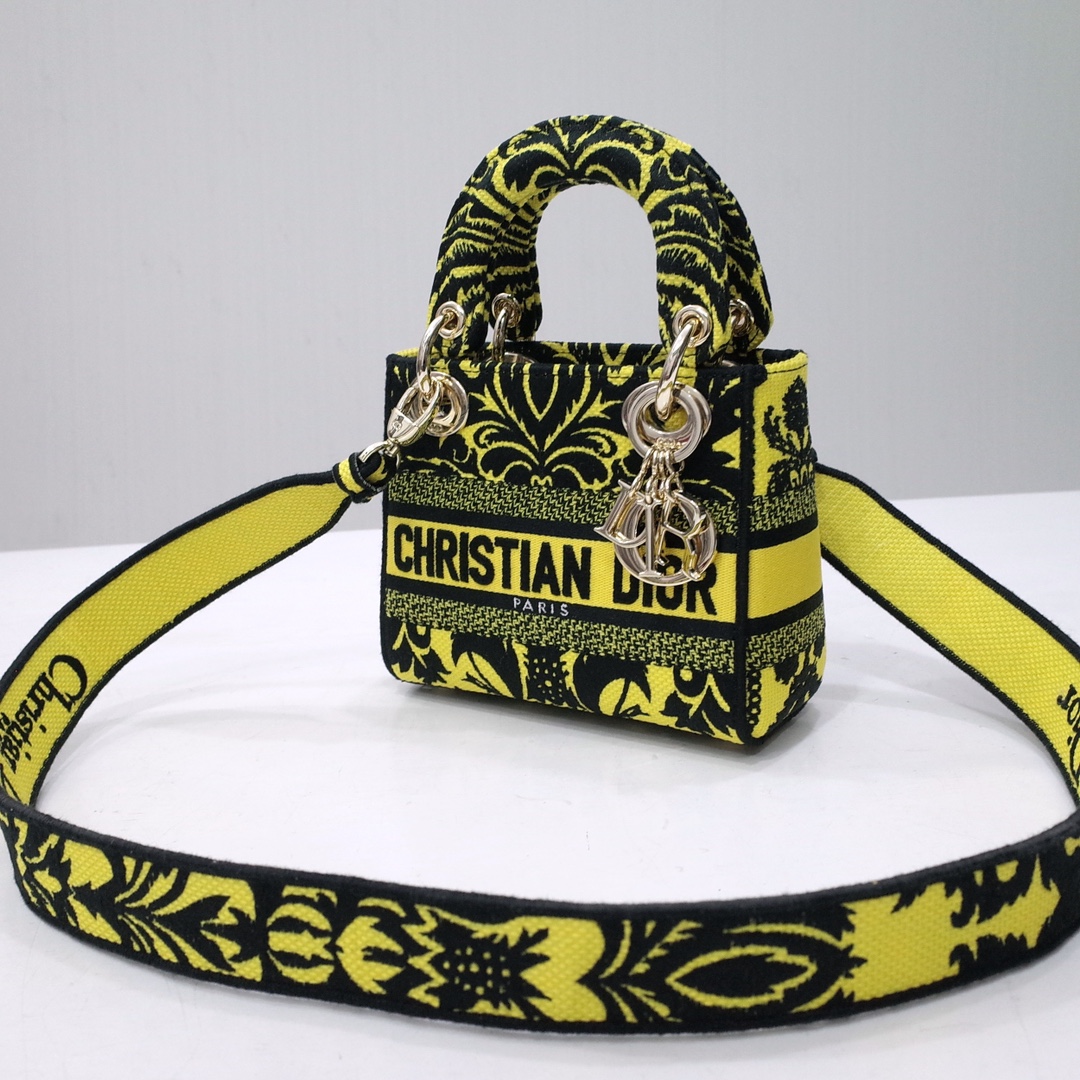 The Lady D-Lite bag combines classic elegance with House modernity. The style is fully embroidered with a yellow multicolor Ornamental motif inspired by Andalusian baroque in a graphic spirit. The front features a 'CHRISTIAN DIOR PARIS' signature while the 'D.I.O.R.' charms in pale gold-finish metal further enhance the silhouette. Equipped with a wide, reversible and removable embroidered shoulder strap, the miniature Lady D-Lite bag can be carried by hand or worn crossbody.